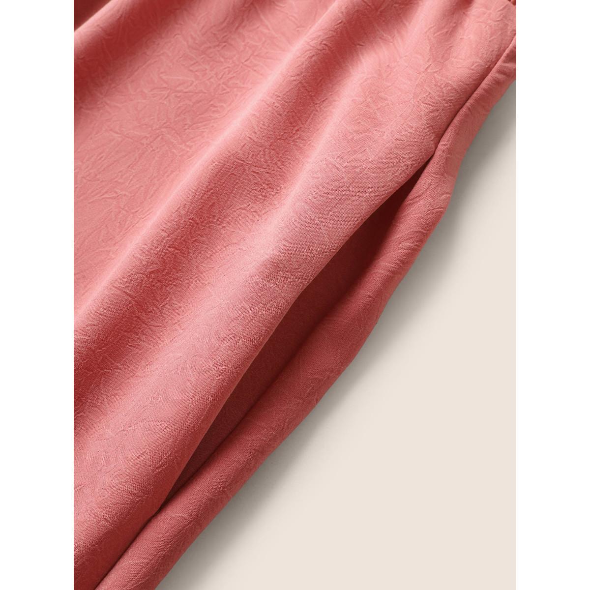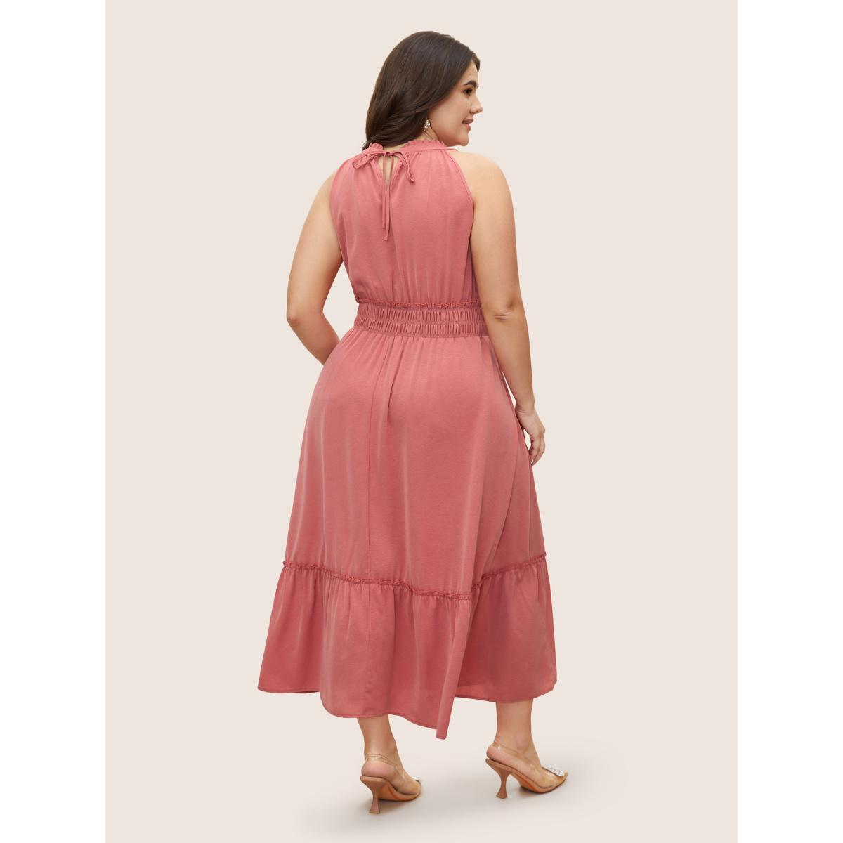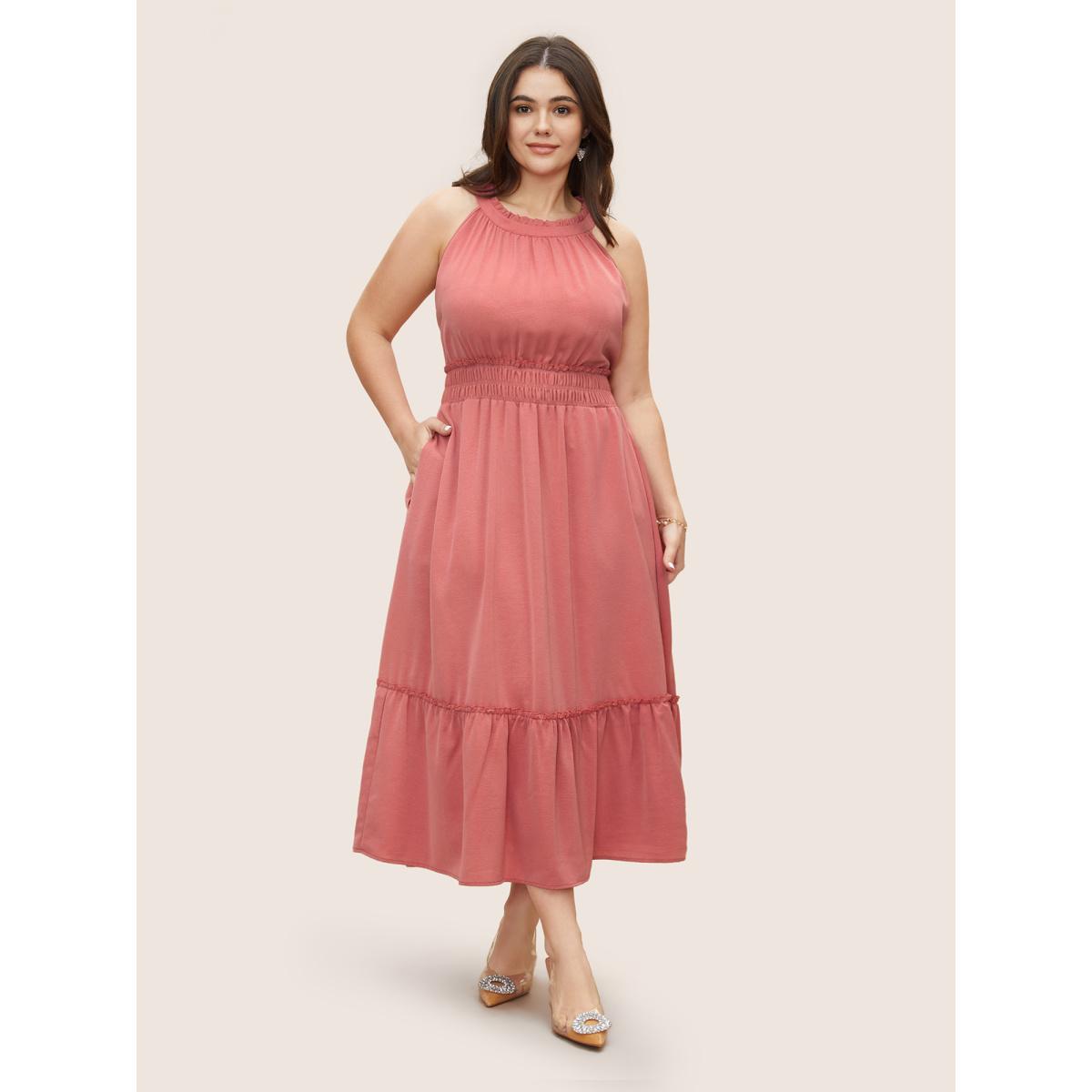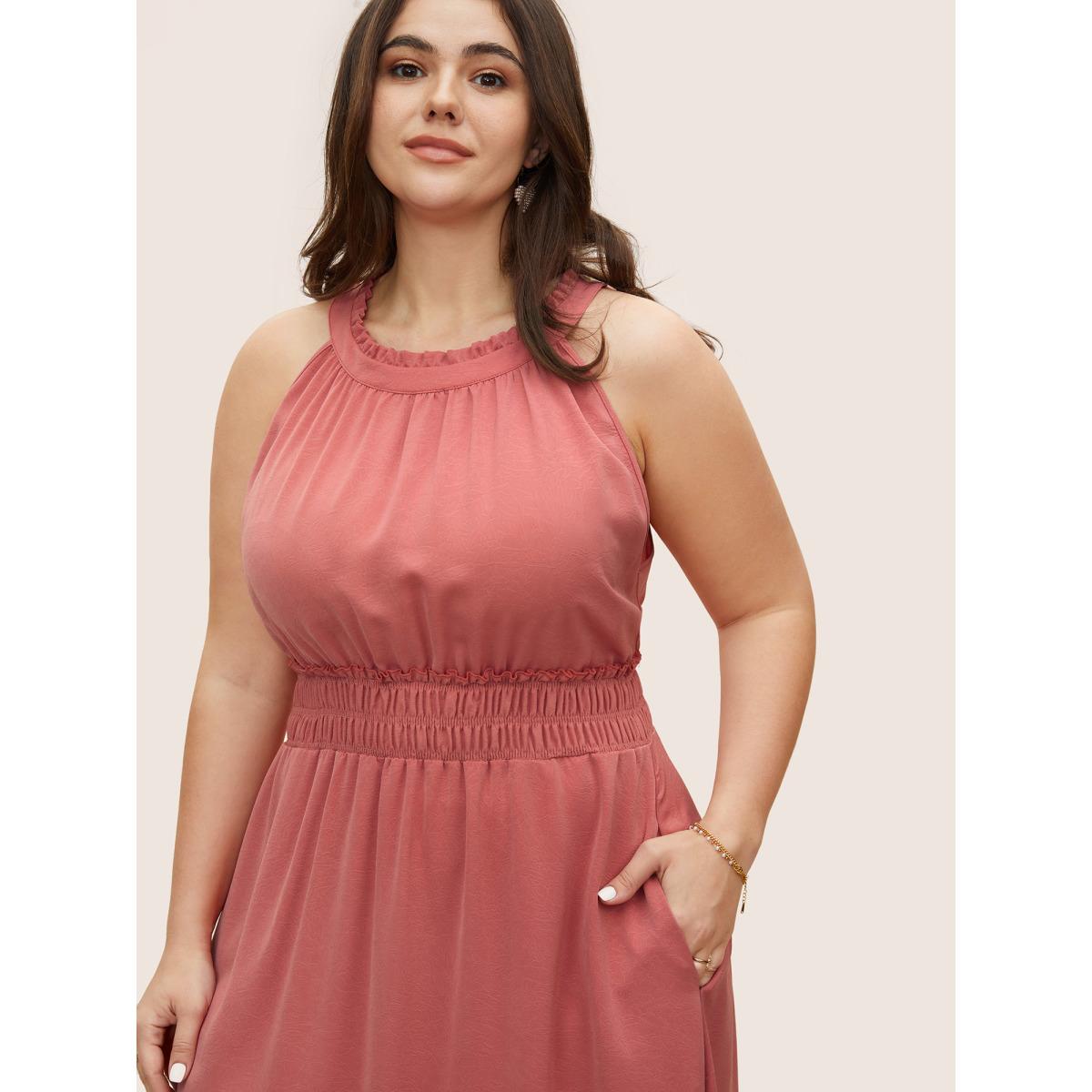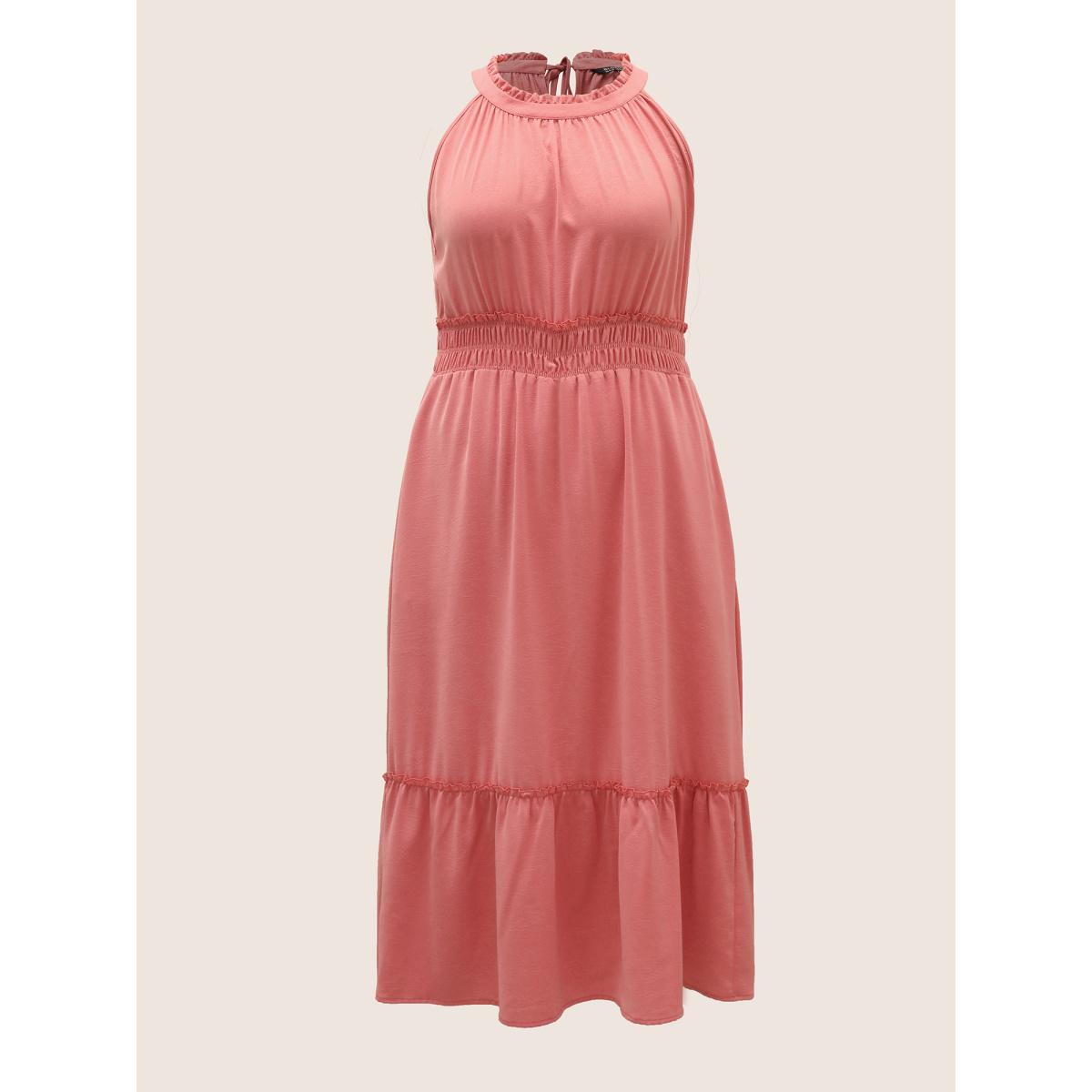 Plus Size Halter Neck Shirred Frill Trim Gathered Dress Watermelon Women Formal Gathered Halter neck Sleeveless Curvy Midi Dress BloomChic 10/M