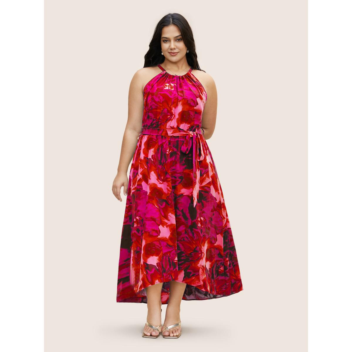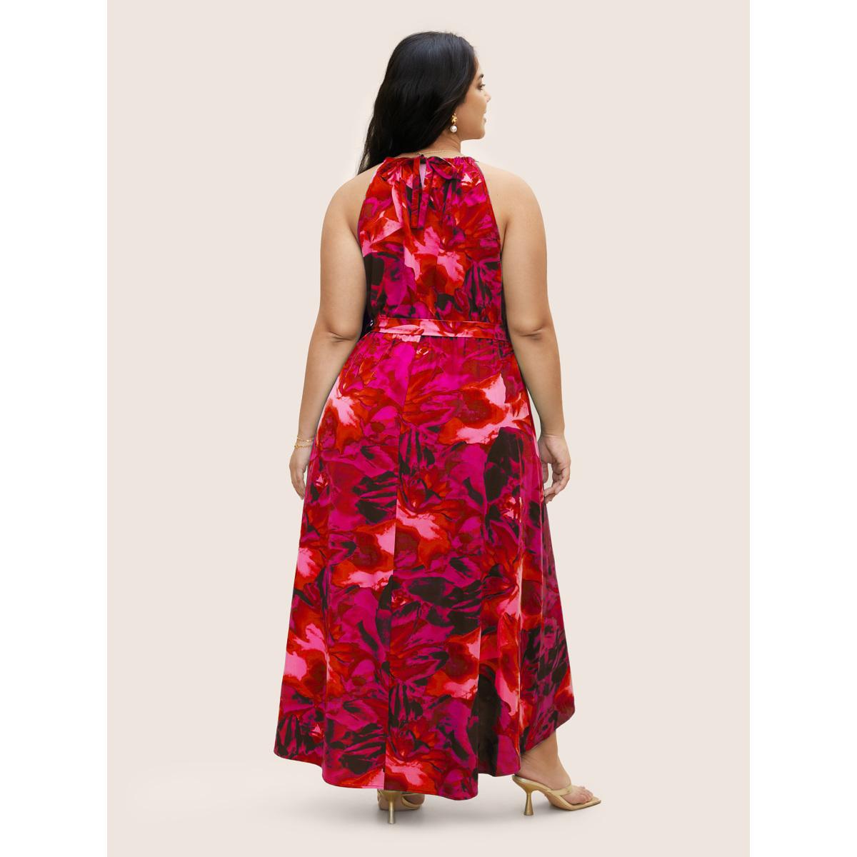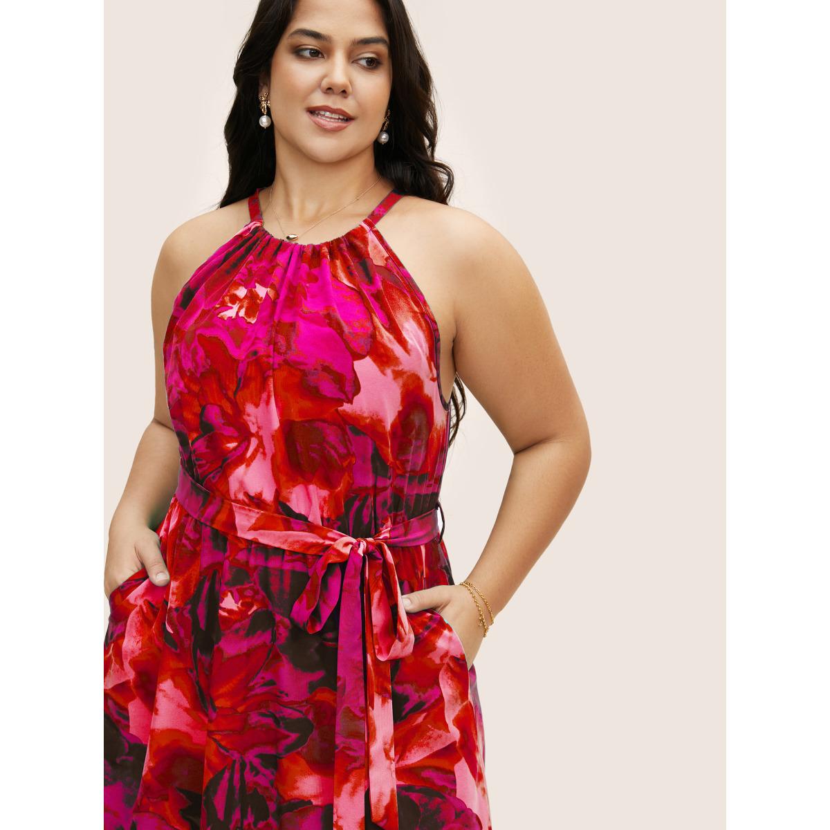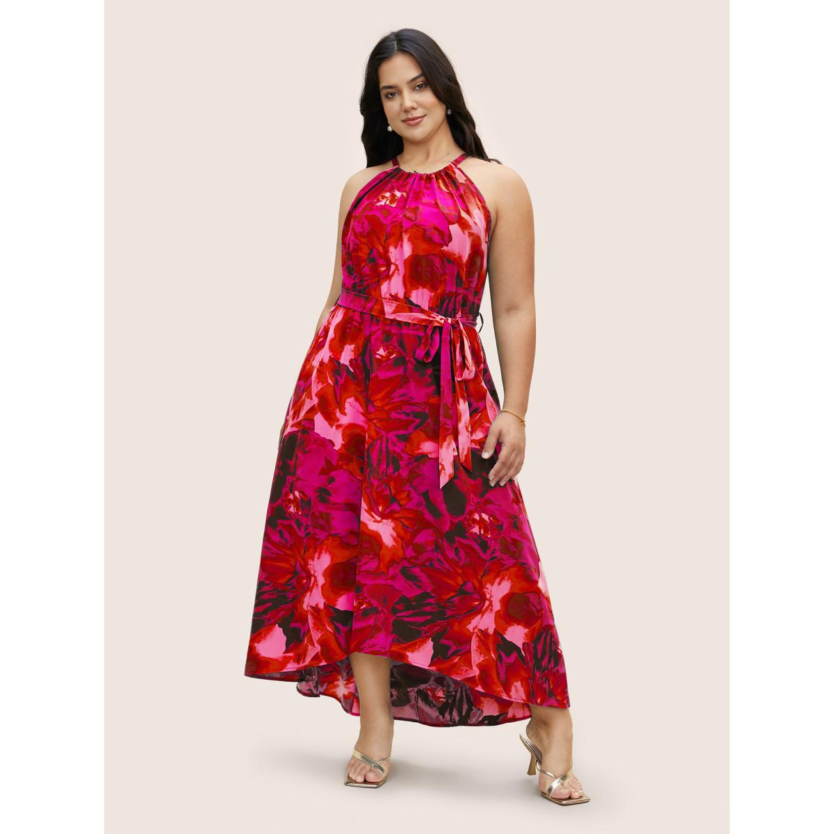 Plus Size Halter Watercolor Floral Belted Dress Crimson Women Elegant Gathered Halter neck Sleeveless Curvy BloomChic 30/6X Product Image