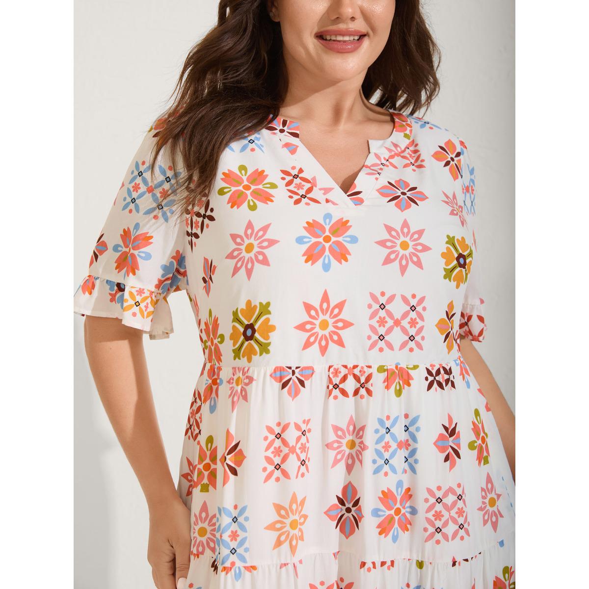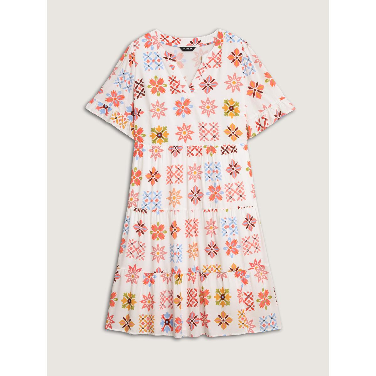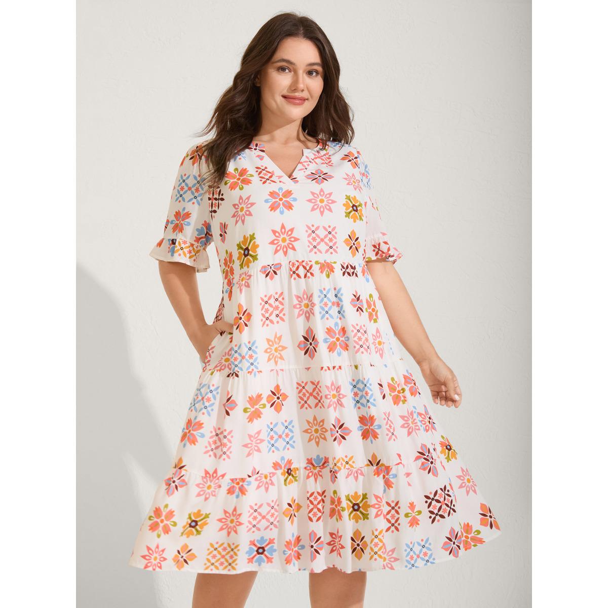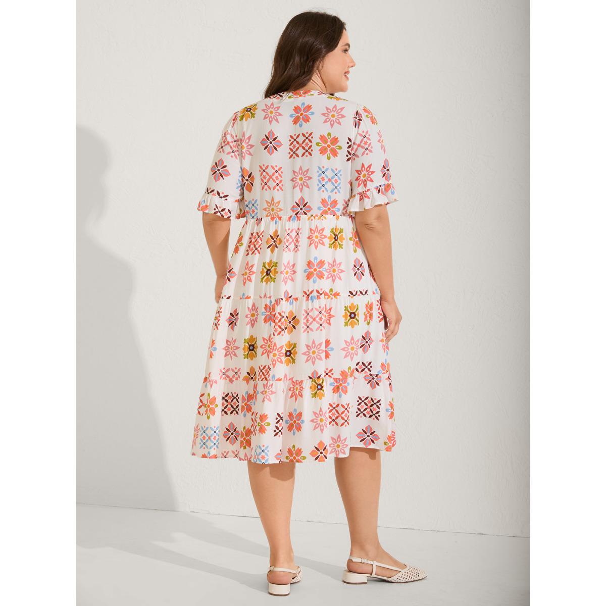 Plus Size Handmade Block Print Tiered Midi Dress OrangeRed Women Boho Flat collar with V-notch Short sleeve Curvy BloomChic 12/L