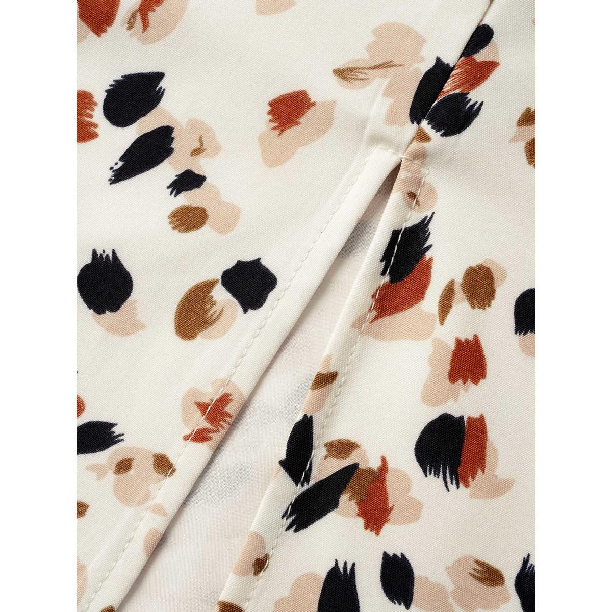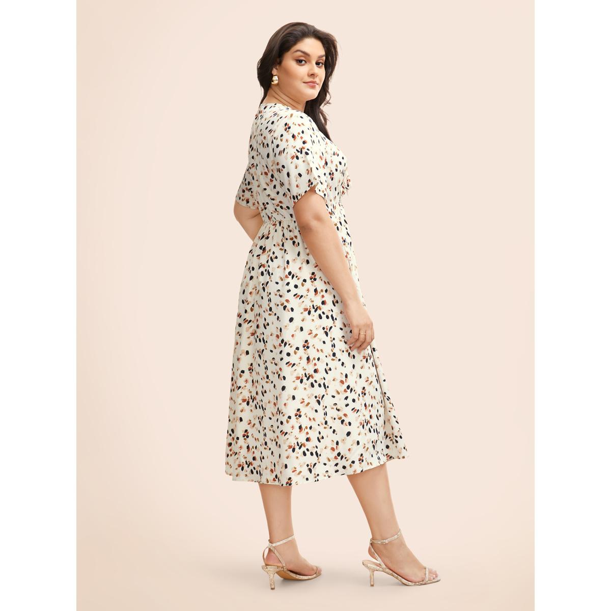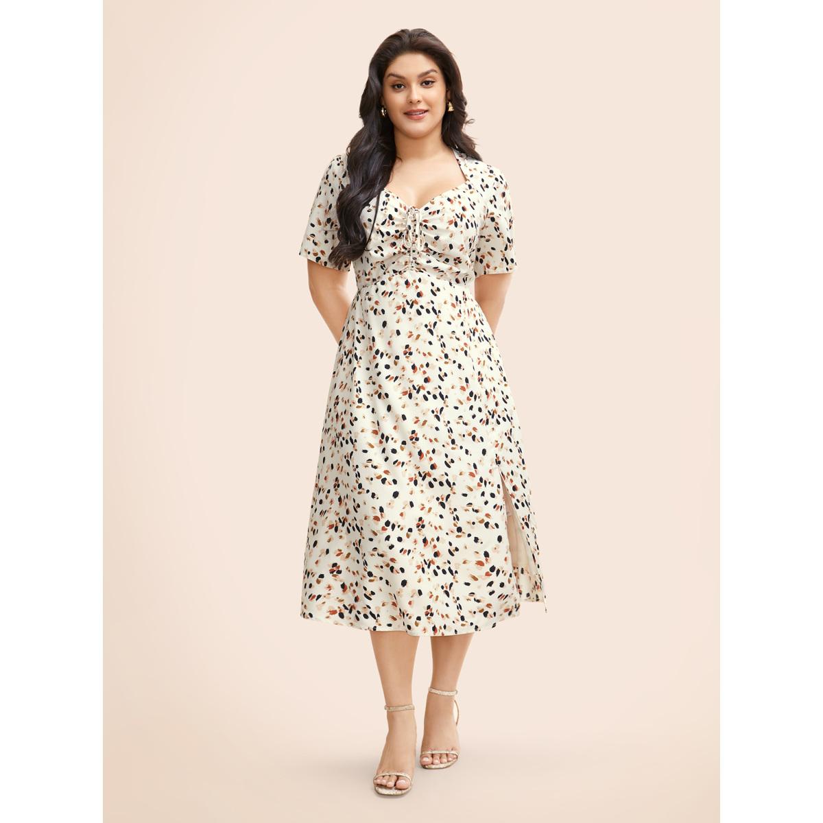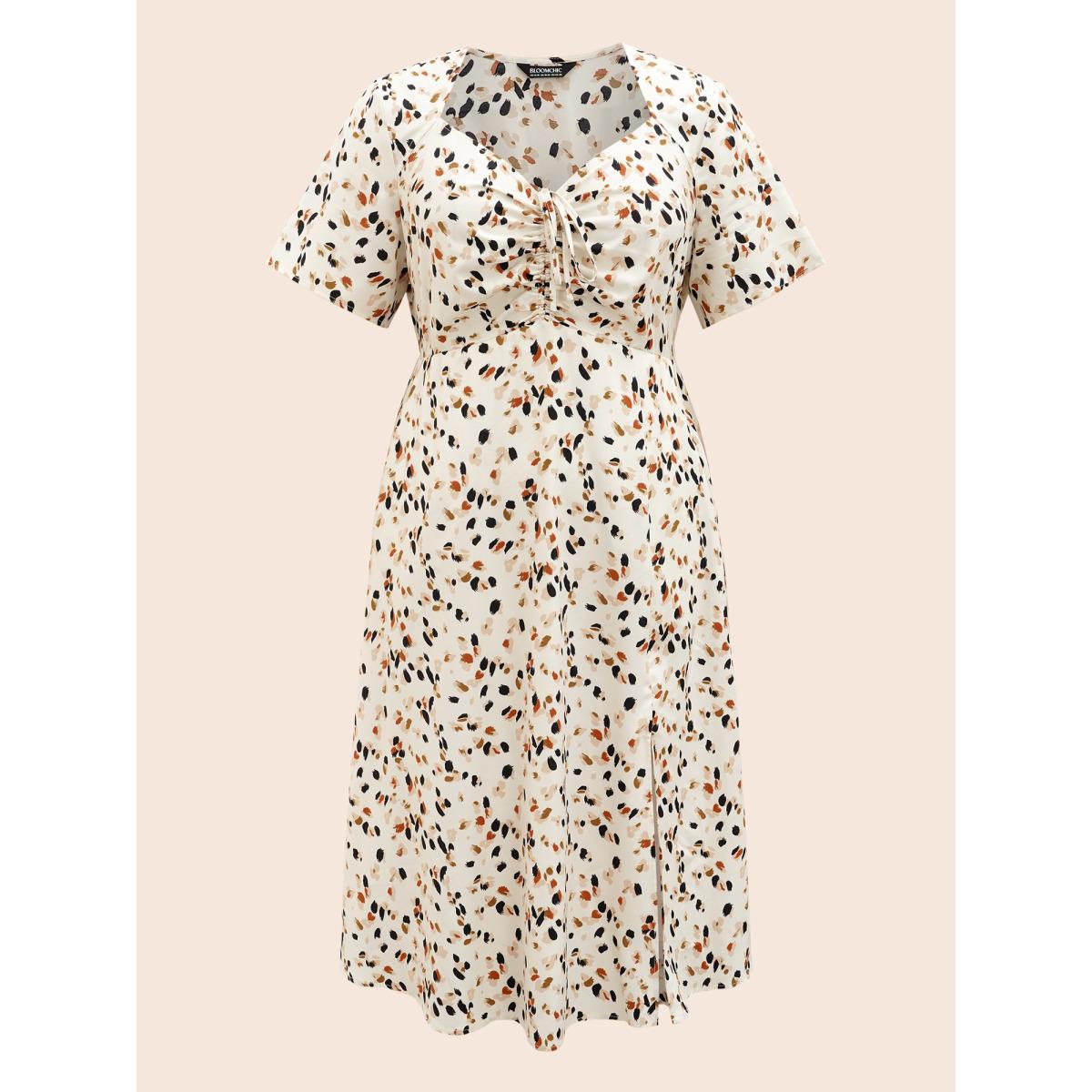 Plus Size Heart Neckline Allover Print Drawstring Dress Apricot Women Elegant Gathered Heart neckline Short sleeve Curvy BloomChic 14-16/1X