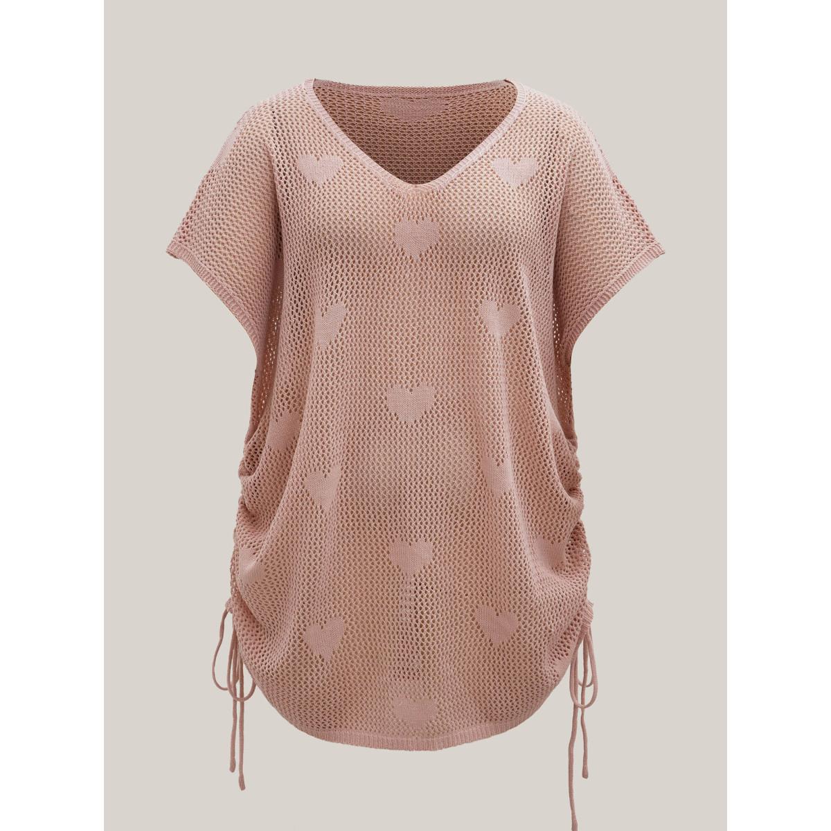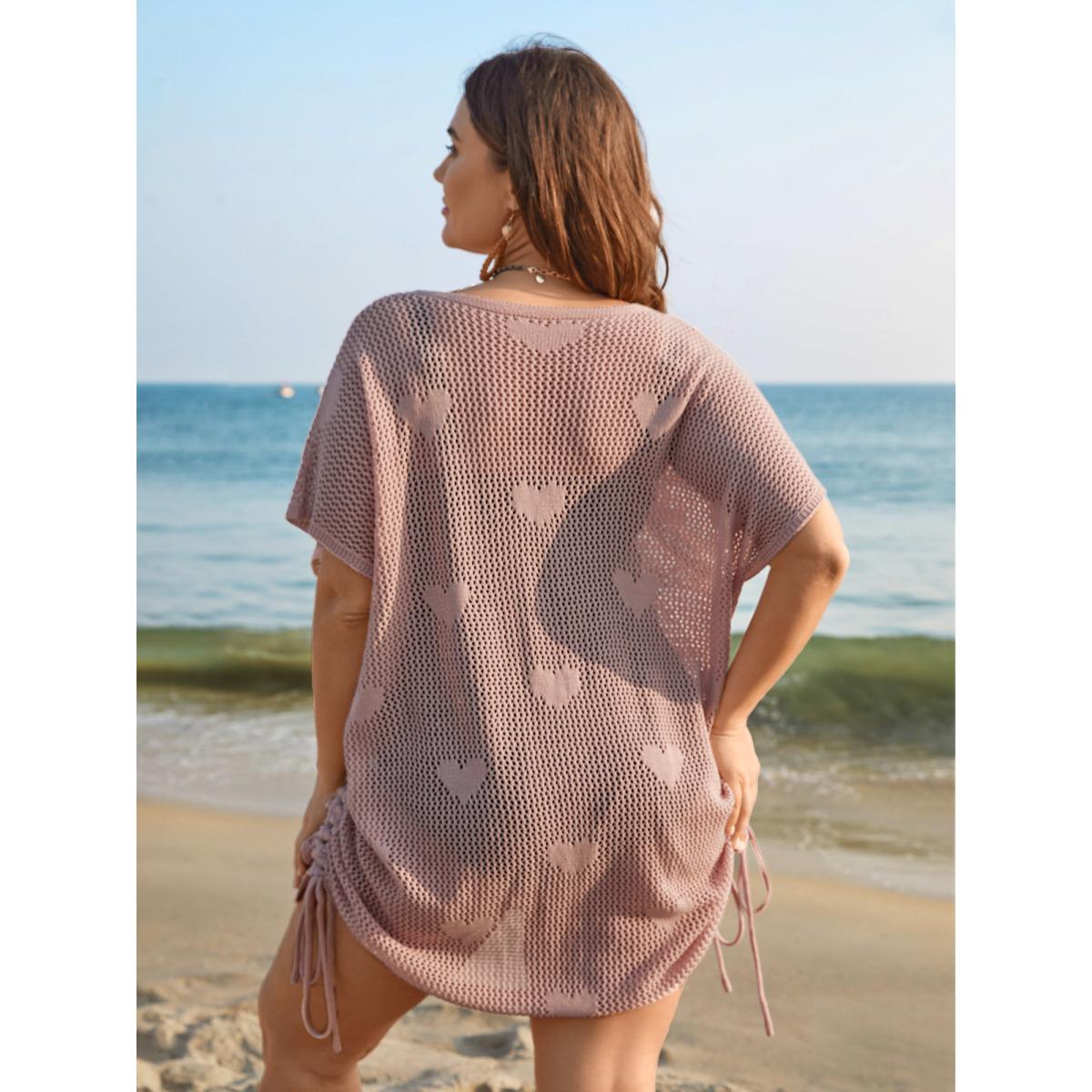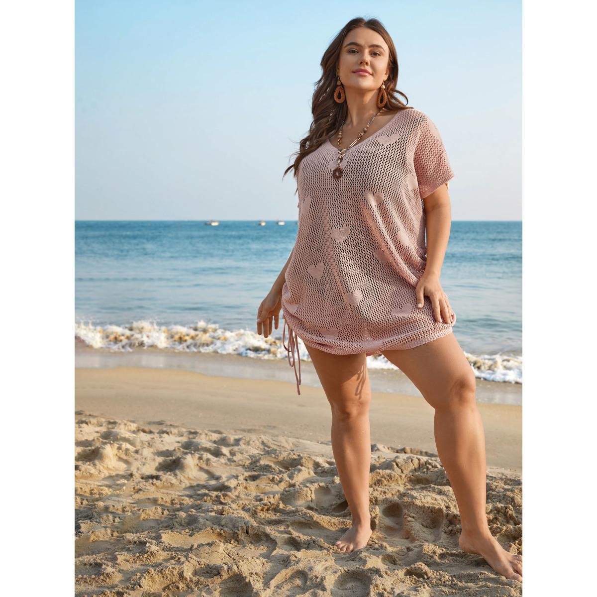 Plus Size Heart Pattern Drawstring Textured Sheer Swim Cover-Up Women's Swimwear Nudepink Beach Loose Texture Curve Swim Cover Ups BloomChic 18-20/2X