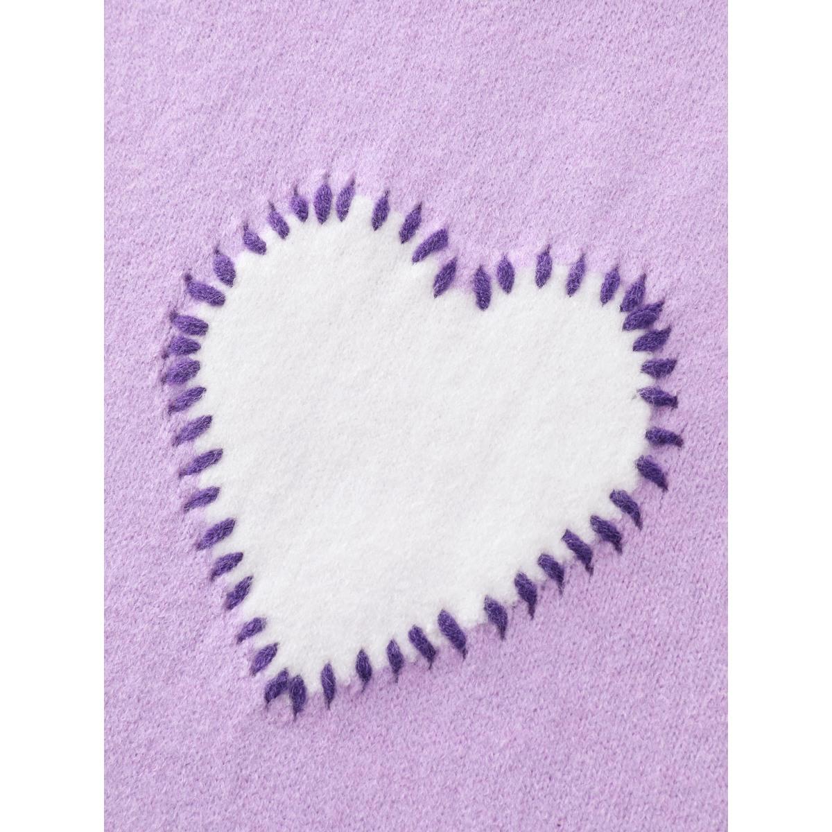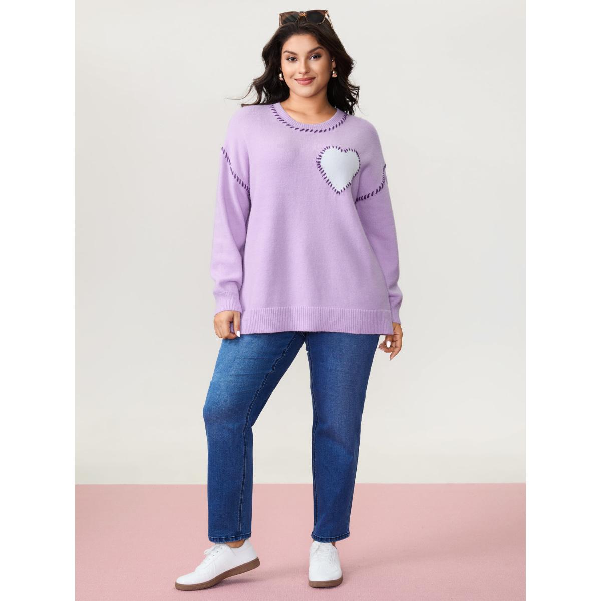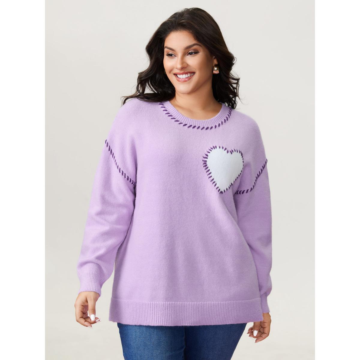 Plus Size Heart Pattern Jacquard Color Contrast Stitch Pullover Lilac Women Playful Loose Long Sleeve Round Neck Casual Pullovers BloomChic 10/M