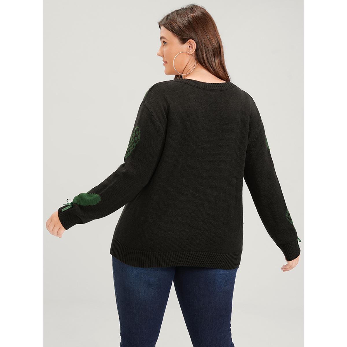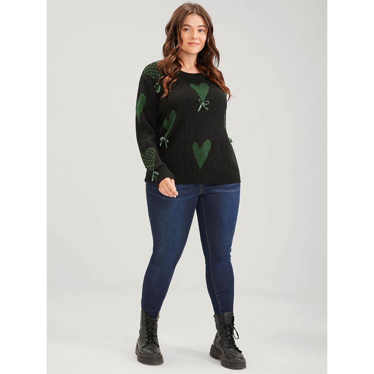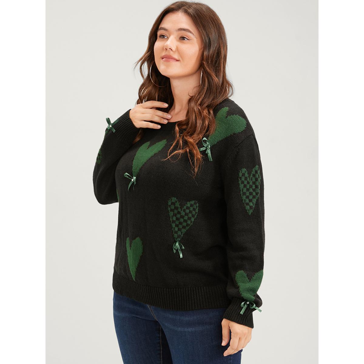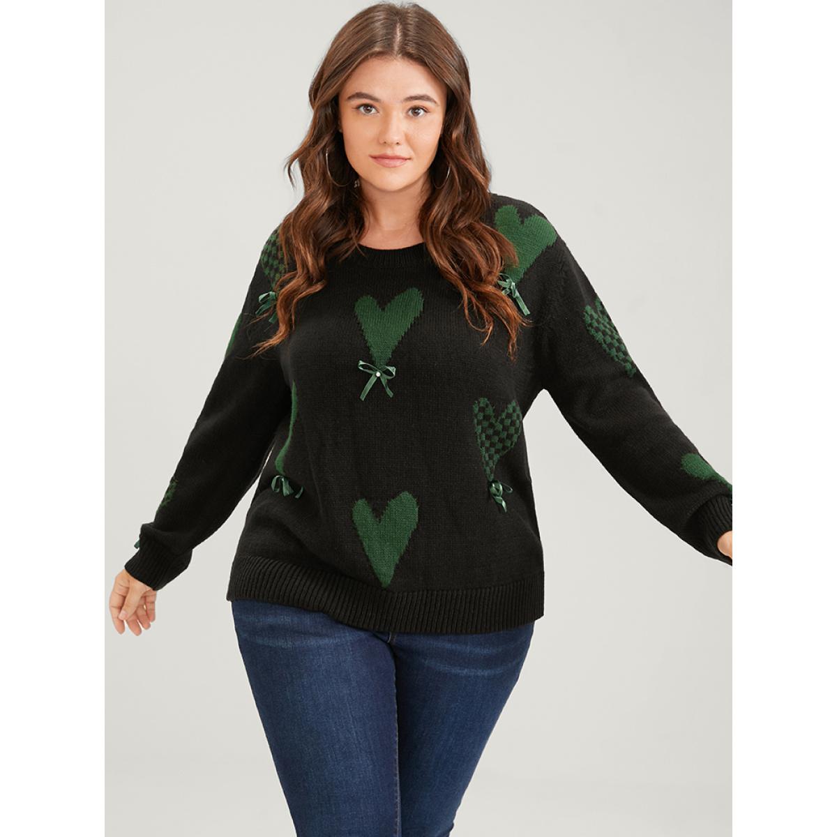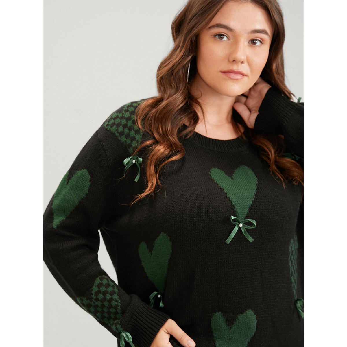 Plus Size Heart Print Contrast Pointelle Knit Bowknot Beaded Knit Top Black Women Elegant Long Sleeve Round Neck Dailywear Pullovers BloomChic 28/5X