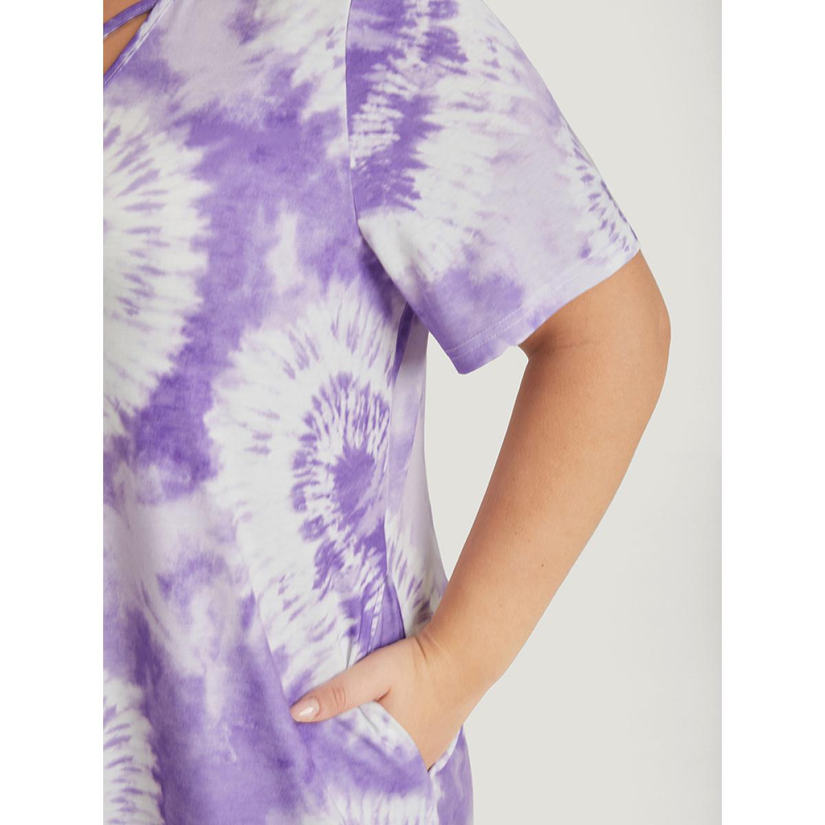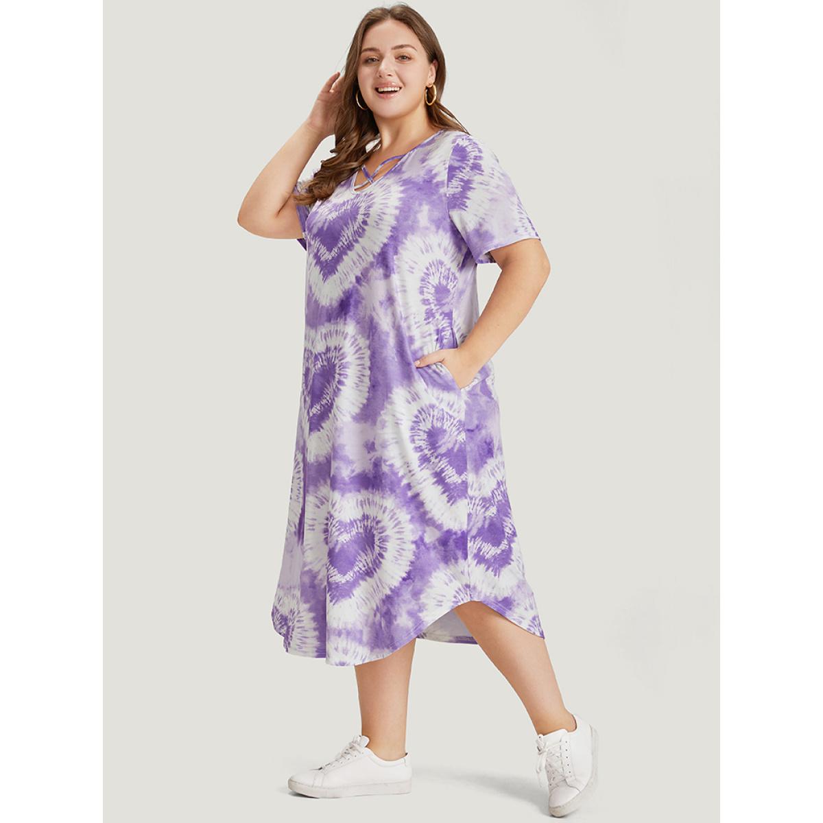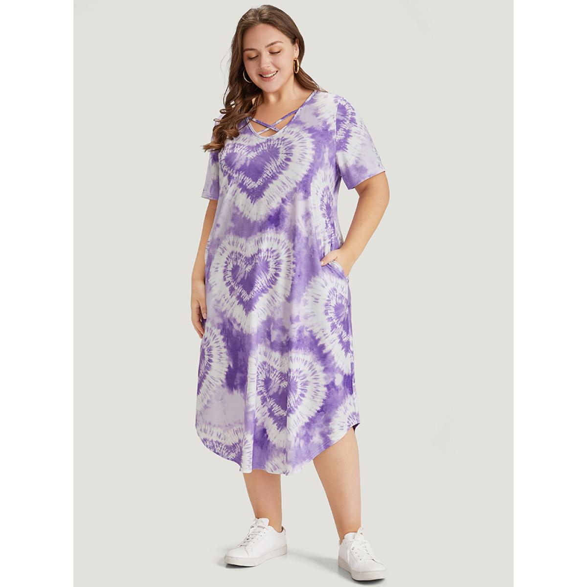 Plus Size Heart Print Tie Dye Pocket Crisscross Neck Dress Lilac Women Casual Printed V-neck Short sleeve Curvy Midi Dress BloomChic 30/6X