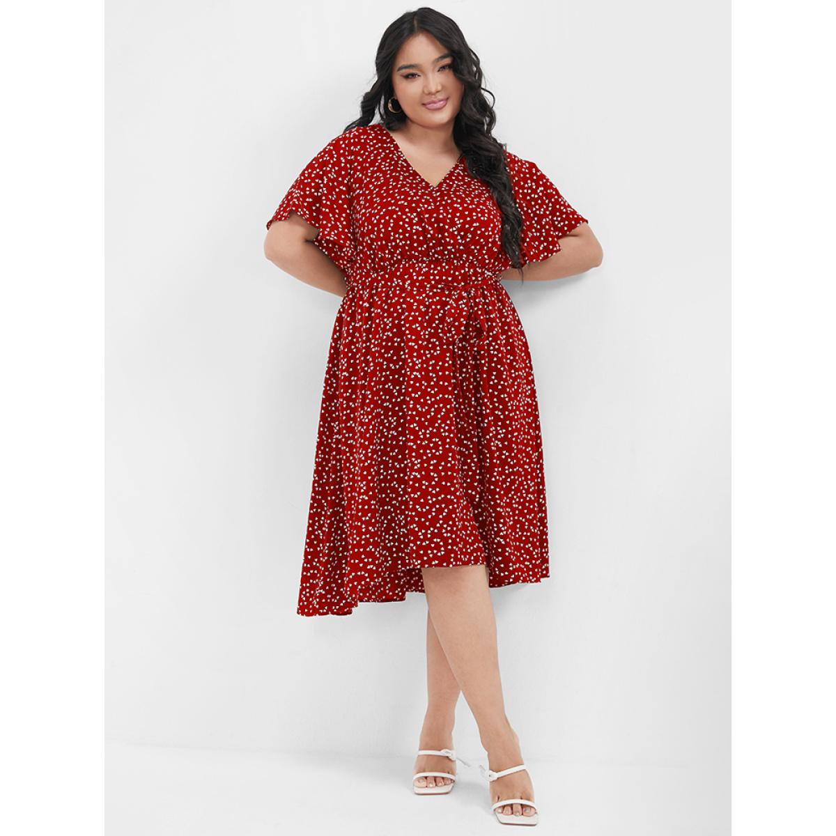Plus Size Heart Printed Pocket Ties Ruffles Knee Dress Burgundy Women Elegant Elastic Waist V-neck Short sleeve Curvy Knee Dress BloomChic 10/M