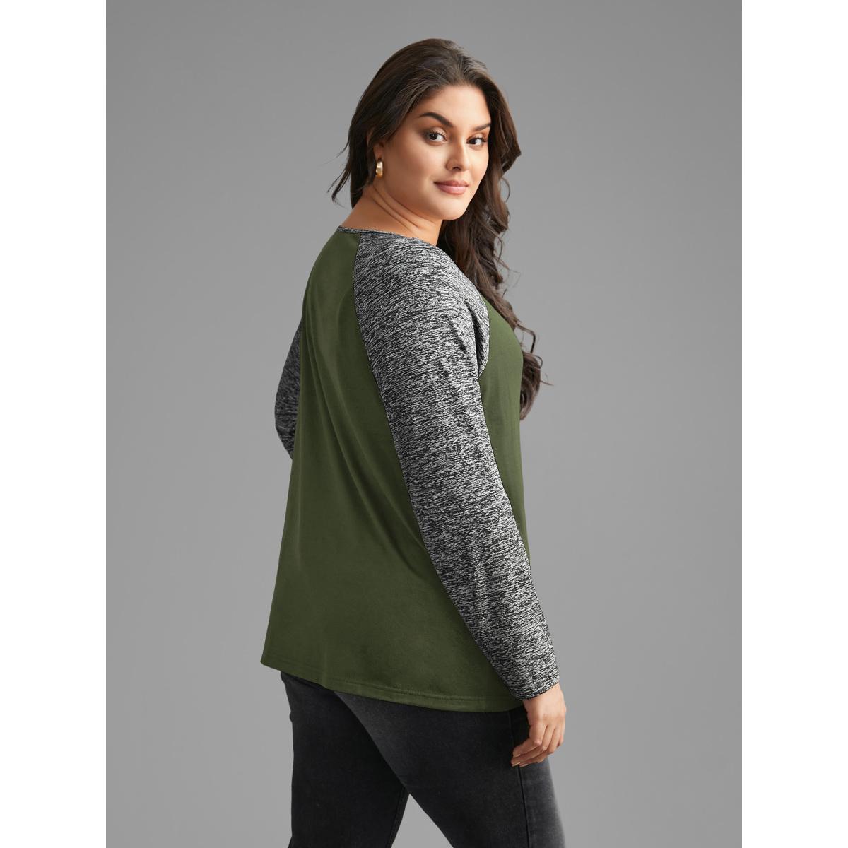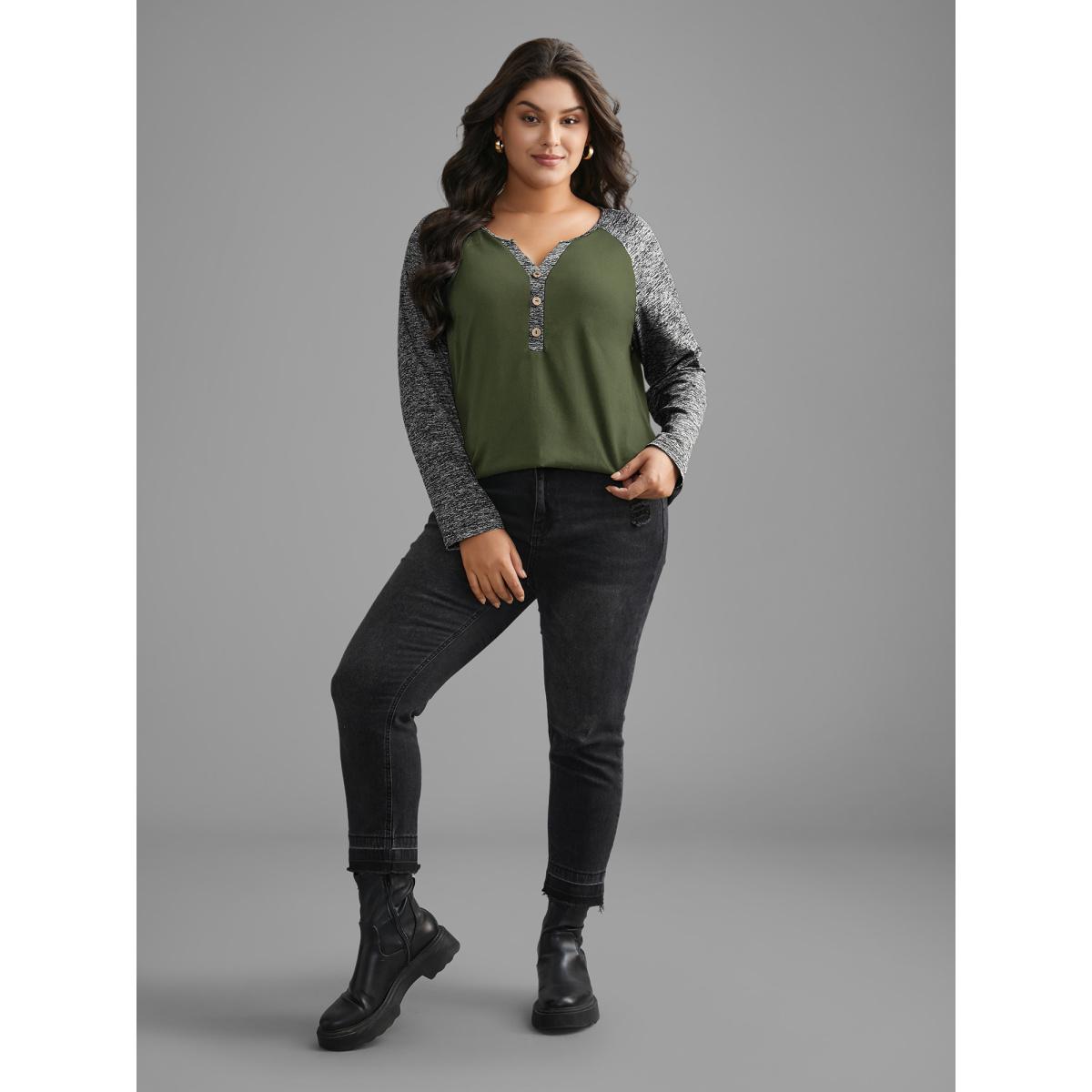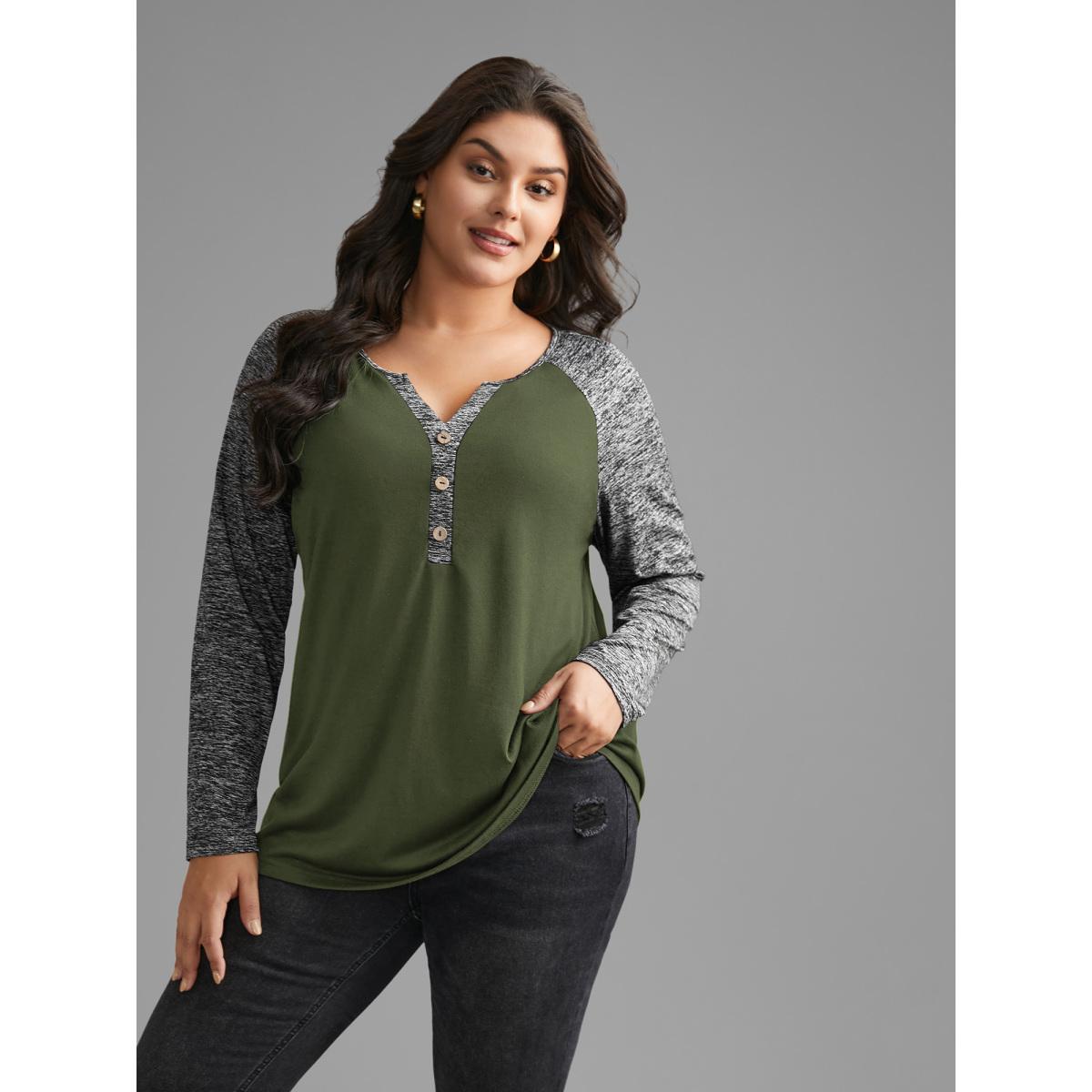 Plus Size Heather Patchwork Button Detail Stretchy T-Shirt ArmyGreen Women Casual Contrast Flat collar with V-notch Everyday T-shirts BloomChic 14-16/1X