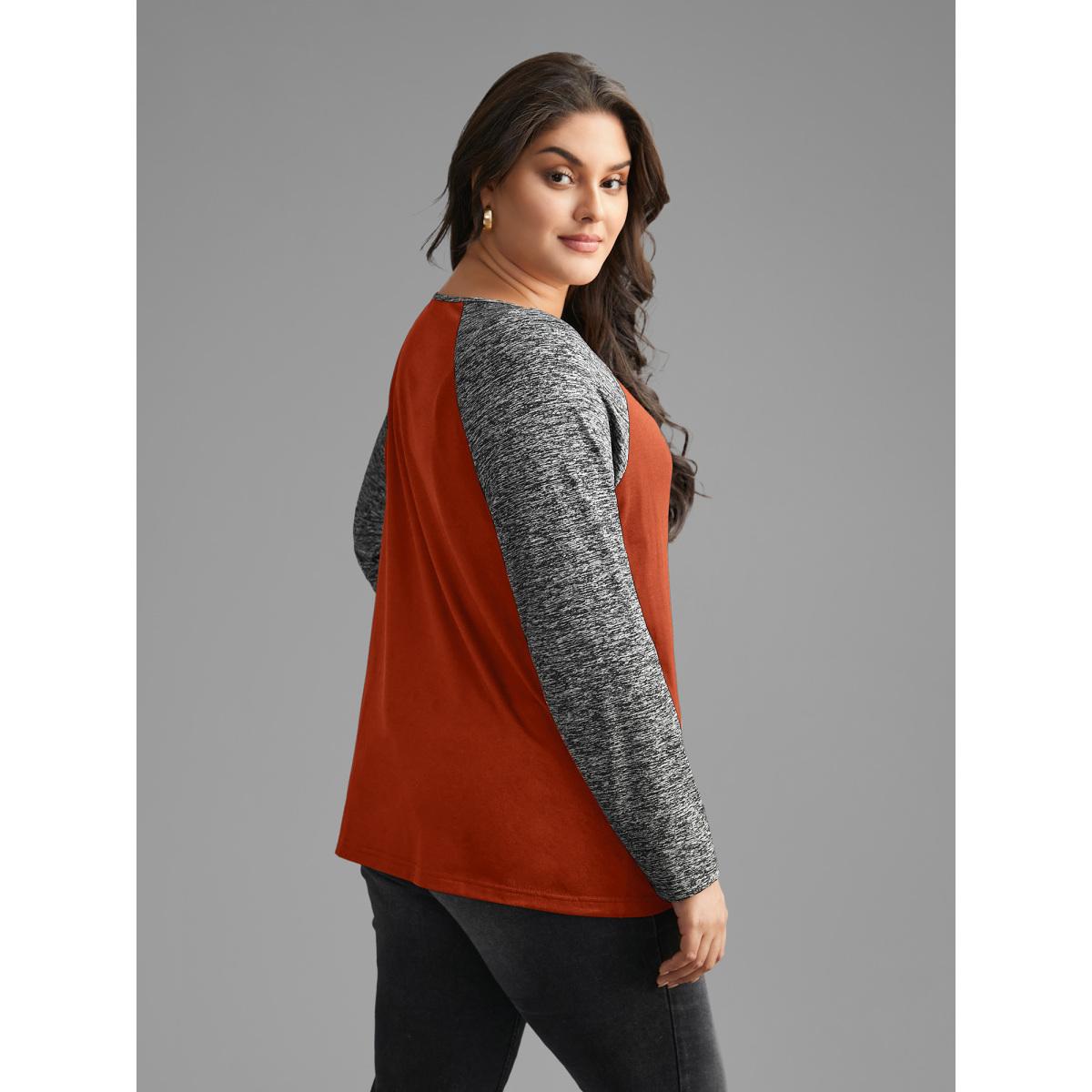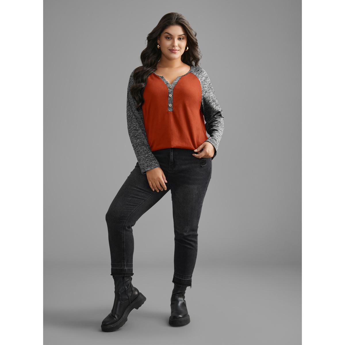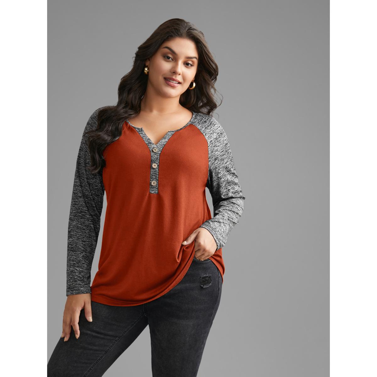 Plus Size Heather Patchwork Button Detail Stretchy T-Shirt Brightorange Women Casual Contrast Flat collar with V-notch Everyday T-shirts BloomChic 18-20/2X