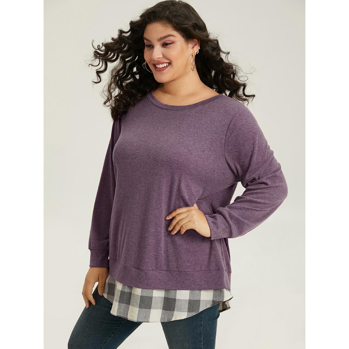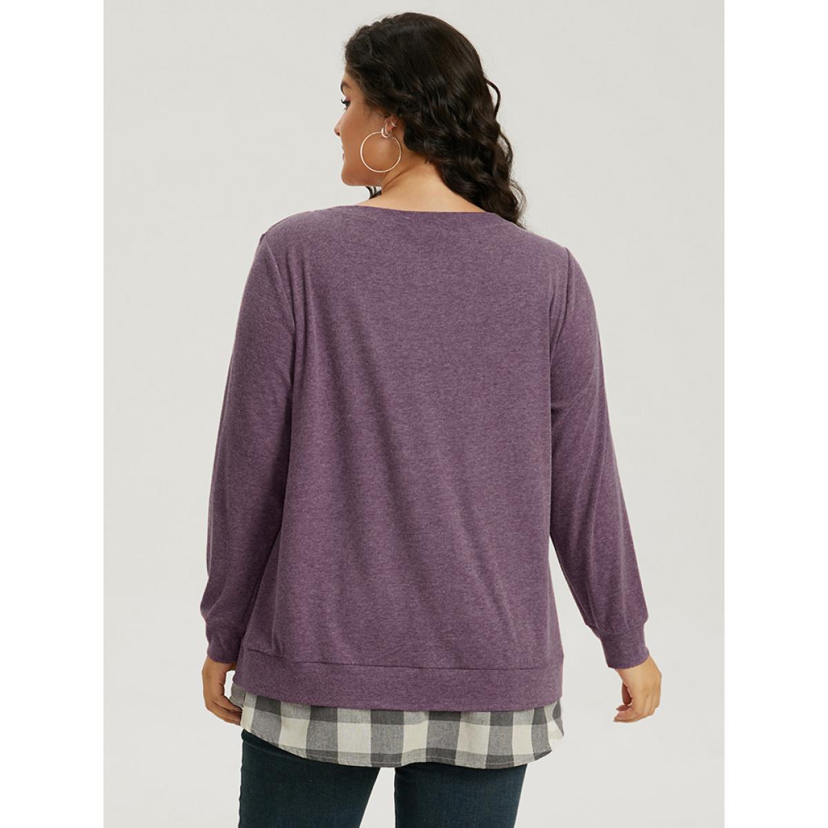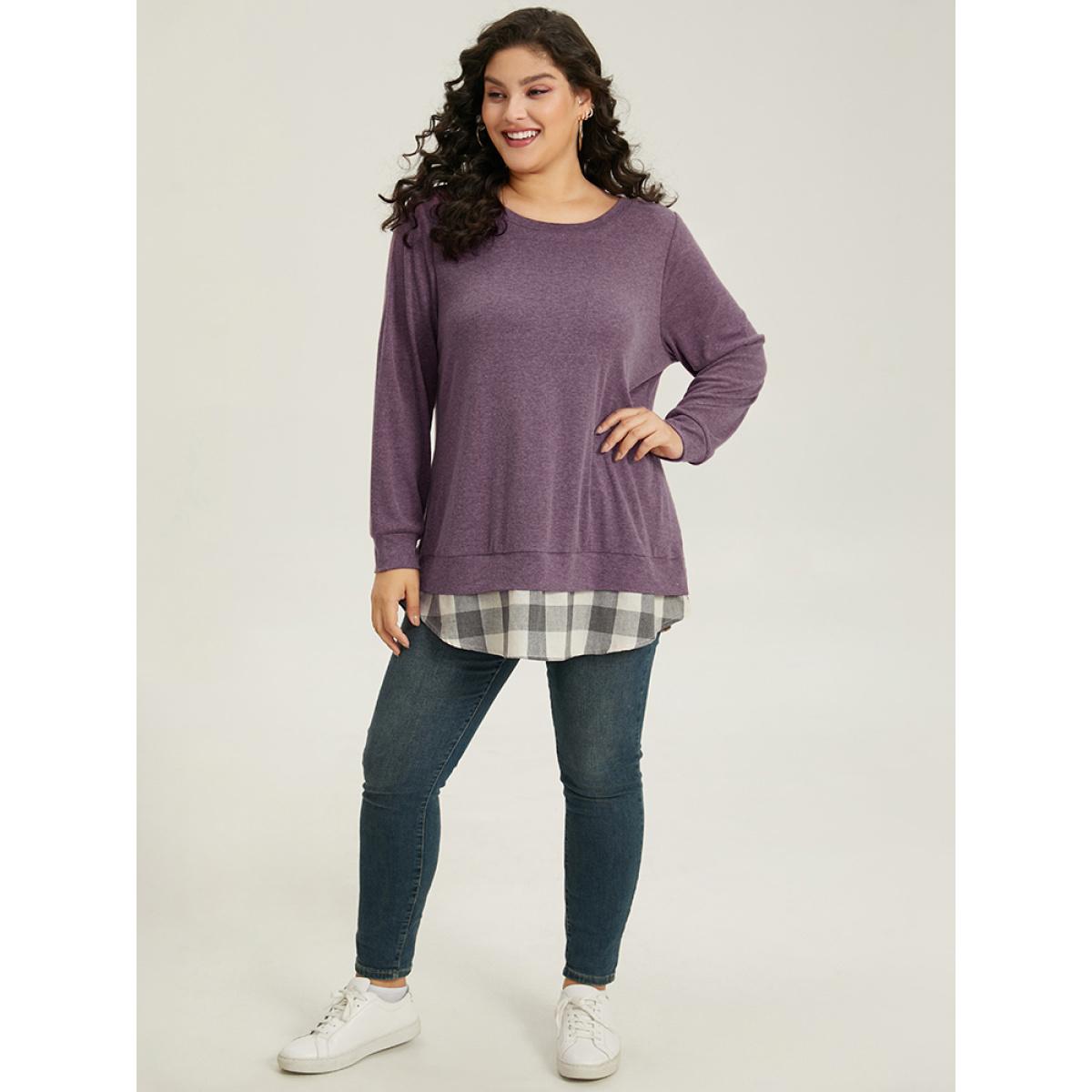 Plus Size Heather Plaid Patchwork Crew Neck T-shirt Purple Women Casual Heather Plaid Round Neck Everyday T-shirts BloomChic 18-20/2X