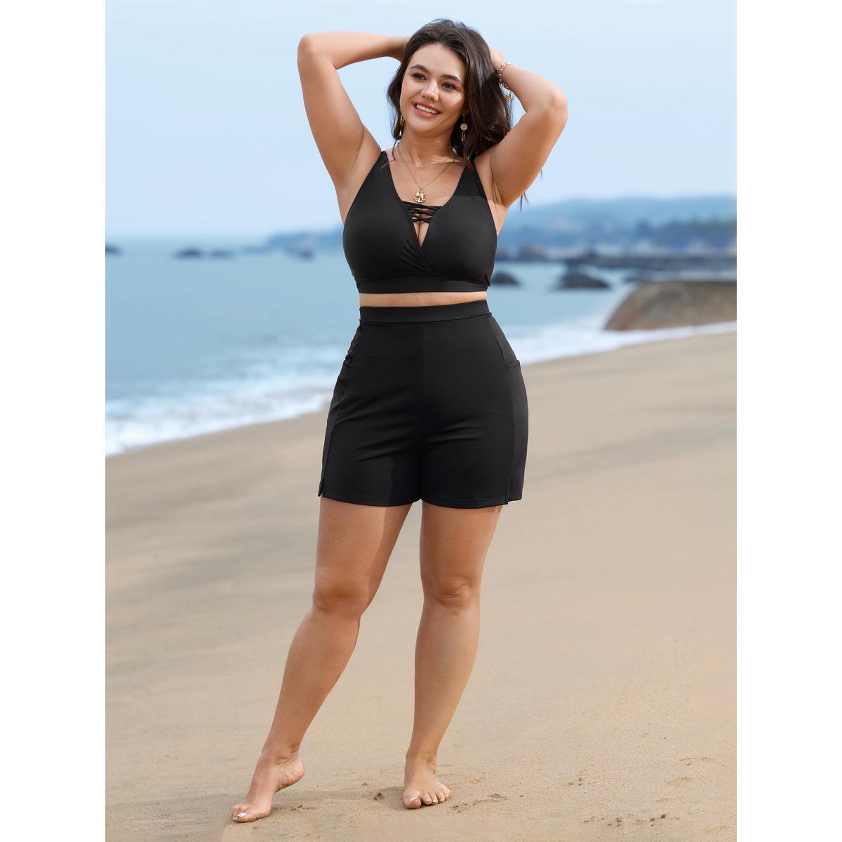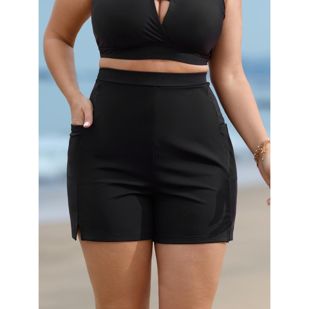 Plus Size High Rise Pocket Split Side Swim Bottom Women's Swimwear Black Resort Non High stretch Skinny High Rise Slanted pocket Curve Swim Bottoms BloomChic 26/4X