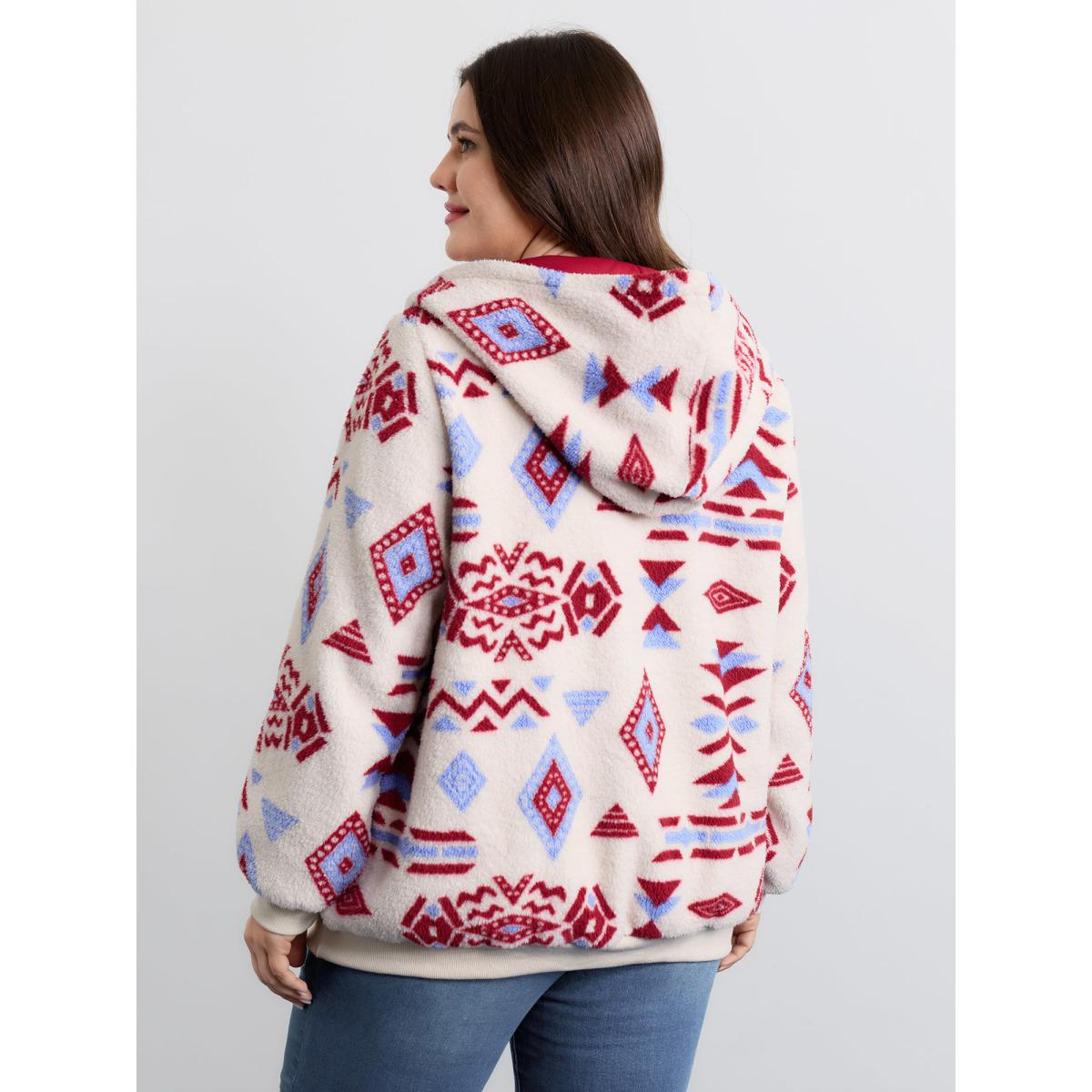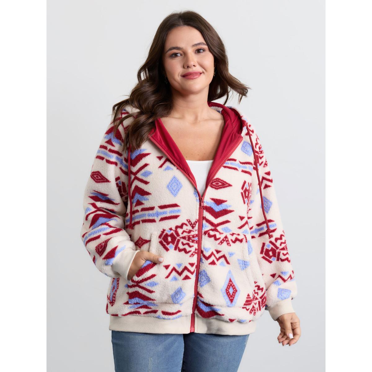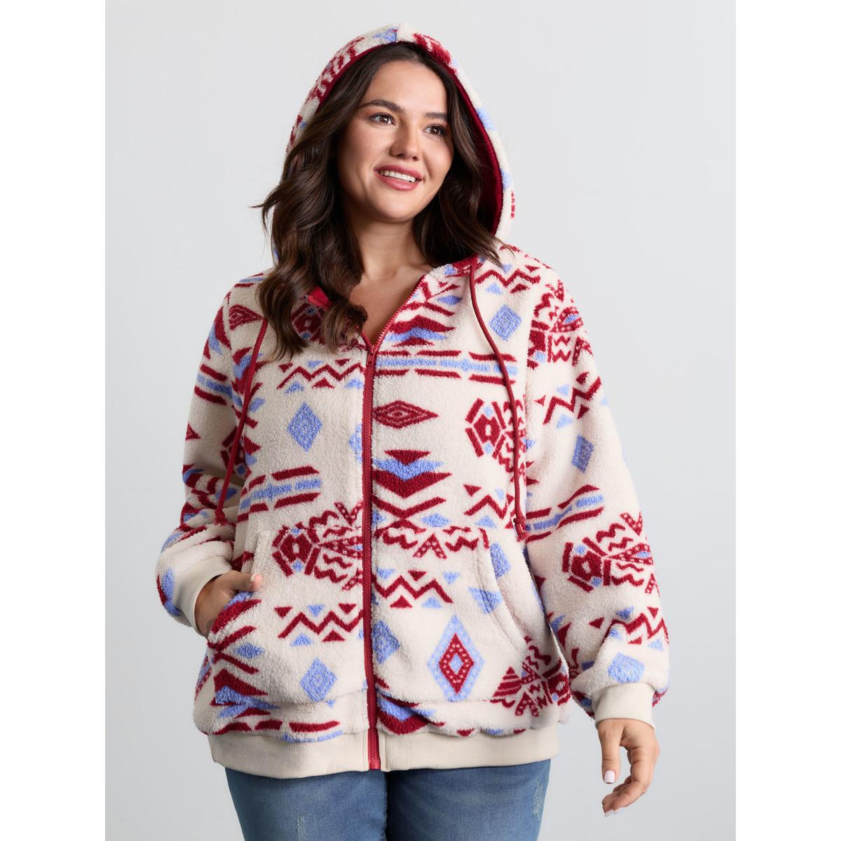 Plus Size Geometric Boho Print Open Front Jacket Women White Resort Contrast Ladies Vacation Winter Coats BloomChic 28/5X