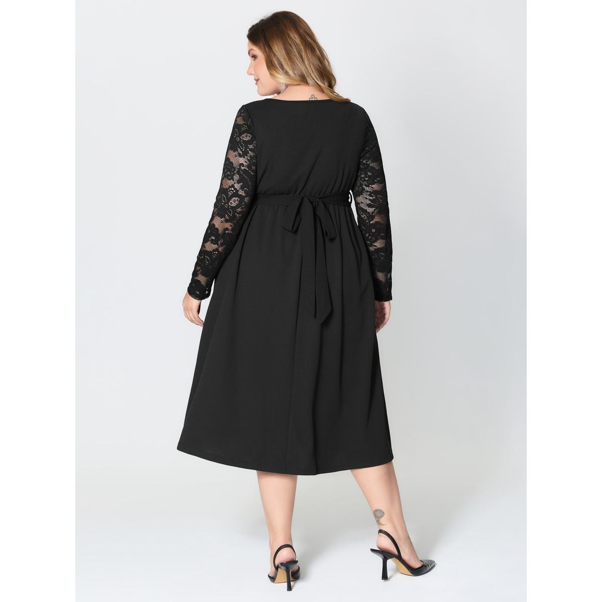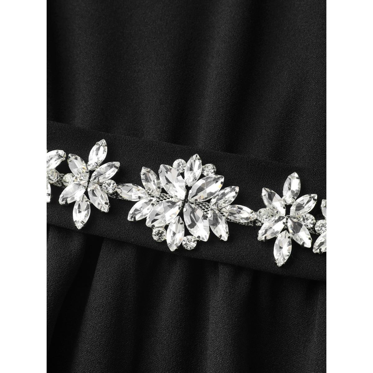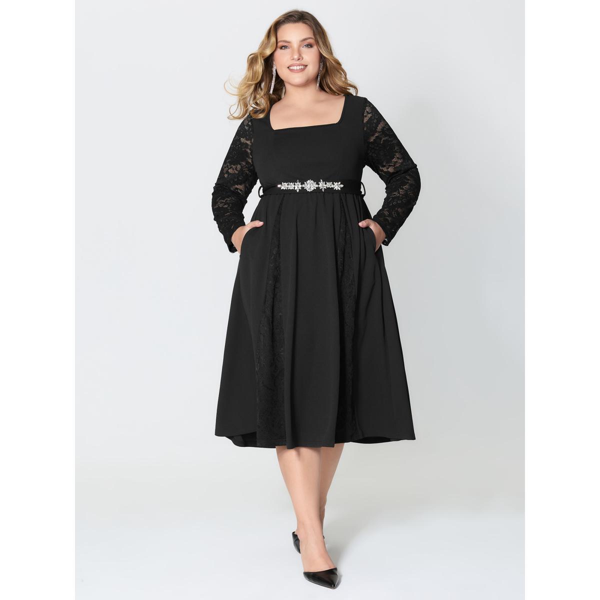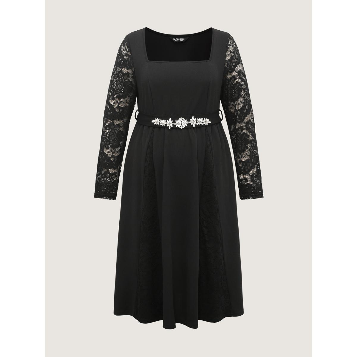 Plus Size Hotfix Rhinestones Lace Trim Midi Dress Black Women Formal Rhinestone detailing Square Neck Long Sleeve Curvy BloomChic 10/M
