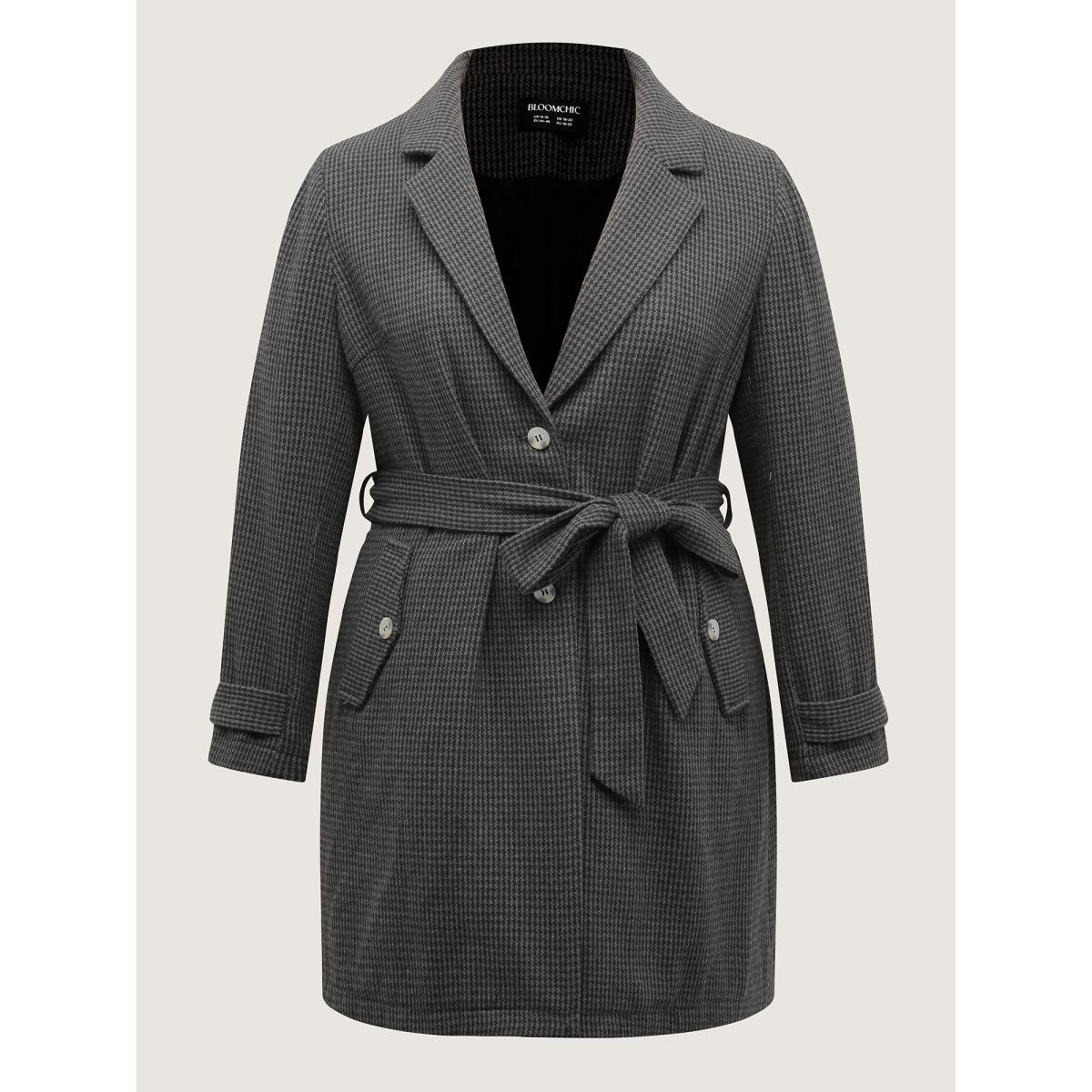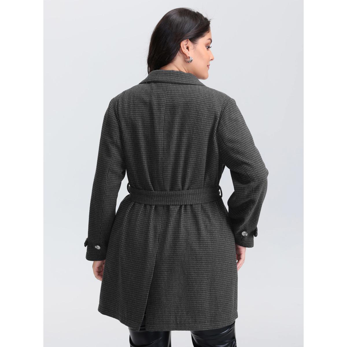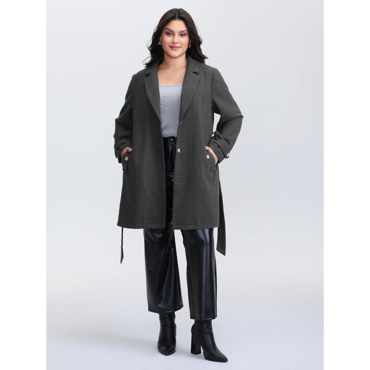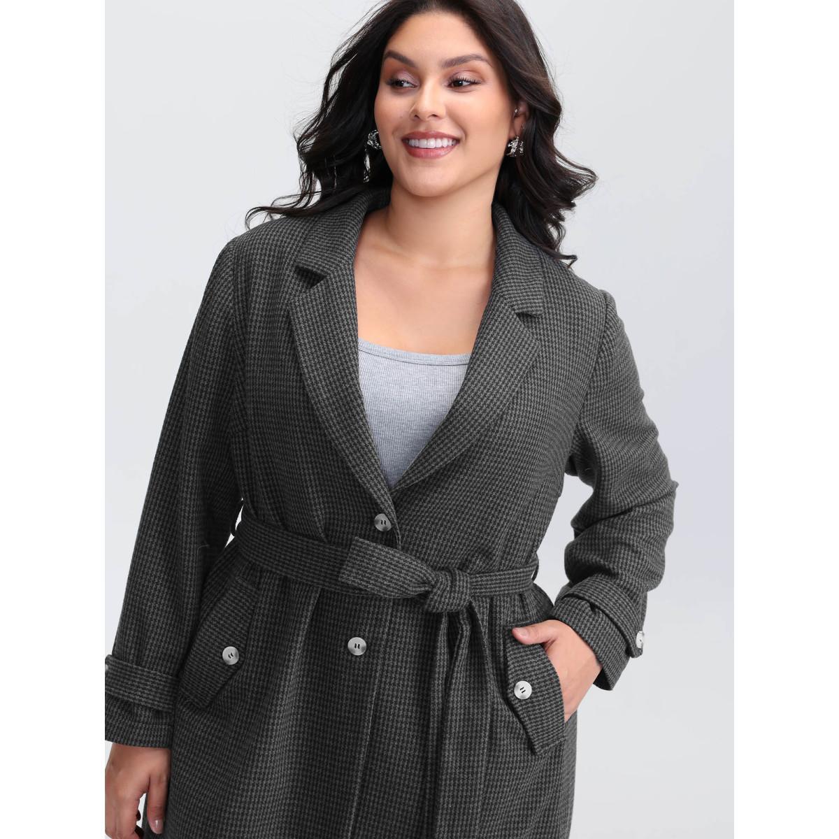 Plus Size Houndstooth Button Detail Belted Coat Women Black Leisure Belted Ladies Casual Winter Coats BloomChic 30/6X