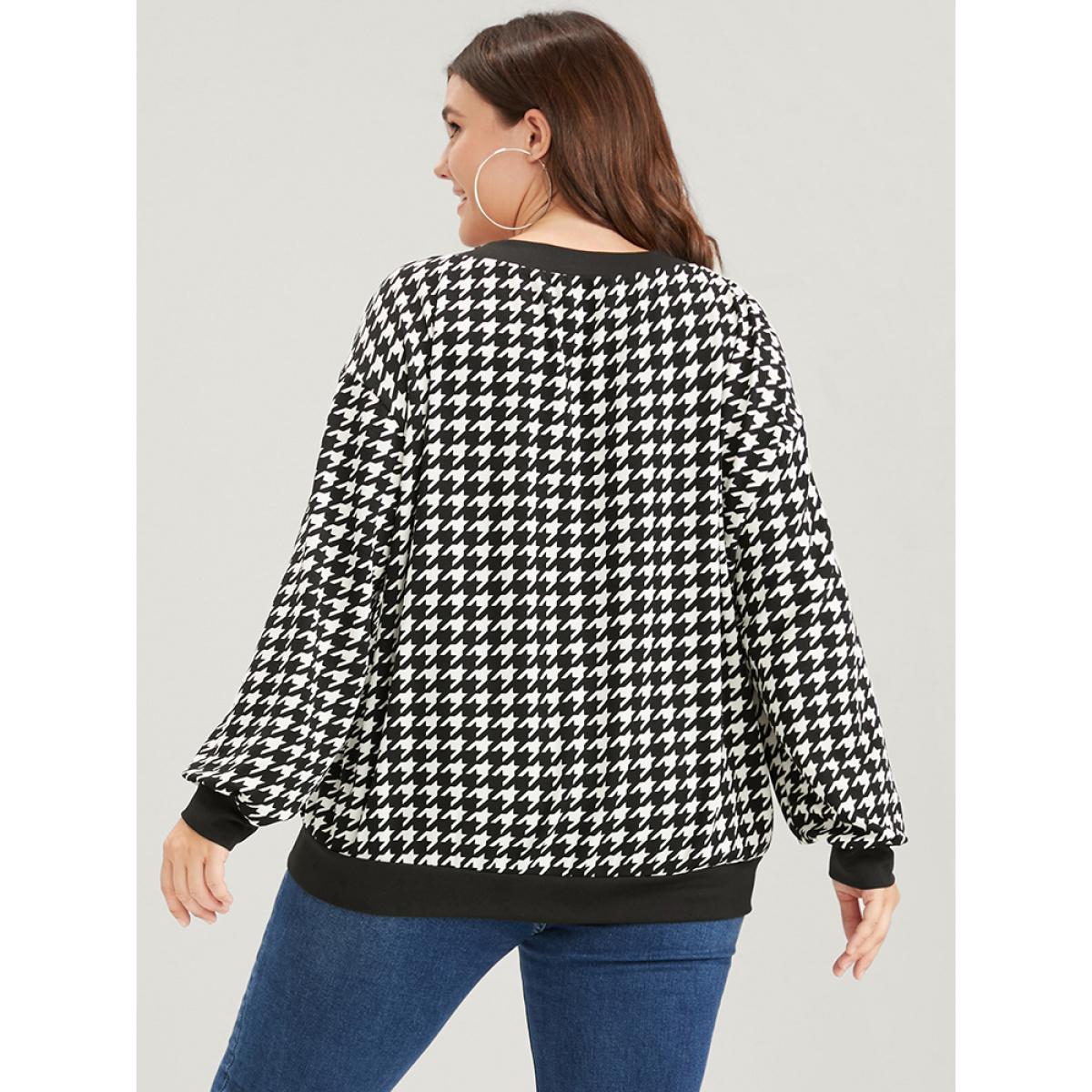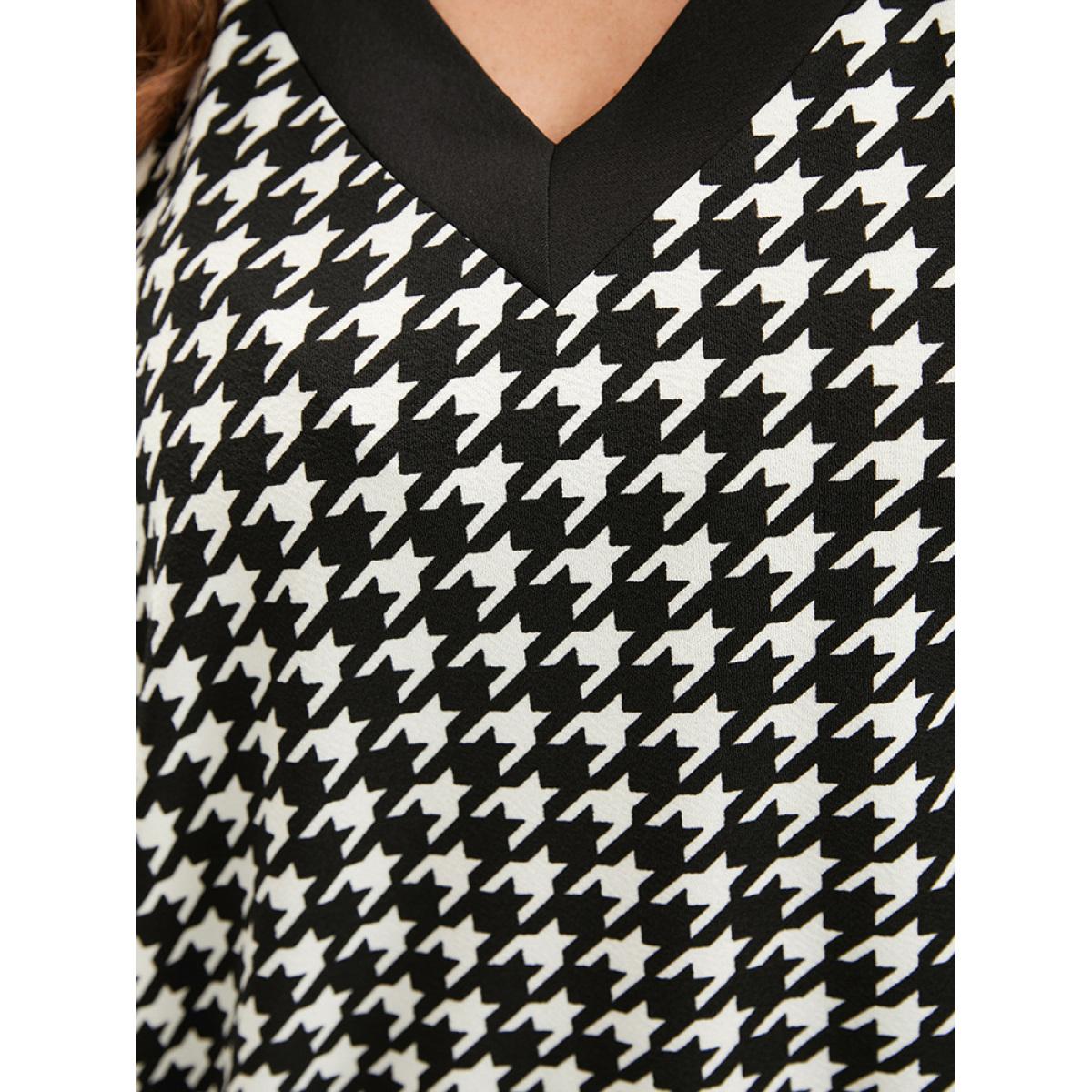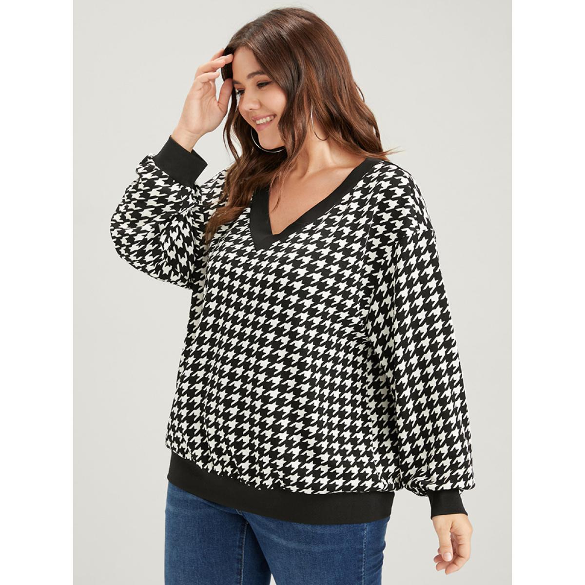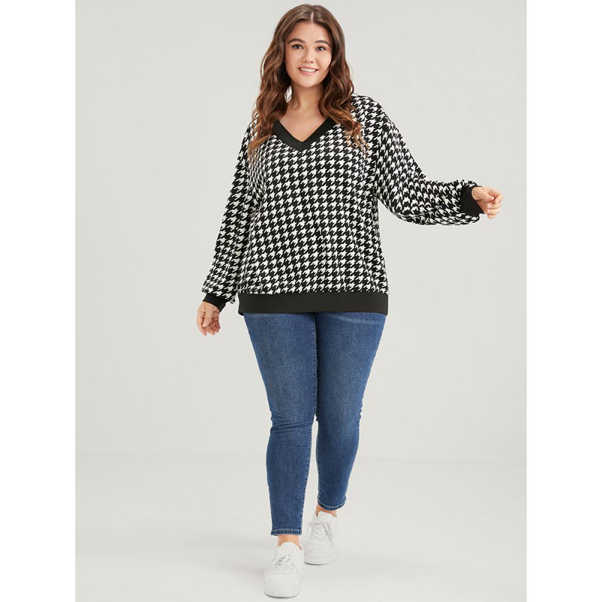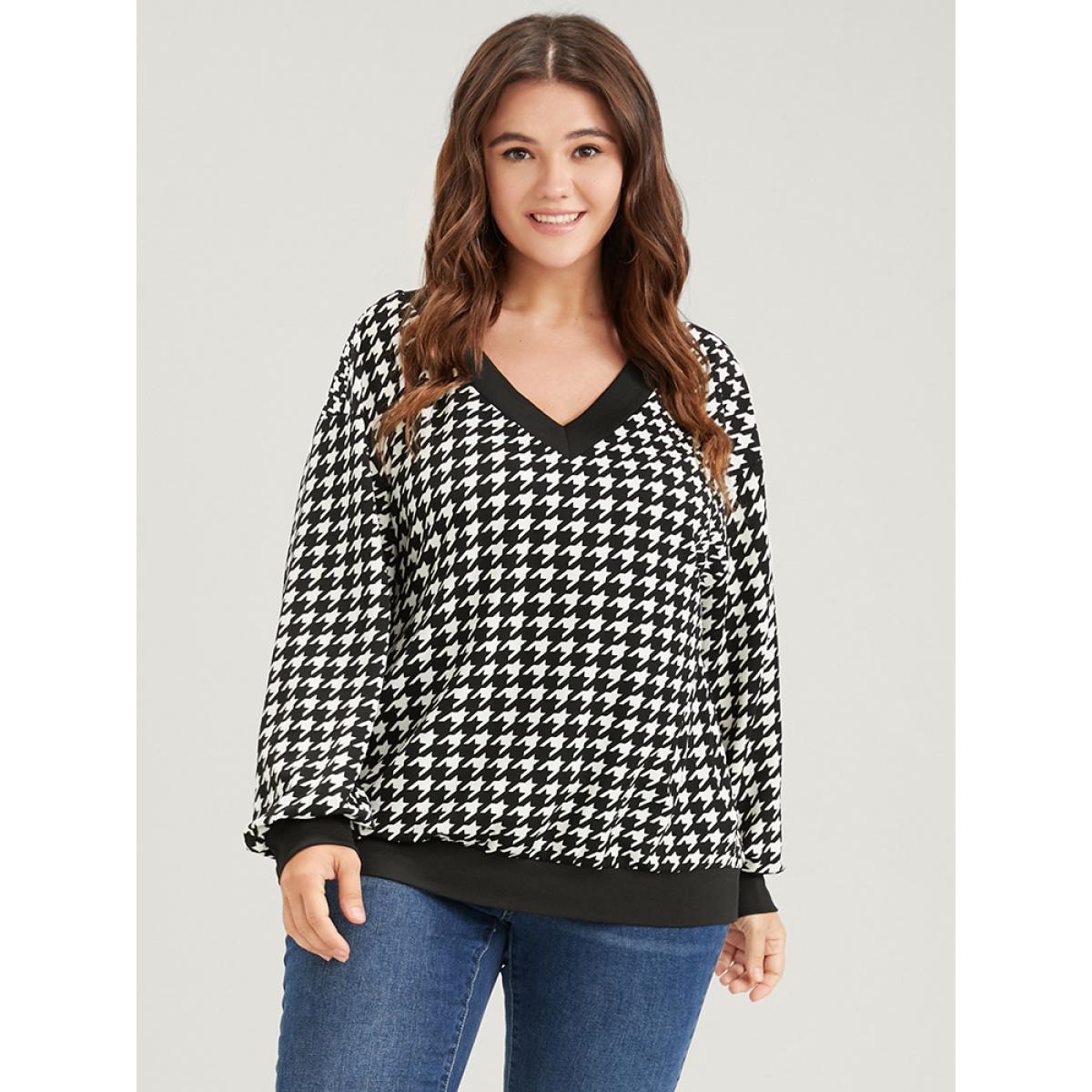 Plus Size Houndstooth Print Contrast V Neck Sweatshirt Women Black Elegant Contrast V-neck Dailywear Sweatshirts BloomChic 18-20/2X
