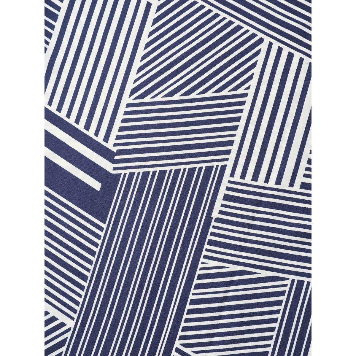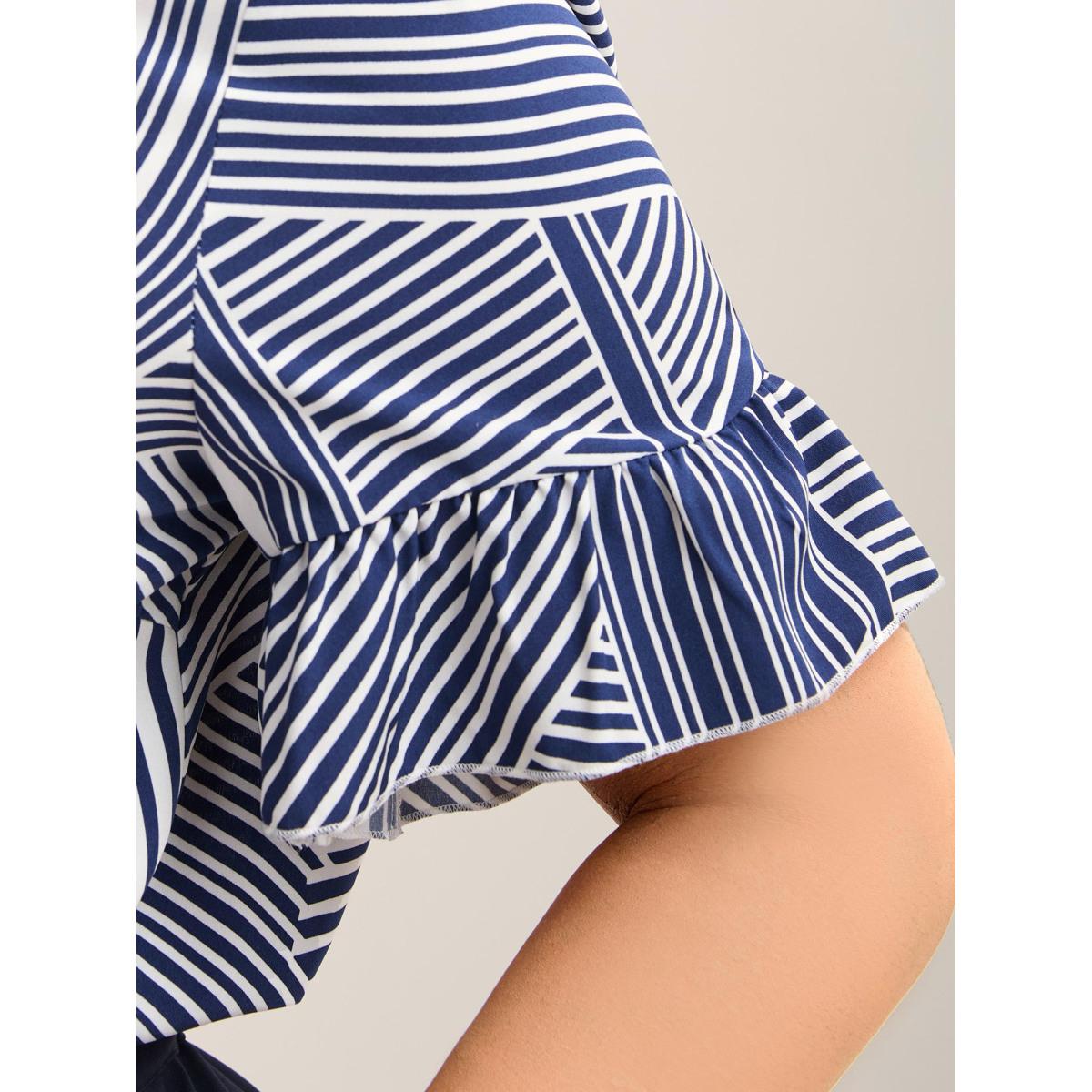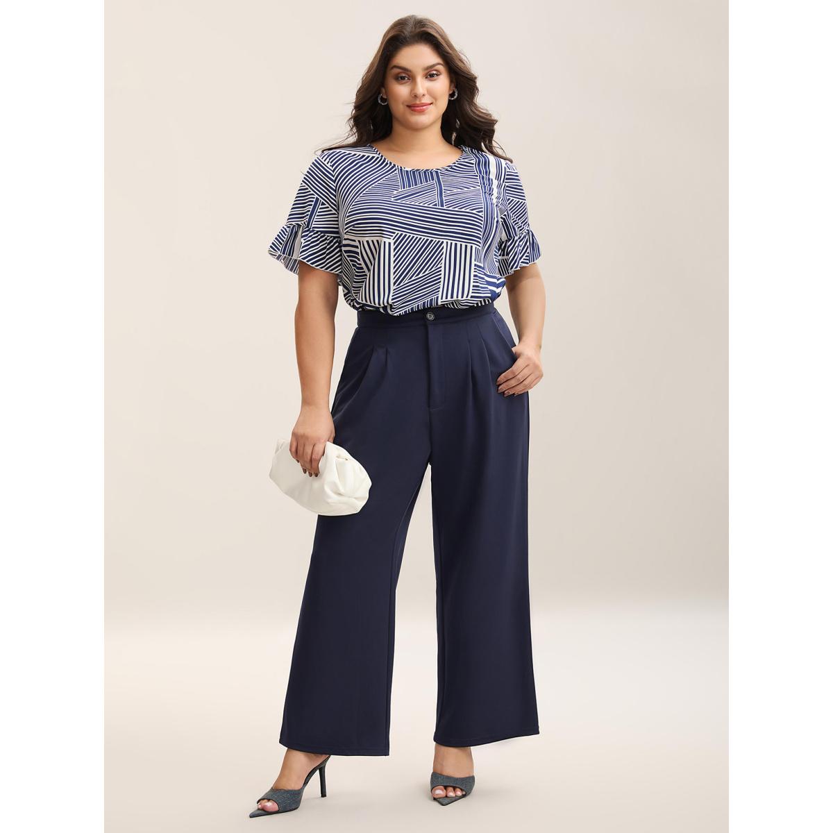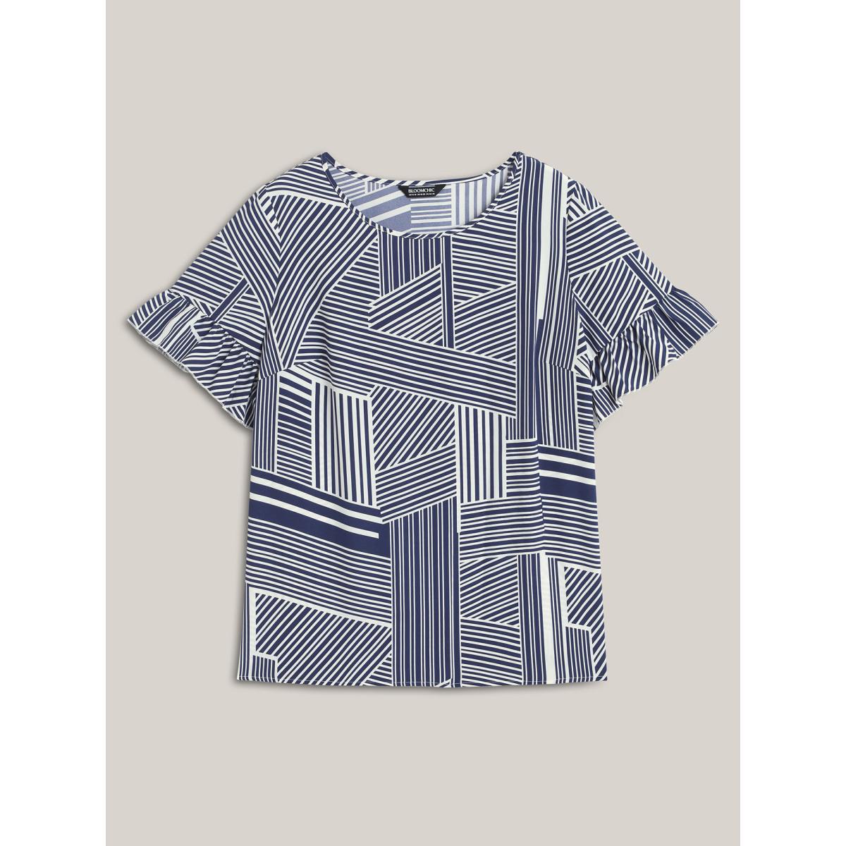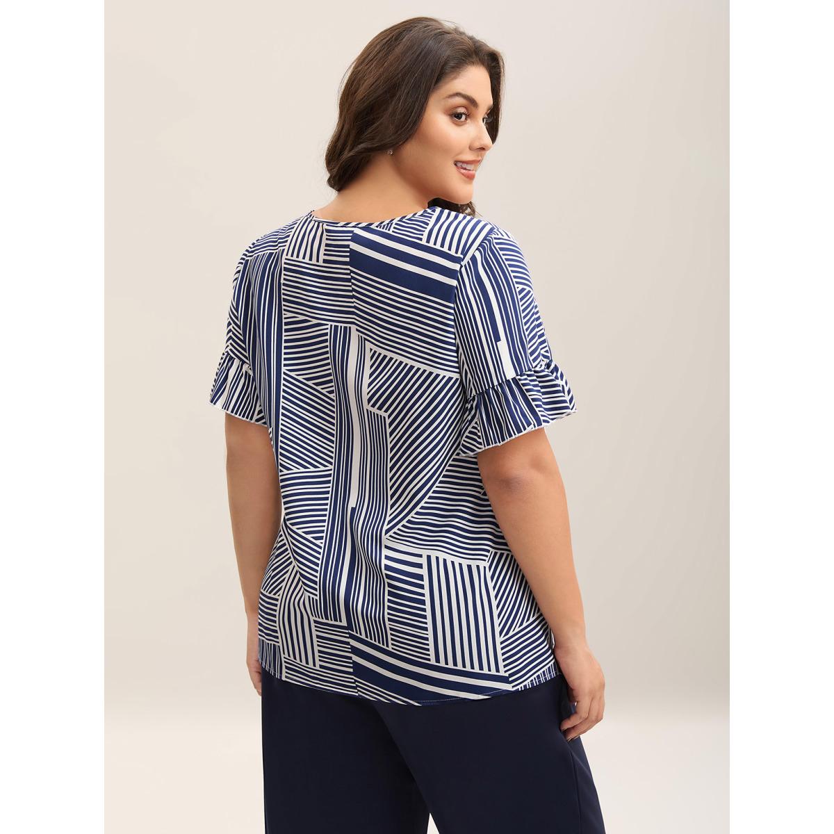 Plus Size Indigo Abstract Print Lotus Leaf Sleeve Blouse Women Work From Home Short sleeve Round Neck Work Blouses BloomChic 10/M