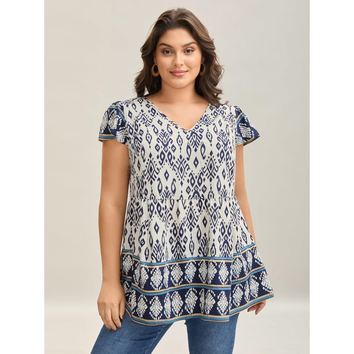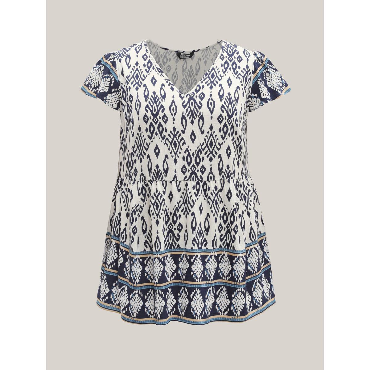 Plus Size Indigo Boho Print High-Low Hem Shirt Women Boho Cap Sleeve V-neck Vacation Blouses BloomChic 14-16/1X