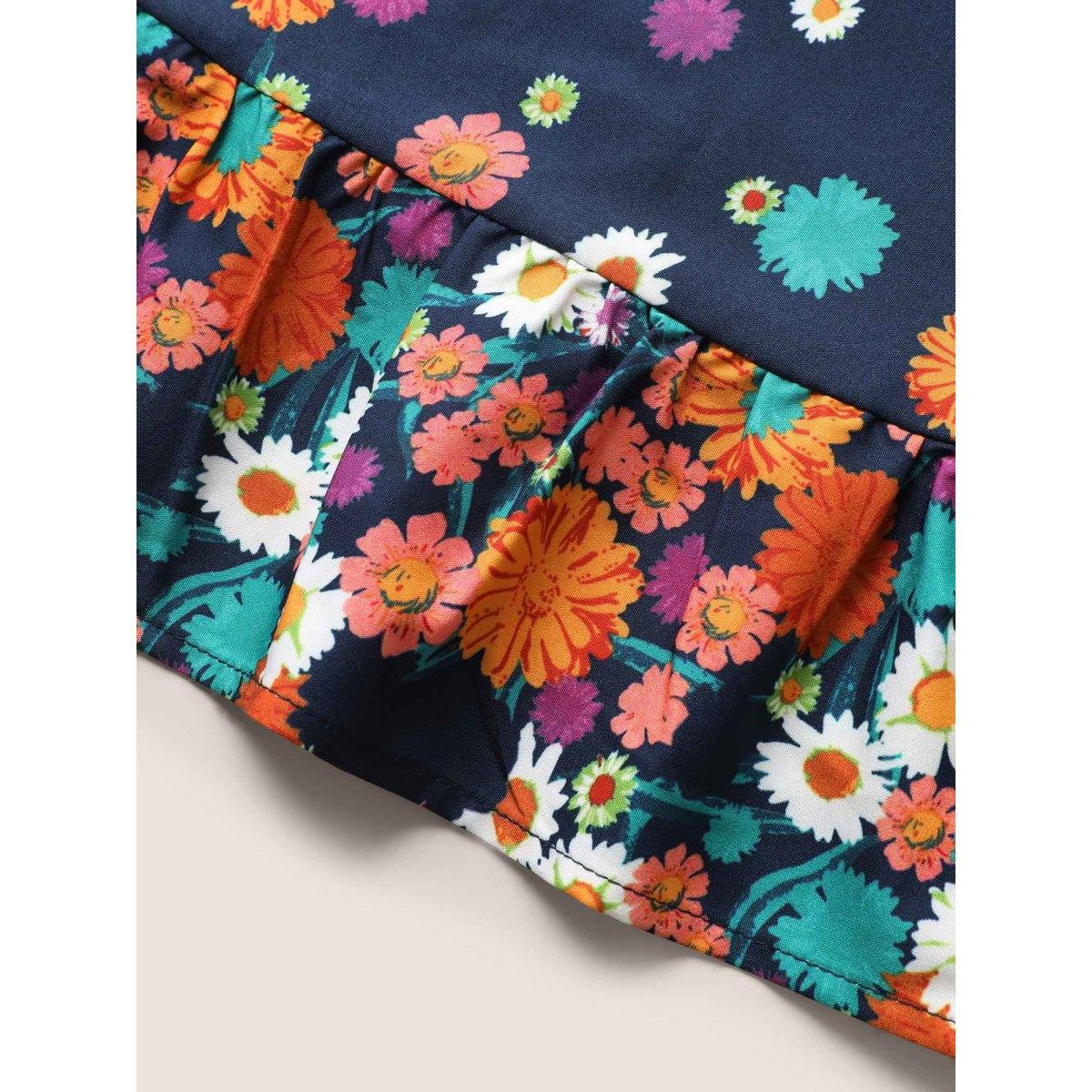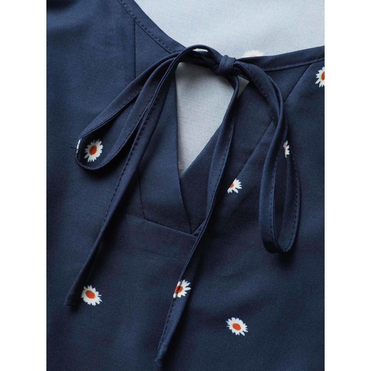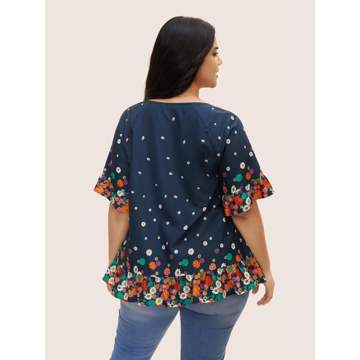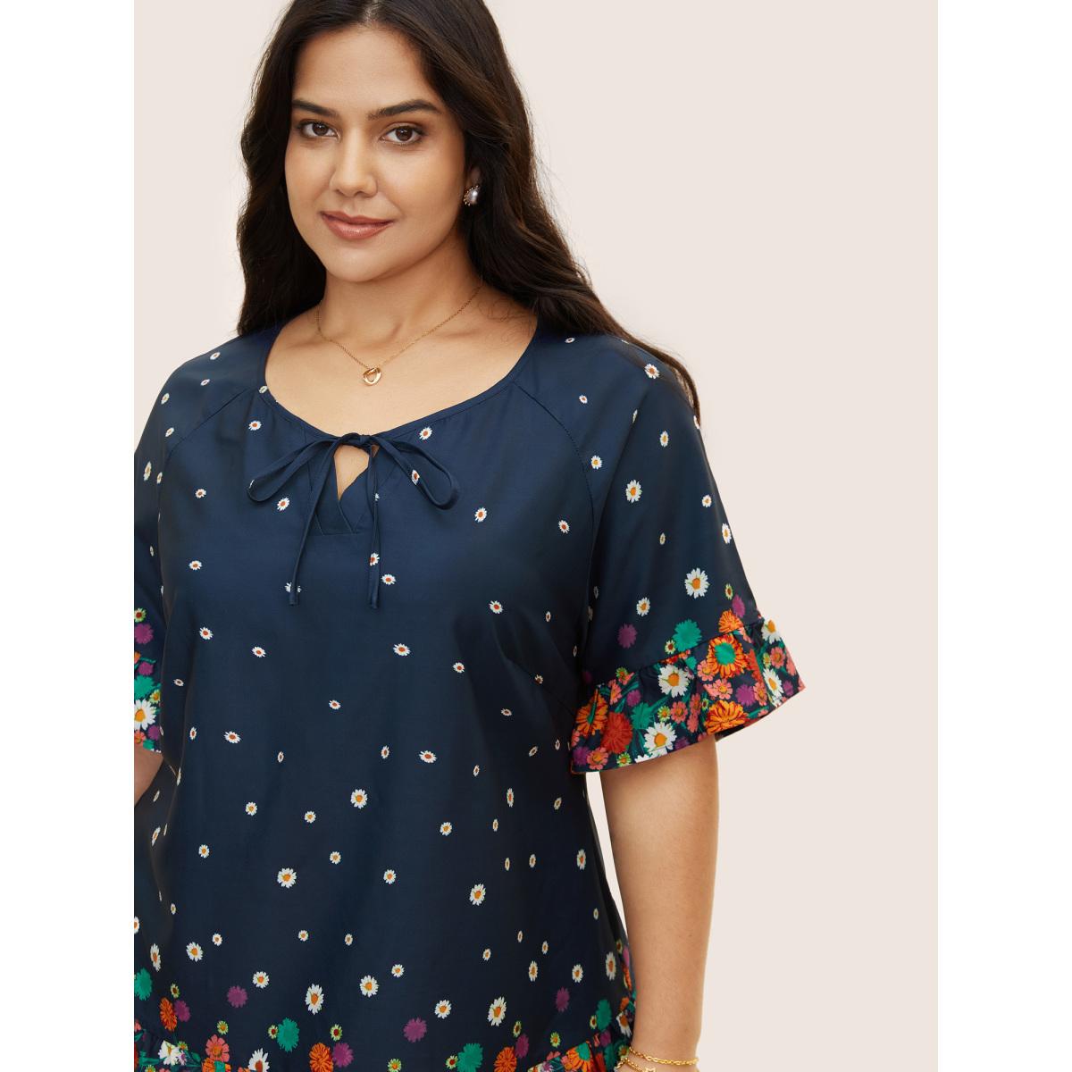 Plus Size Indigo Boho Print Ruffles Tie Knot Blouse Women Elegant Half Sleeve Flat collar with V-notch Everyday Blouses BloomChic 12/L