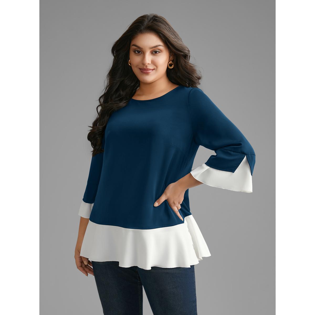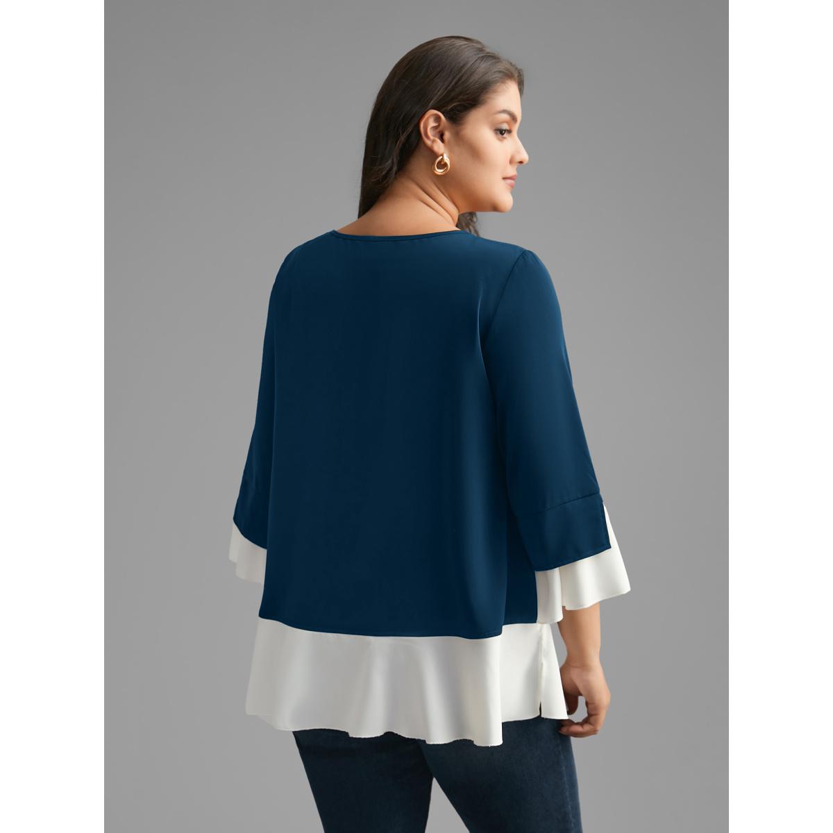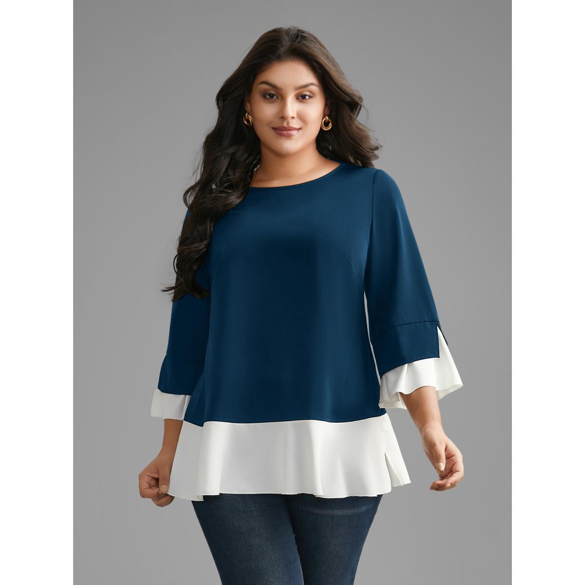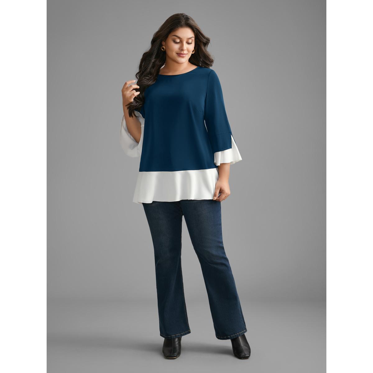 Plus Size Indigo Contrast Patchwork Bell Sleeve Blouse Women Elegant Elbow-length sleeve Round Neck Everyday Blouses BloomChic 14-16/1X