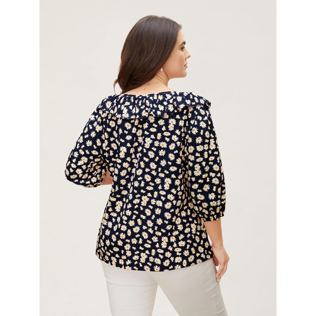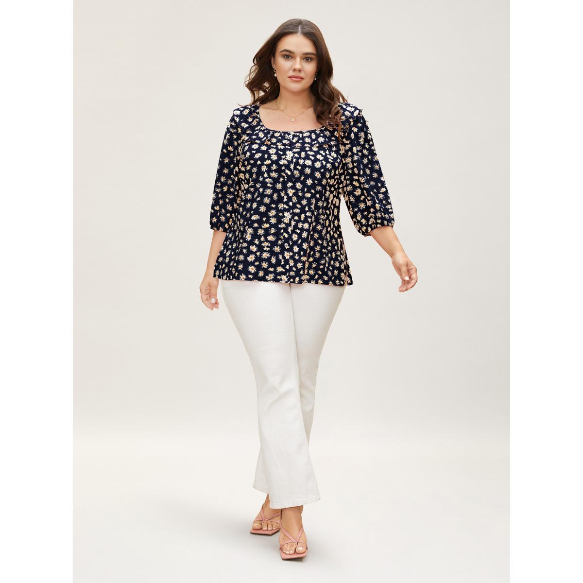 Plus Size Indigo Daisy Patterned Ruffled Collar Blouse Women Elegant Elbow-length sleeve Square Neck Everyday Blouses BloomChic 10/M