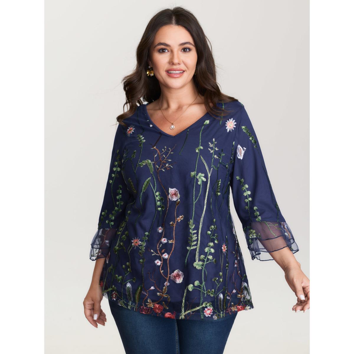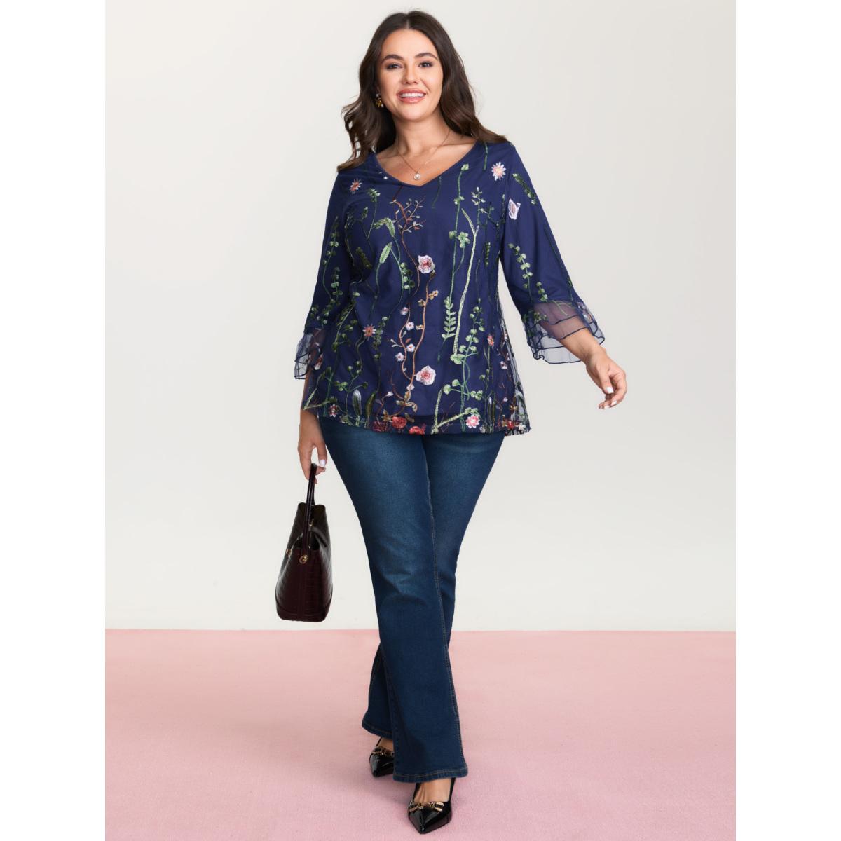 Plus Size Indigo Embroidered Mesh Lotus Leaf Sleeve Blouse Women Romantic Elbow-length sleeve V-neck Elegant Blouses BloomChic 14-16/1X