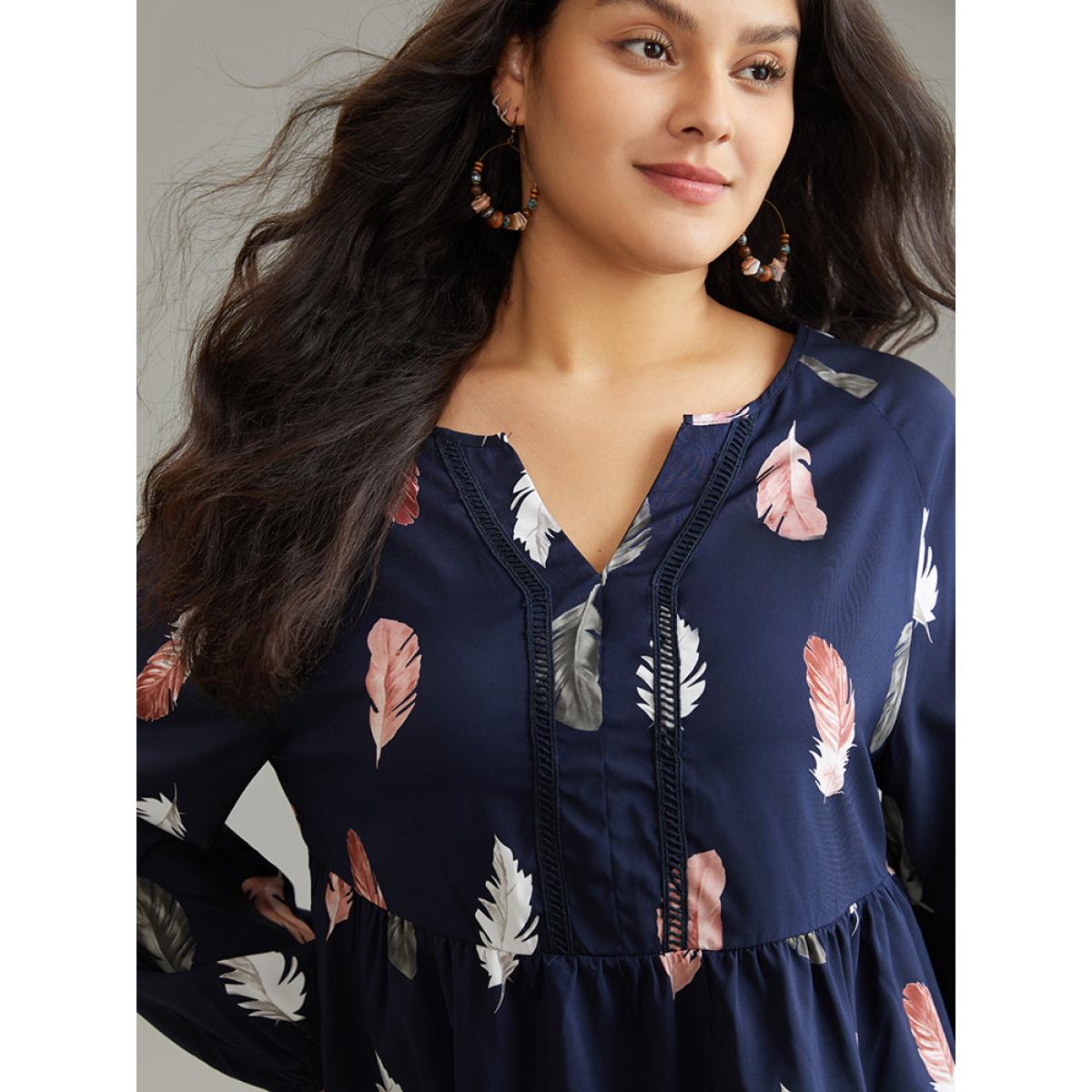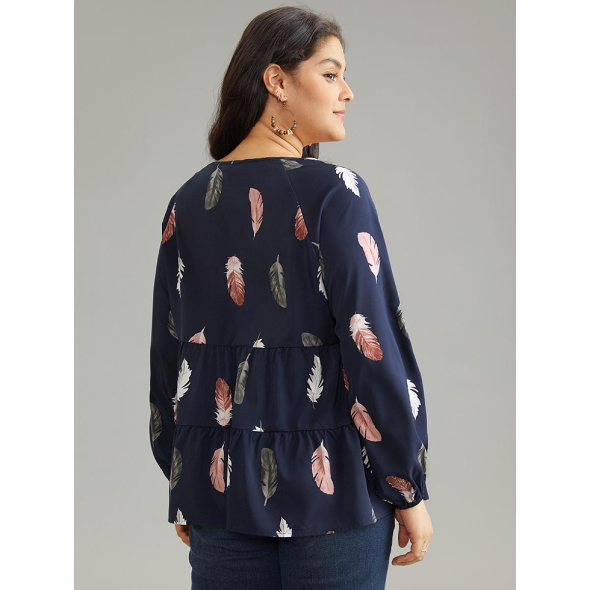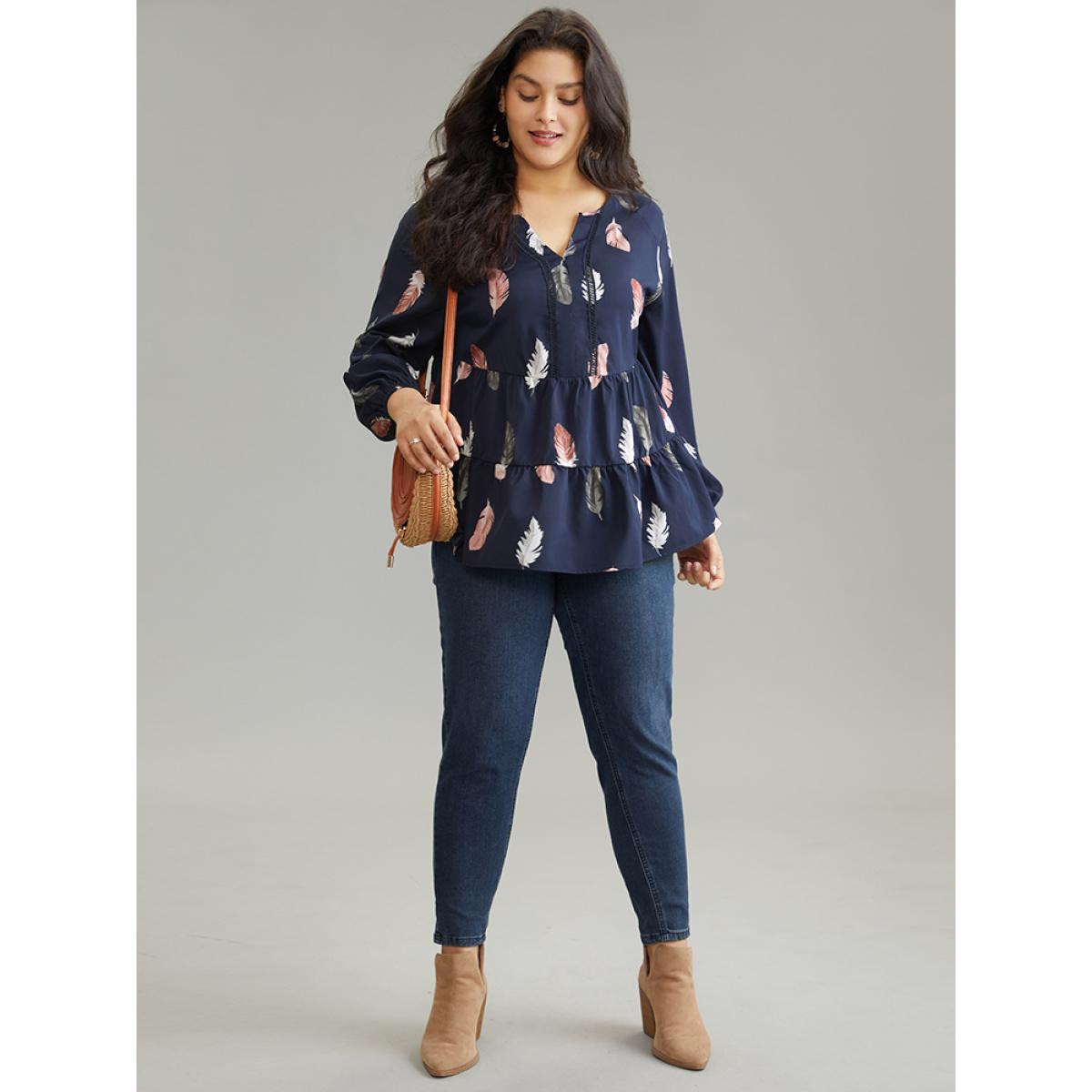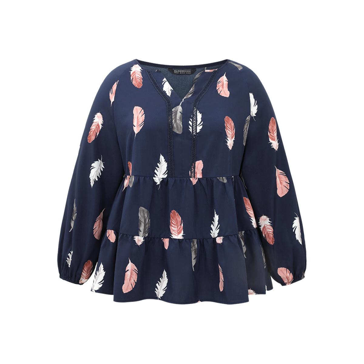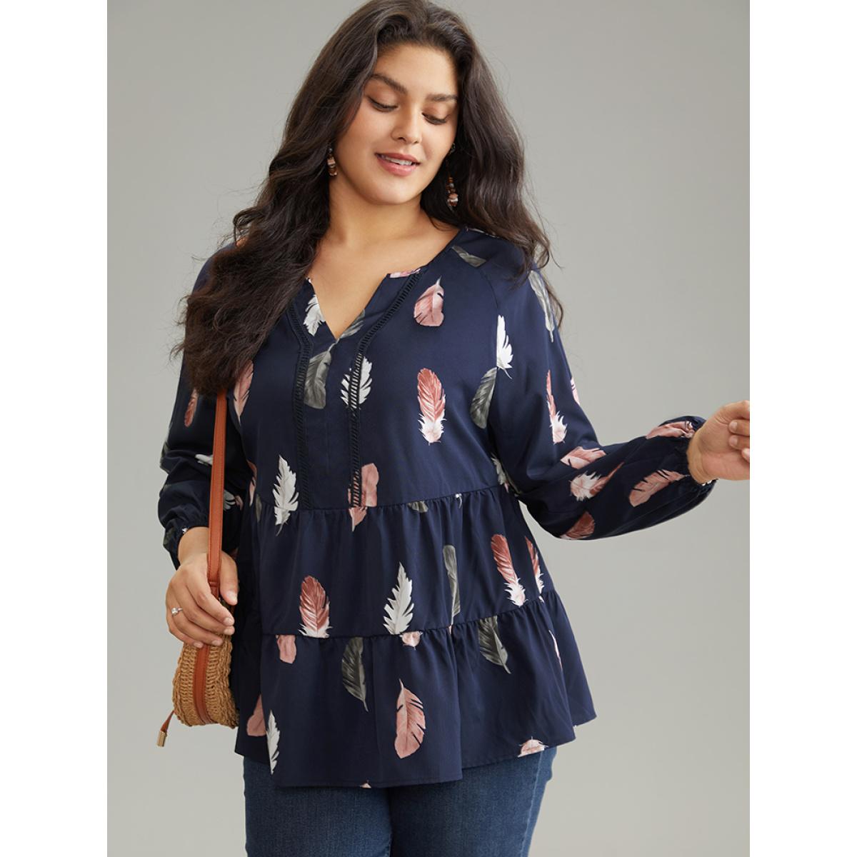 Plus Size Indigo Feather Print Notched Tiered Ruffle Hem Blouse Women Vacation Long Sleeve Notched collar Vacation Blouses BloomChic 18-20/2X