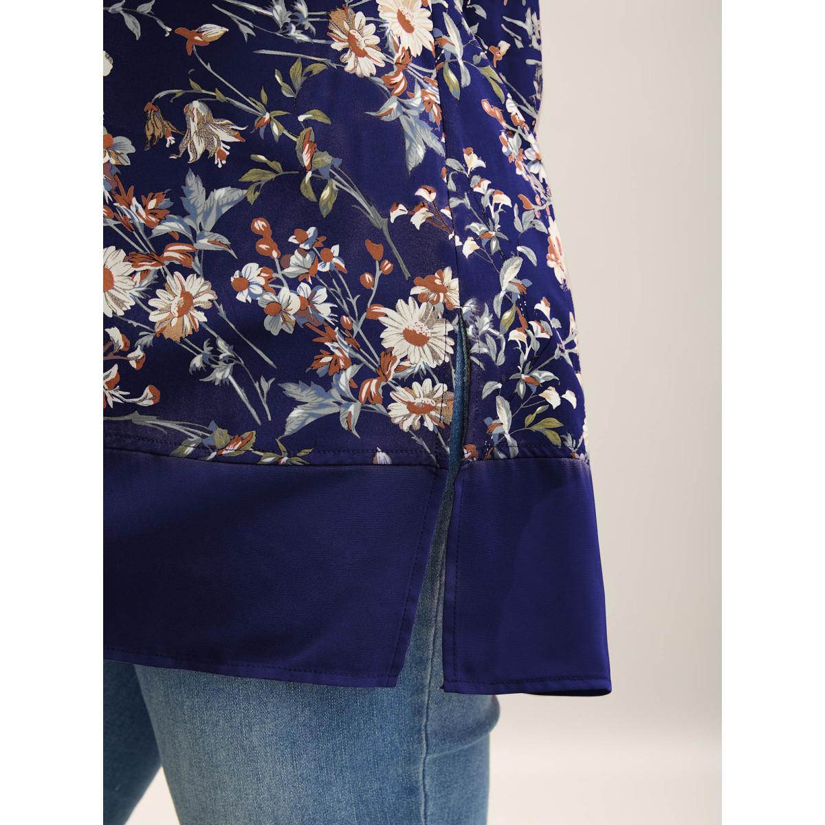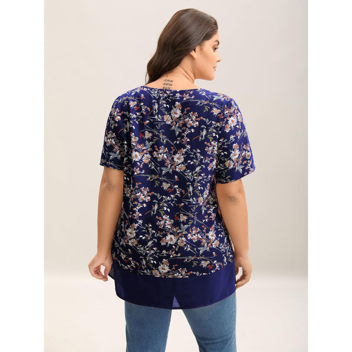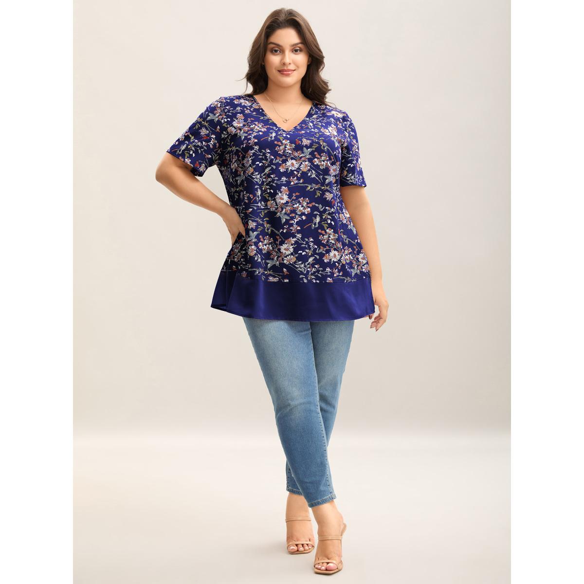 Plus Size Indigo Garden Print Spliced V-Neck Blouse Women Romantic Short sleeve V-neck Elegant Blouses BloomChic 22-24/3X Product Image