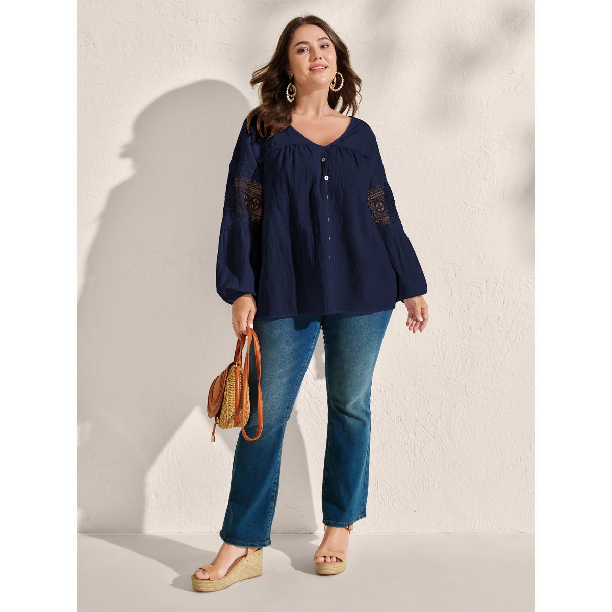 Plus Size Indigo Pure Cotton Sheer Lace Trim Blouse Women Boho Long Sleeve V-neck Vacation Blouses BloomChic 10/M