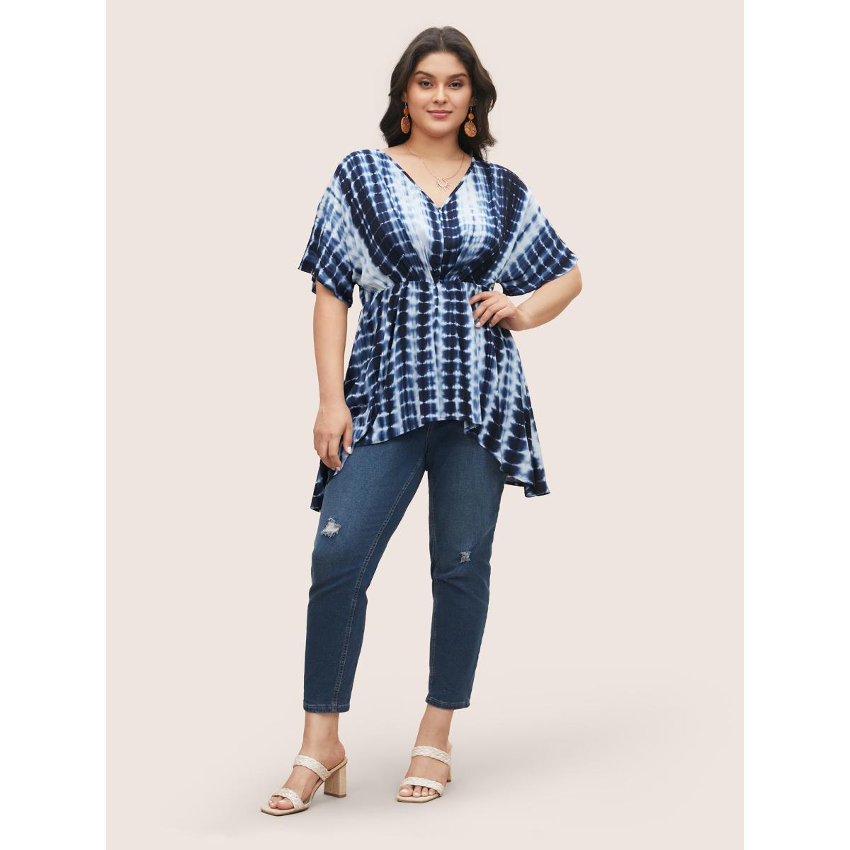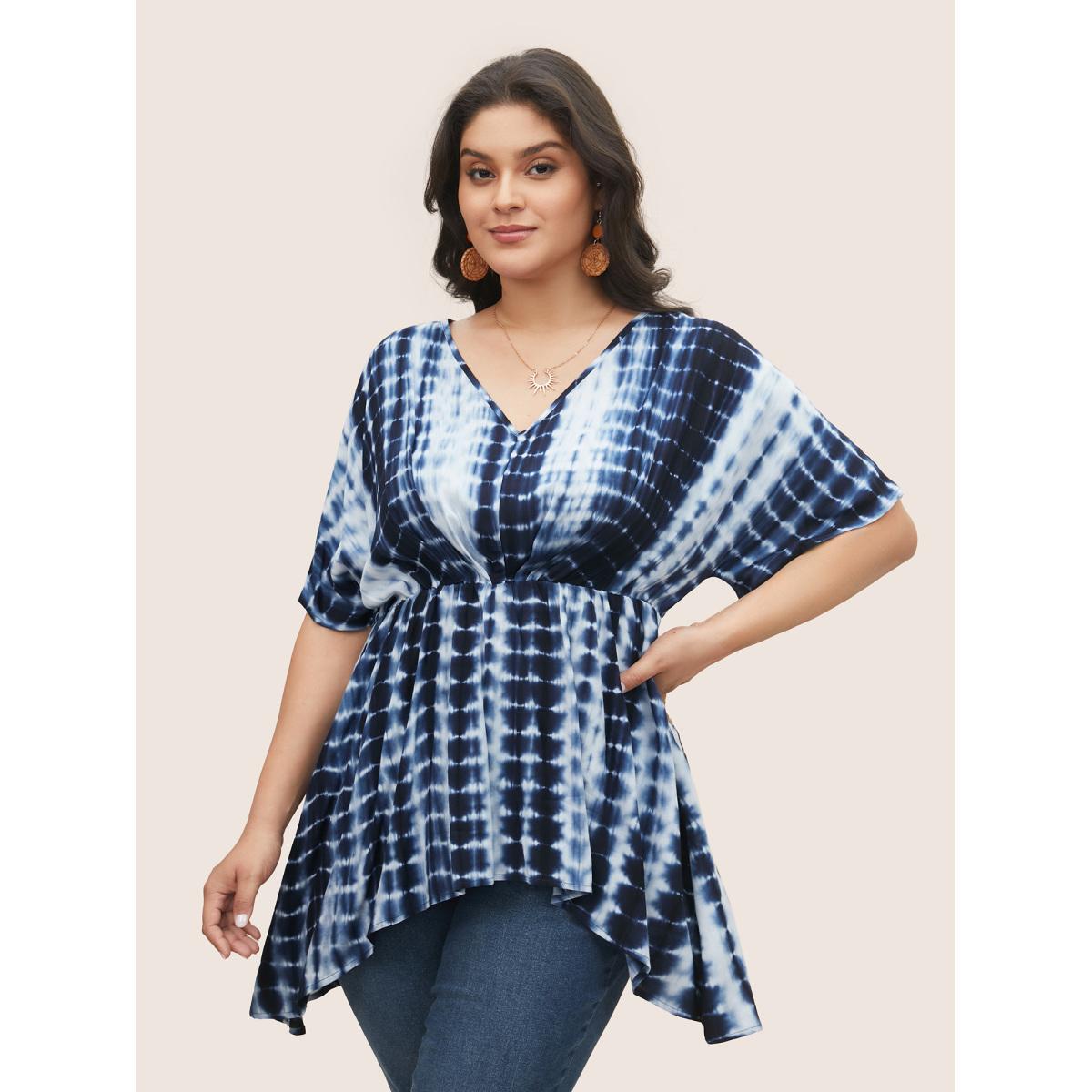 Plus Size Indigo Rayon Tie Dye Asymmetrical Hem Blouse Women Resort Half Sleeve V-neck Vacation Blouses BloomChic 12/L