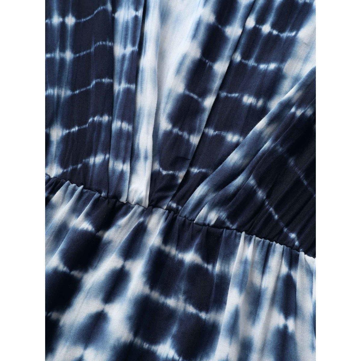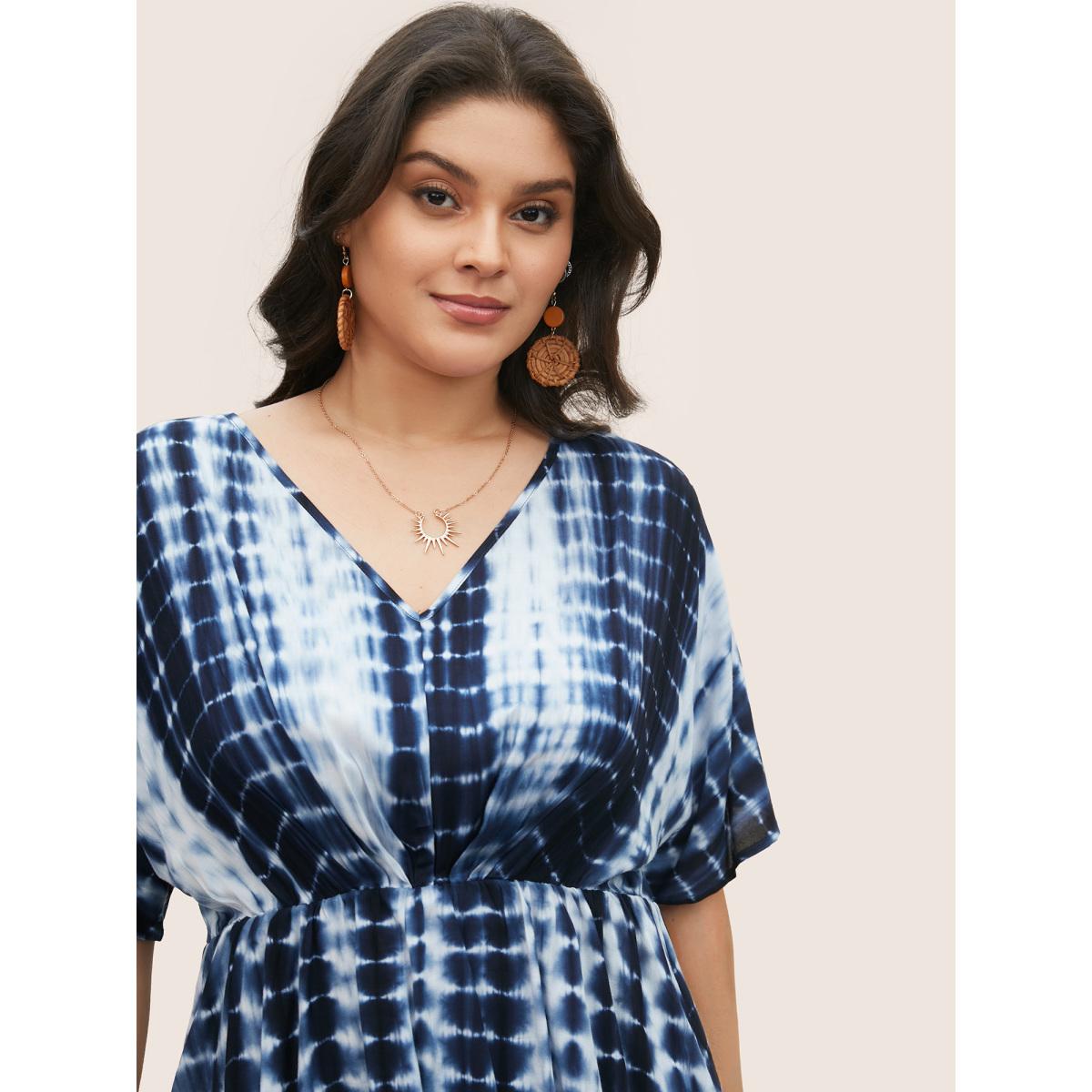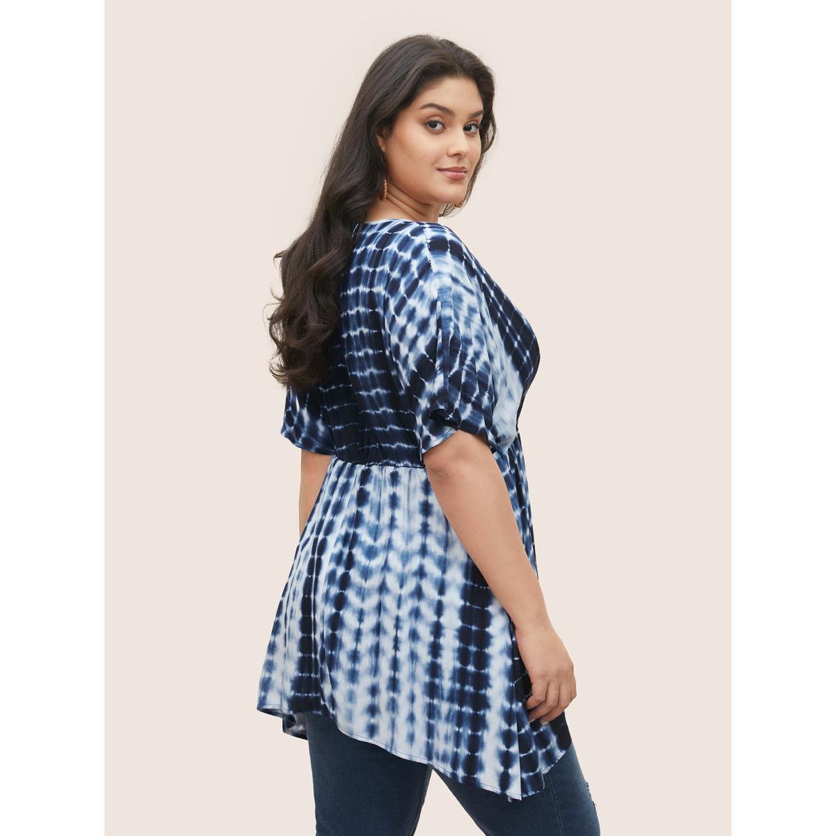 Plus Size Indigo Rayon Tie Dye Asymmetrical Hem Blouse Women Resort Half Sleeve V-neck Vacation Blouses BloomChic 12/L Product Image