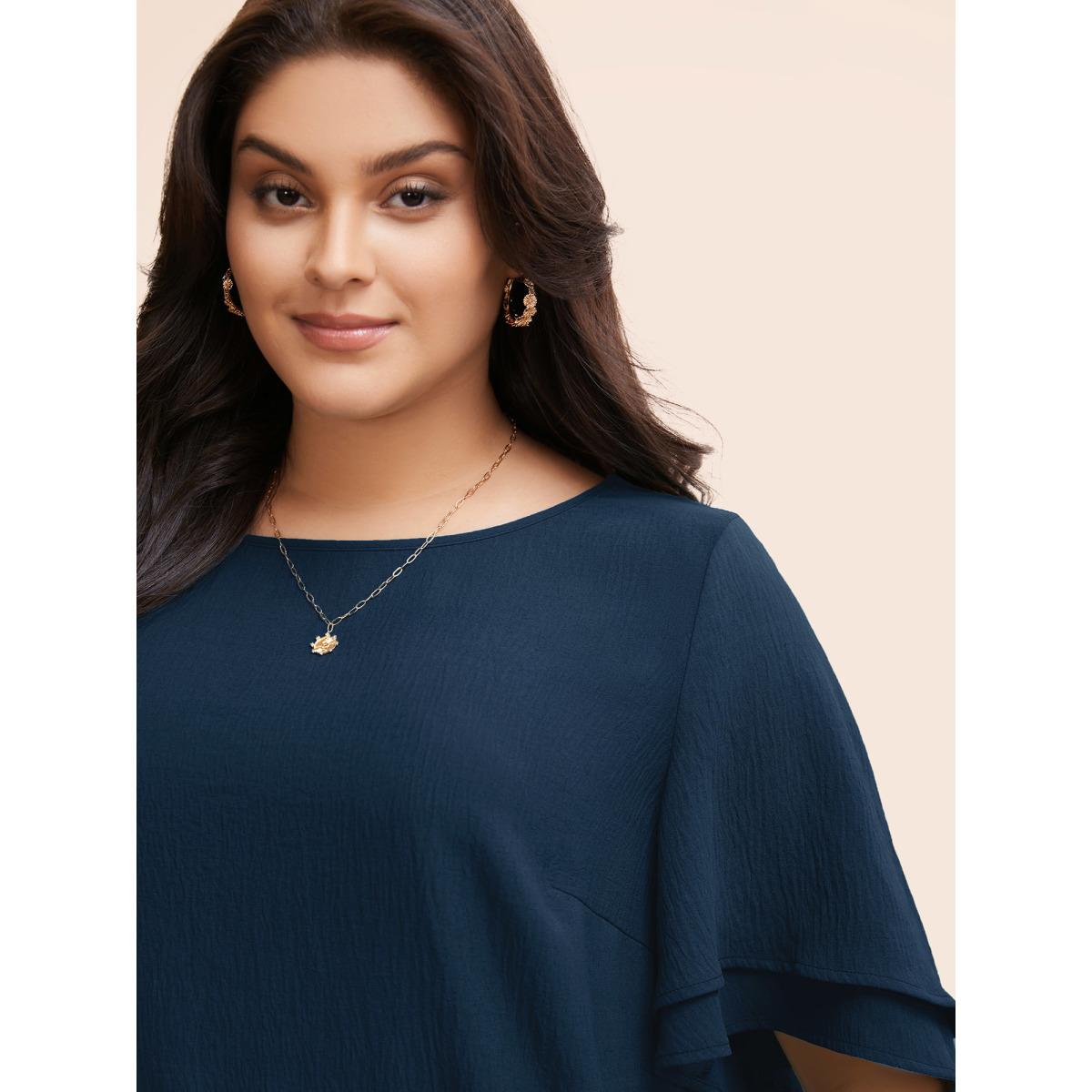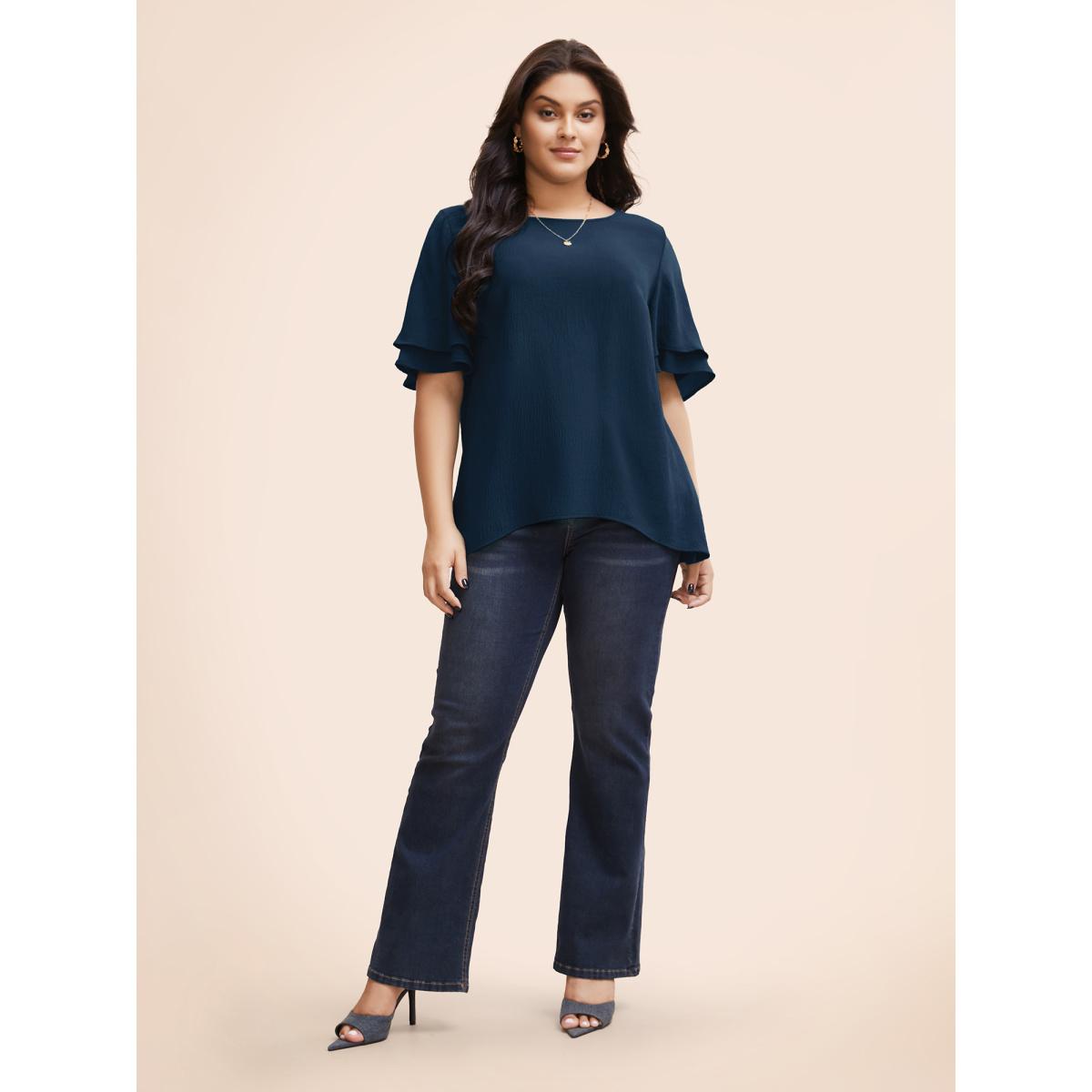 Plus Size Indigo Solid Tiered Ruffles Split Hem Blouse Women Timeless Half Sleeve Boat Neck Elegant Blouses BloomChic 12/L