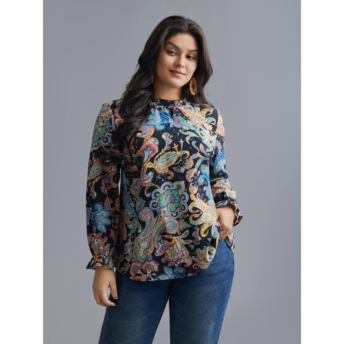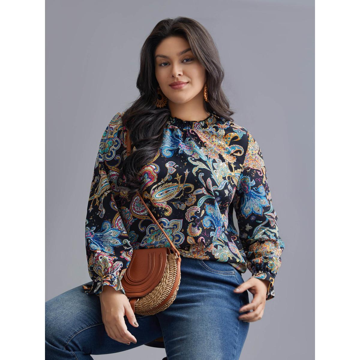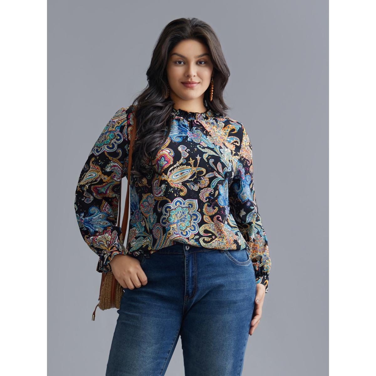 Plus Size Indigo Stand Collar Paisley Shirred Blouse Women Resort Long Sleeve Stand-up collar Vacation Blouses BloomChic 14-16/1X