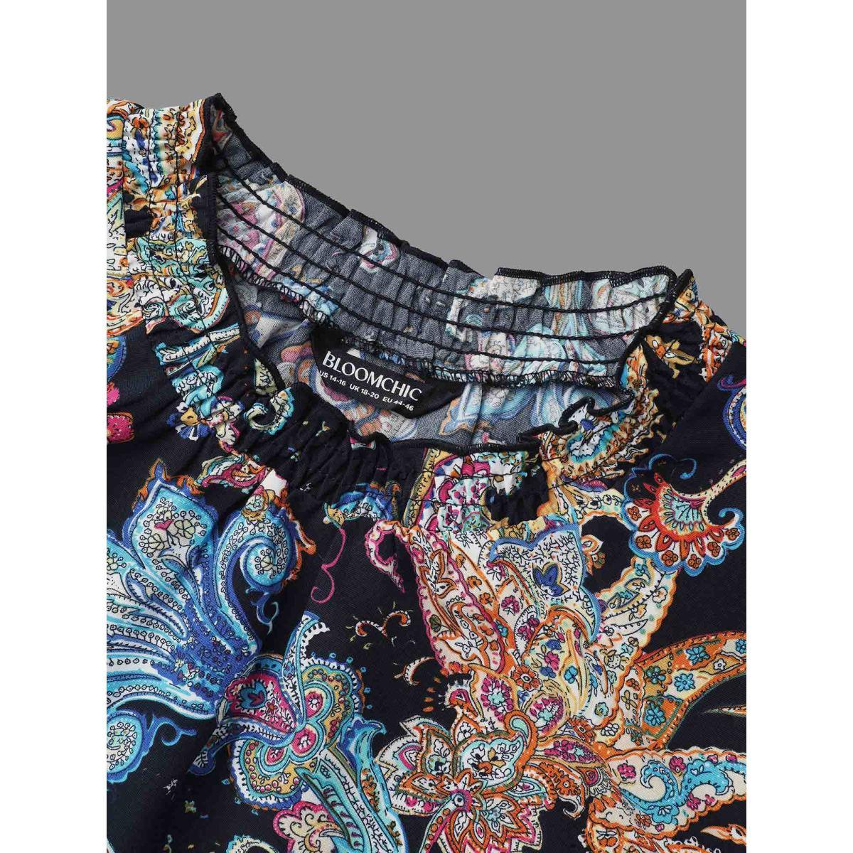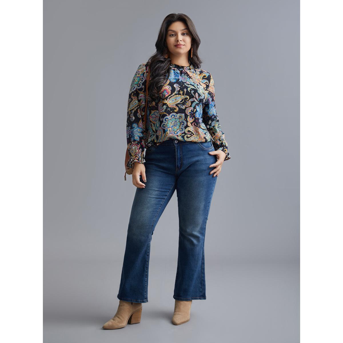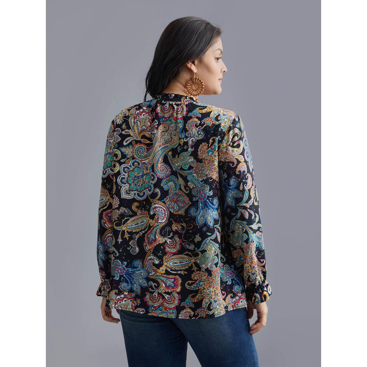 Plus Size Indigo Stand Collar Paisley Shirred Blouse Women Resort Long Sleeve Stand-up collar Vacation Blouses BloomChic 14-16/1X