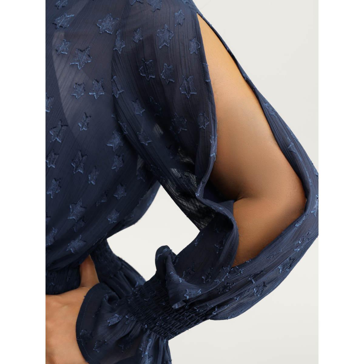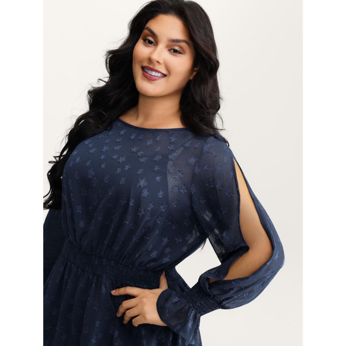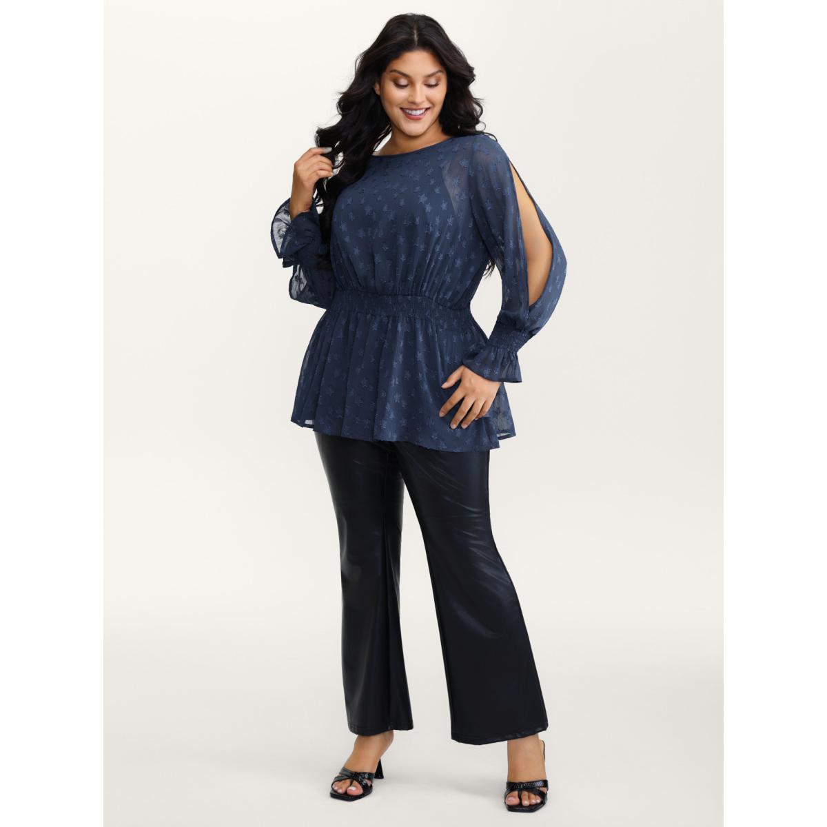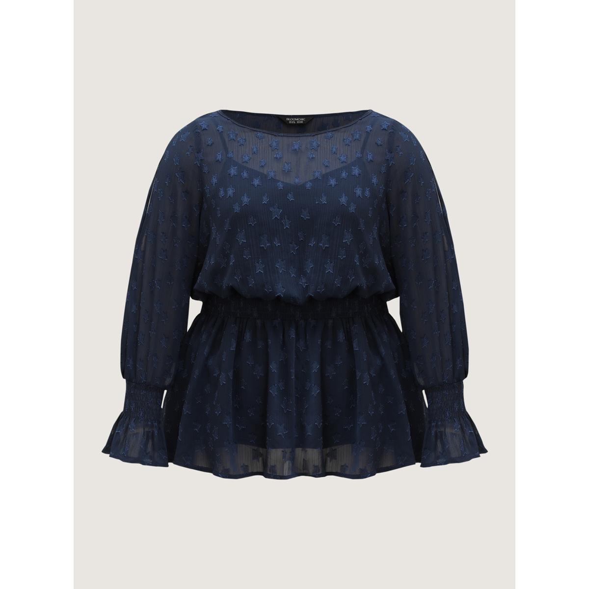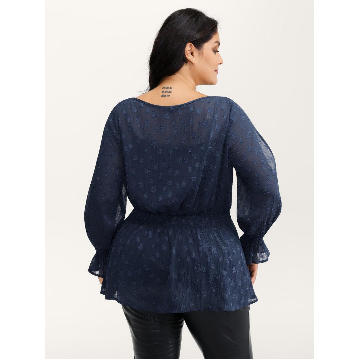 Plus Size Indigo Star Jacquard Print Shirred Ruffled Blouse Women Party&Cocktail Extra Long Sleeve Boat Neck Party Blouses BloomChic 14-16/1X
