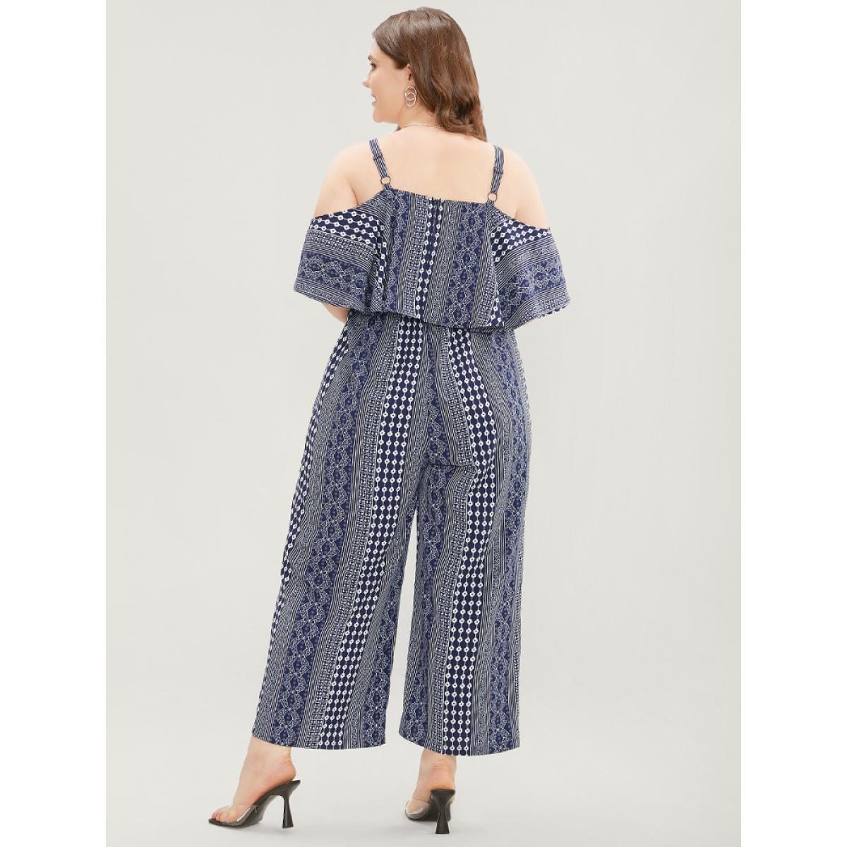 Plus Size Indigo Striped Geometric Pocket Ruffles Cold Shoulder Jumpsuit Women Vacation Short sleeve Cold Shoulder Dailywear Loose Jumpsuits BloomChic 14-16/1X