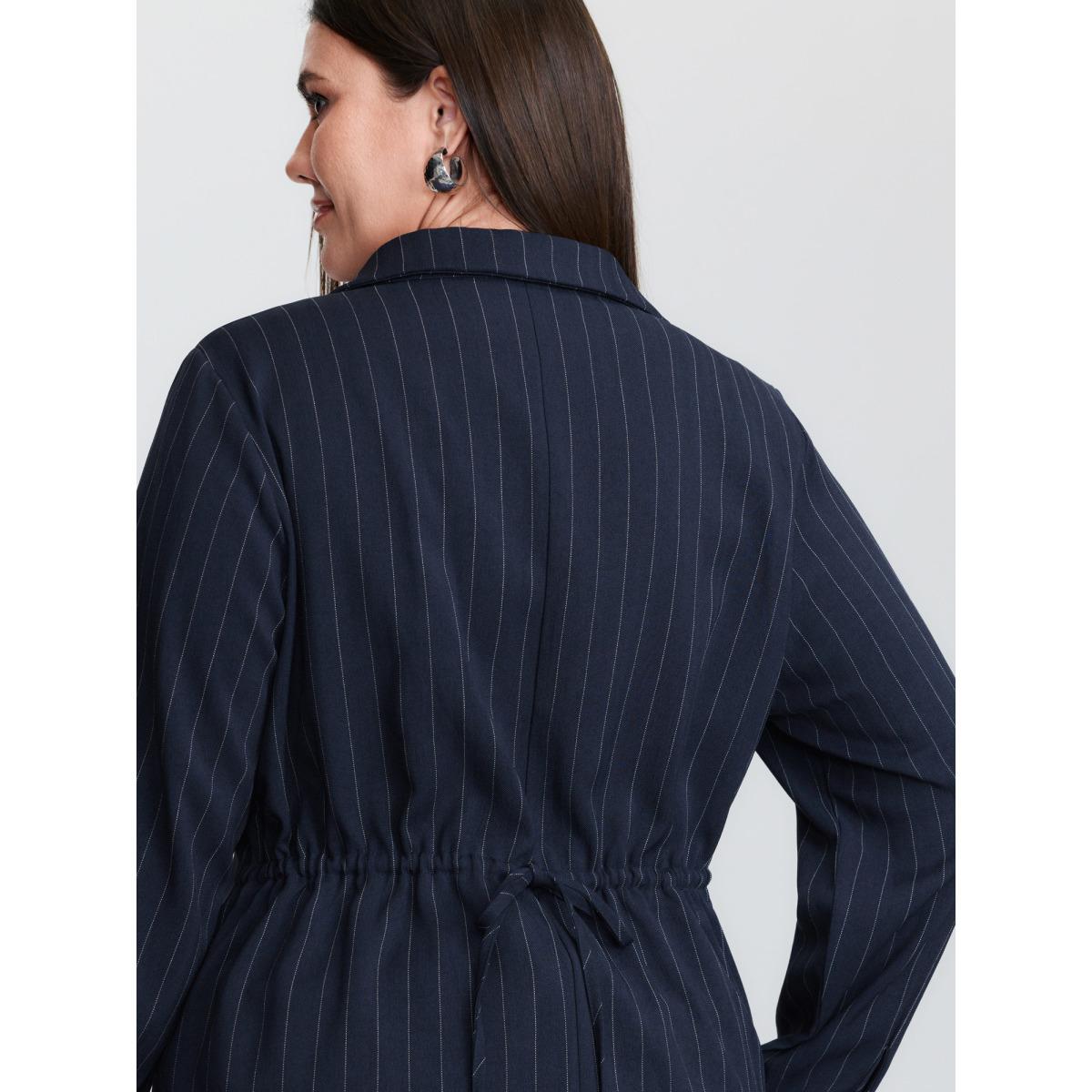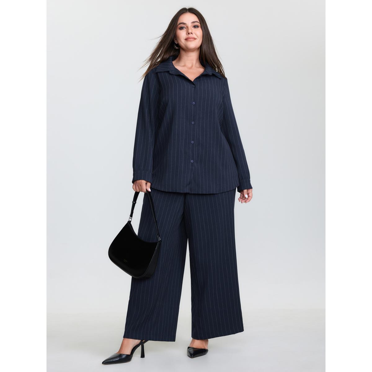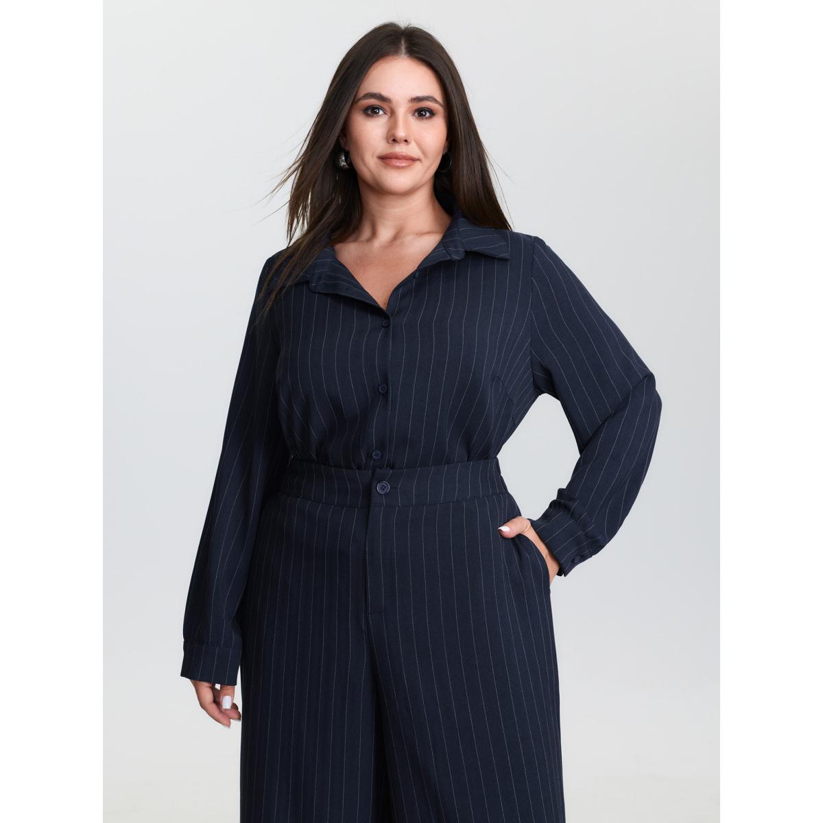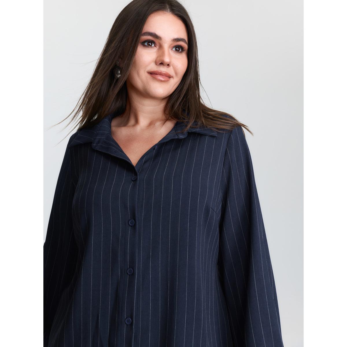 Plus Size Indigo Striped Waist-Tie Button-Down Blouse Women Office Extra Long Sleeve Shirt collar Office Blouses BloomChic 30/6X