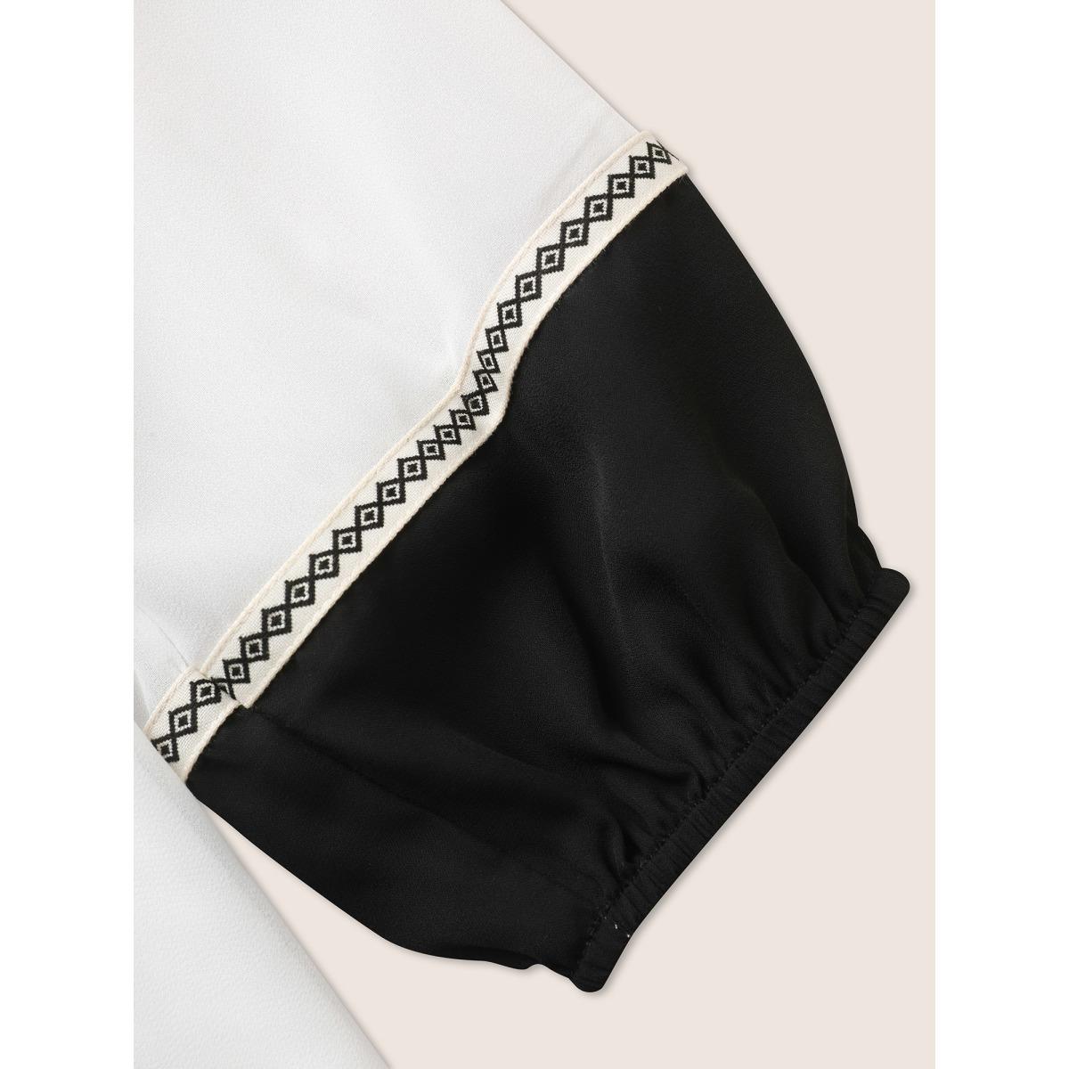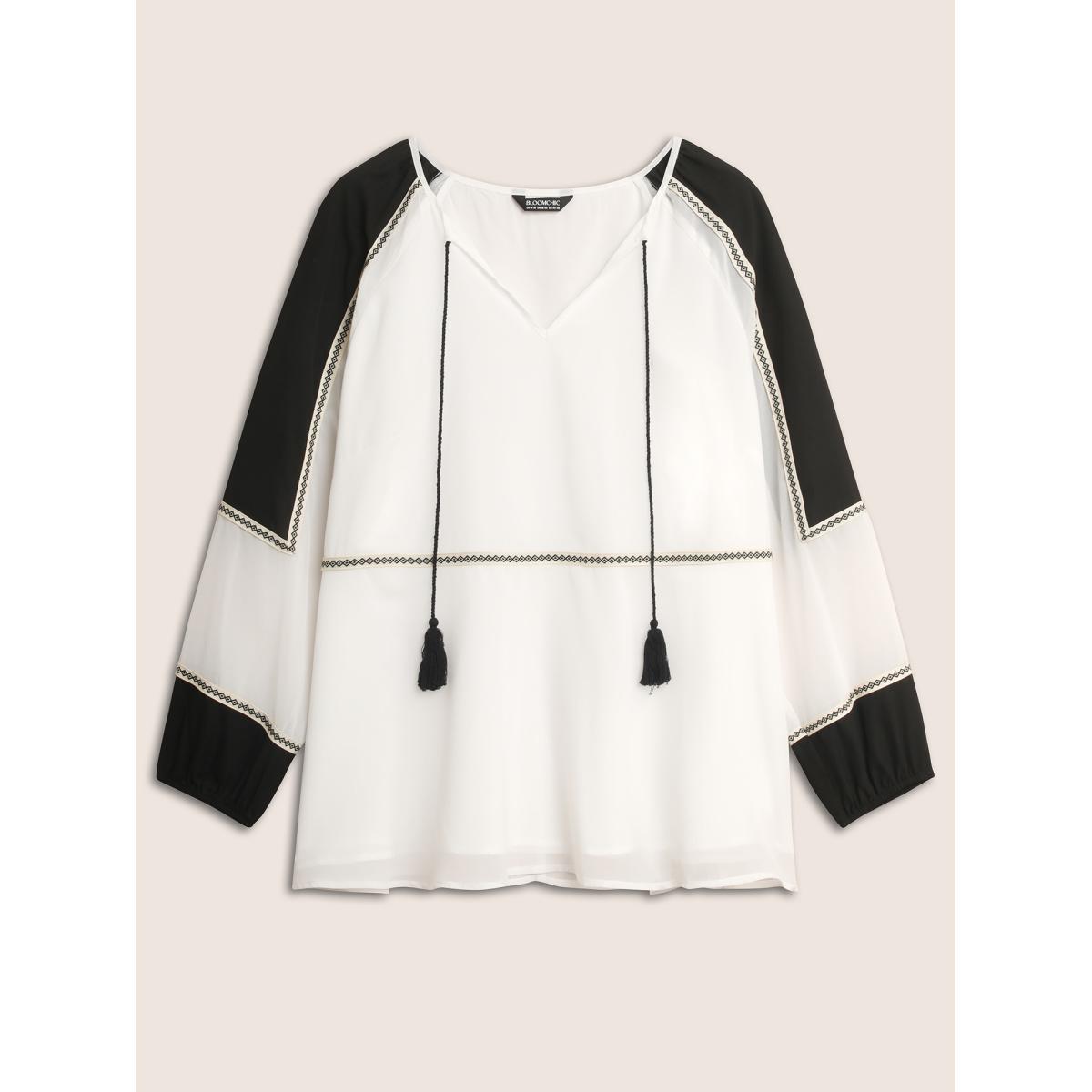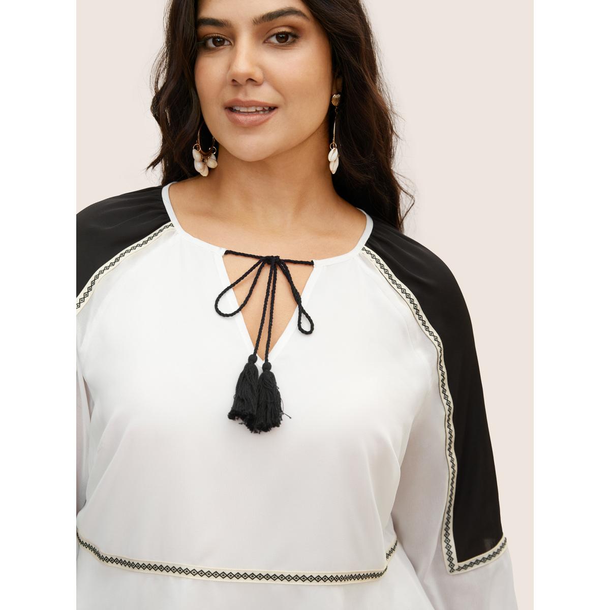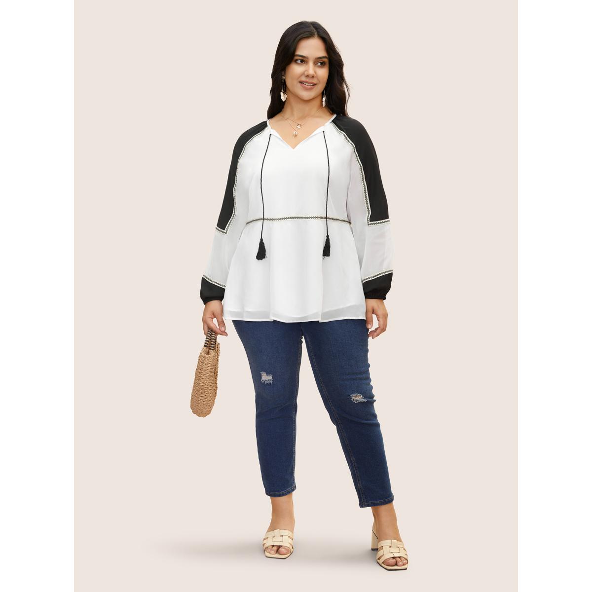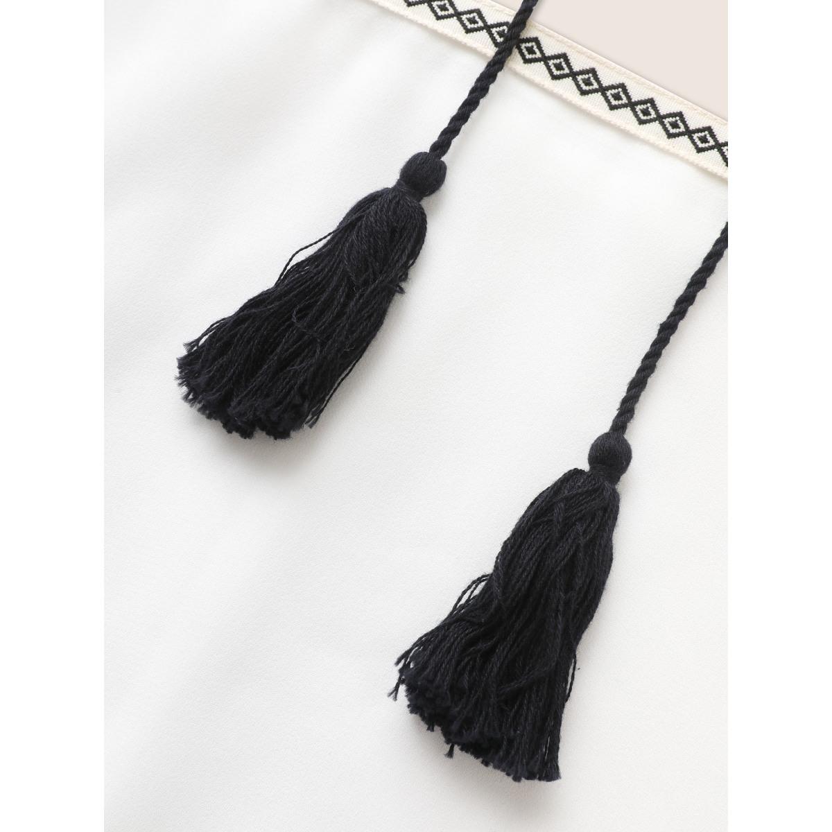 Plus Size Ivory Bandana Contrast Webbing Tassel Tie Knot Blouse Women Resort Long Sleeve V-neck Vacation Blouses BloomChic 12/L