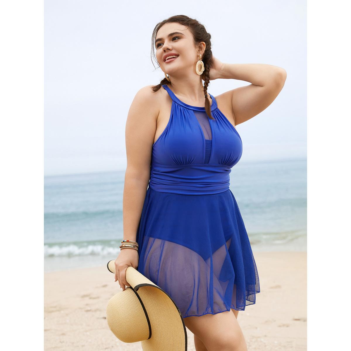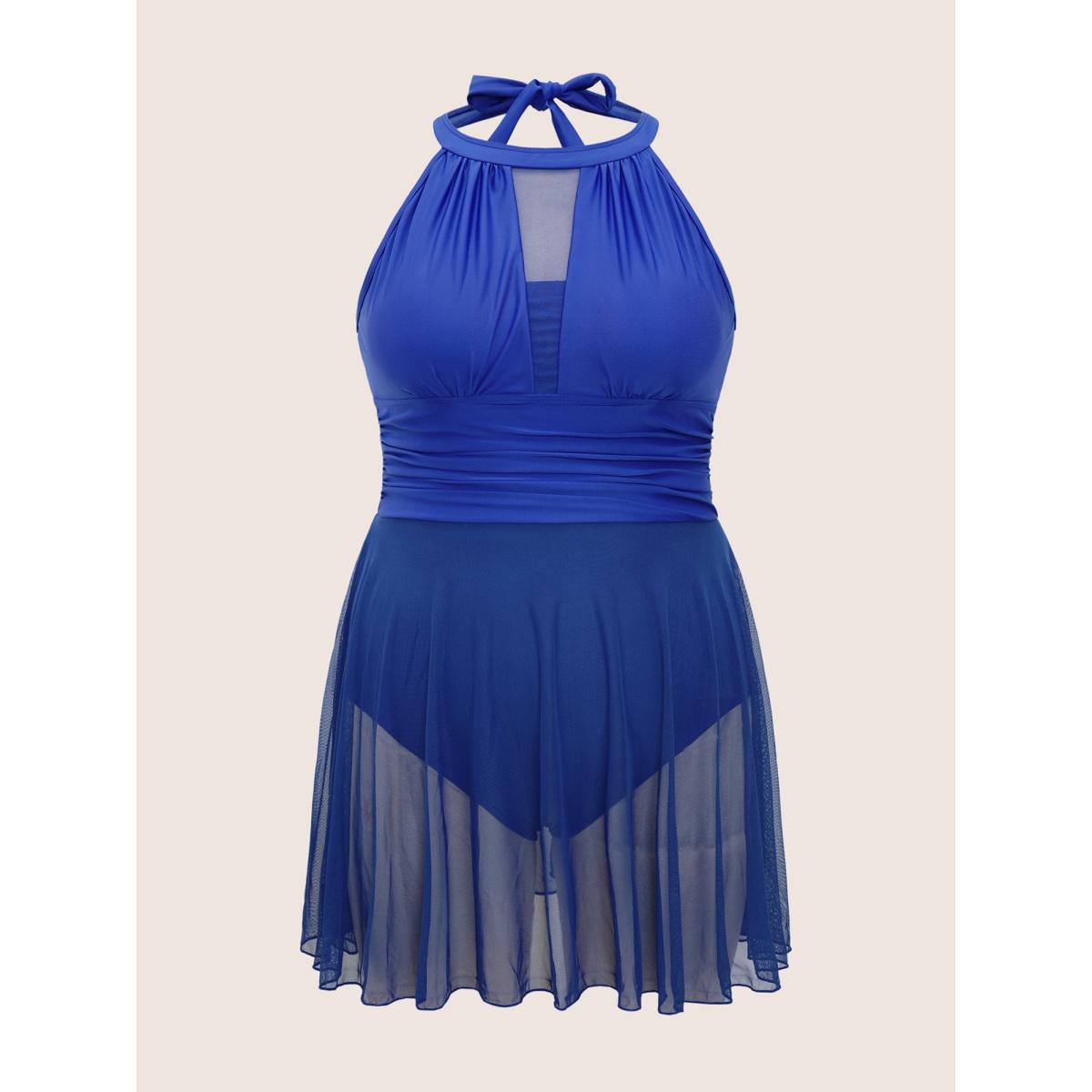 Plus Size Knotted Back Mesh Insert Halter Swim Dress Women's Swimwear Blue Beach Bodycon Round Neck High stretch Curve Swim Dresses BloomChic 10/M