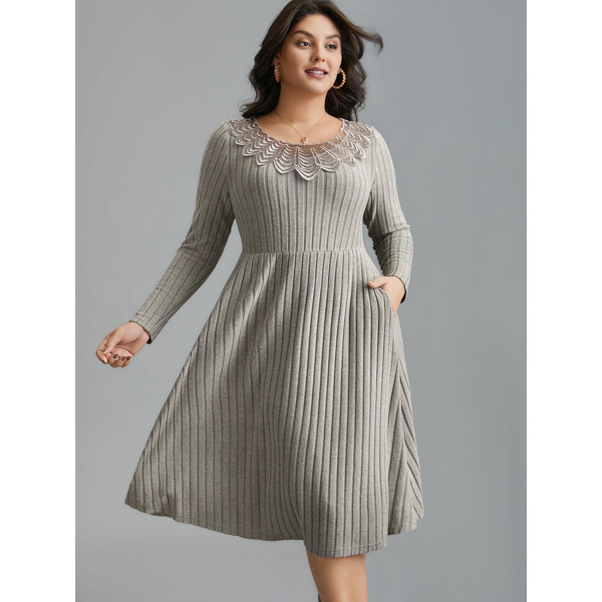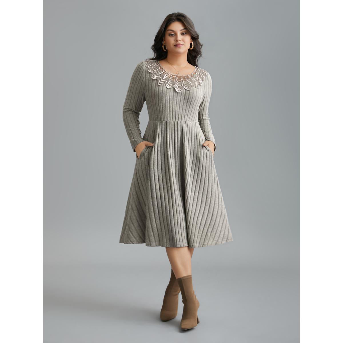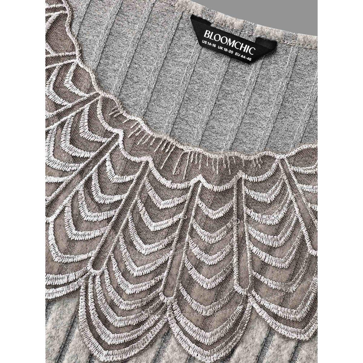 Plus Size Lace Neck Patchwork Ribbed Knit Dress LightGray Women Timeless Woven ribbon&lace trim Knit Dresses Bloomchic 18-20/2X