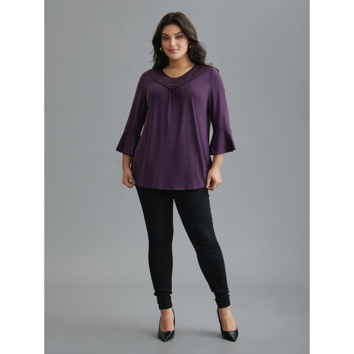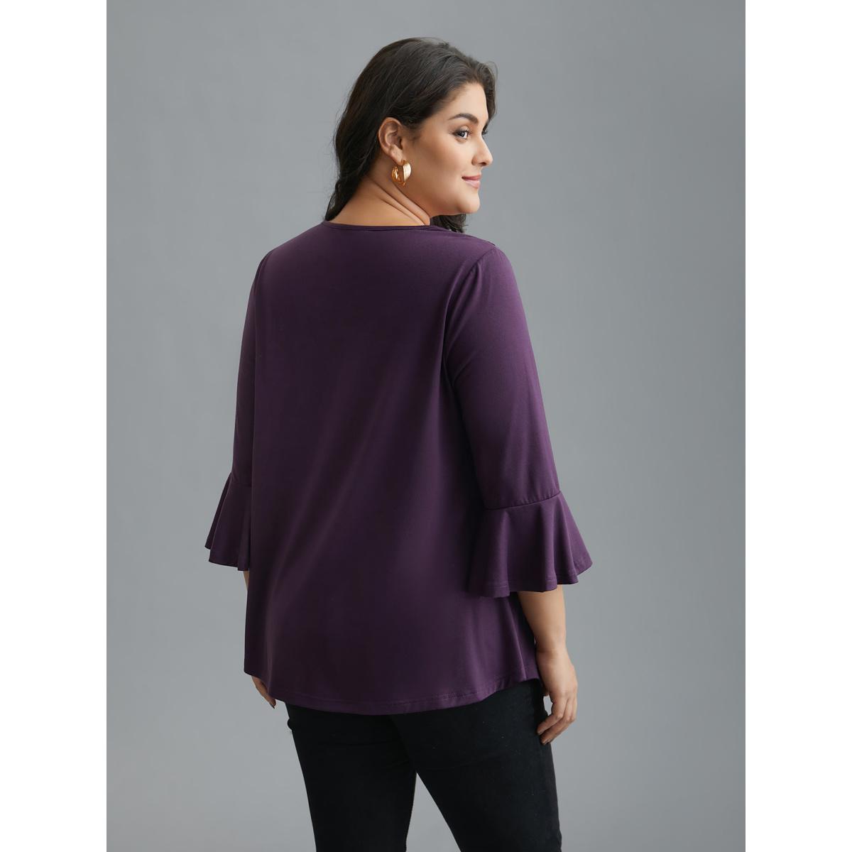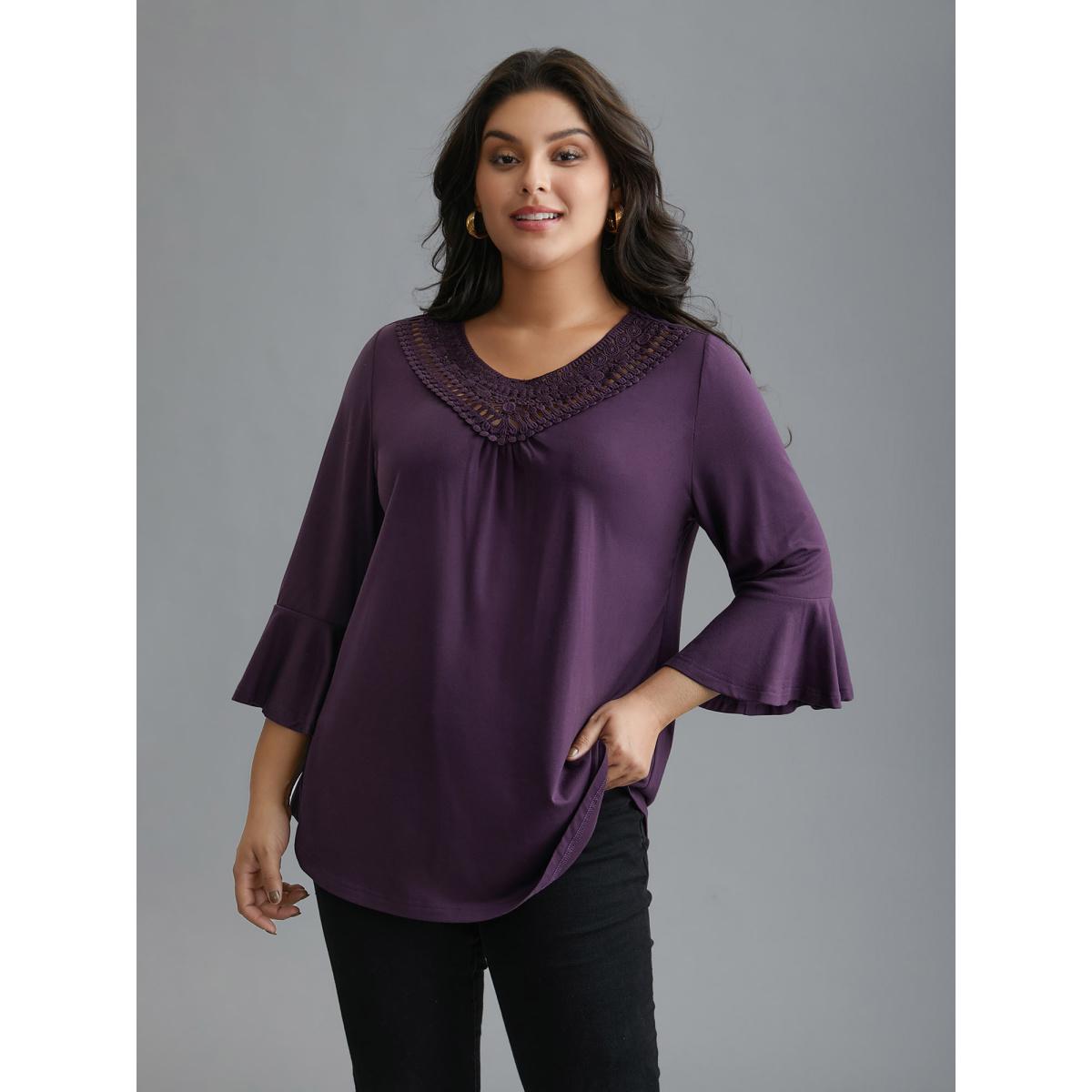 Plus Size Lace Neckline Trim Ruffle Sleeve T-shirt Eggplant Women Elegant Gathered Round Neck Loose Everyday T-shirts BloomChic 22-24/3X