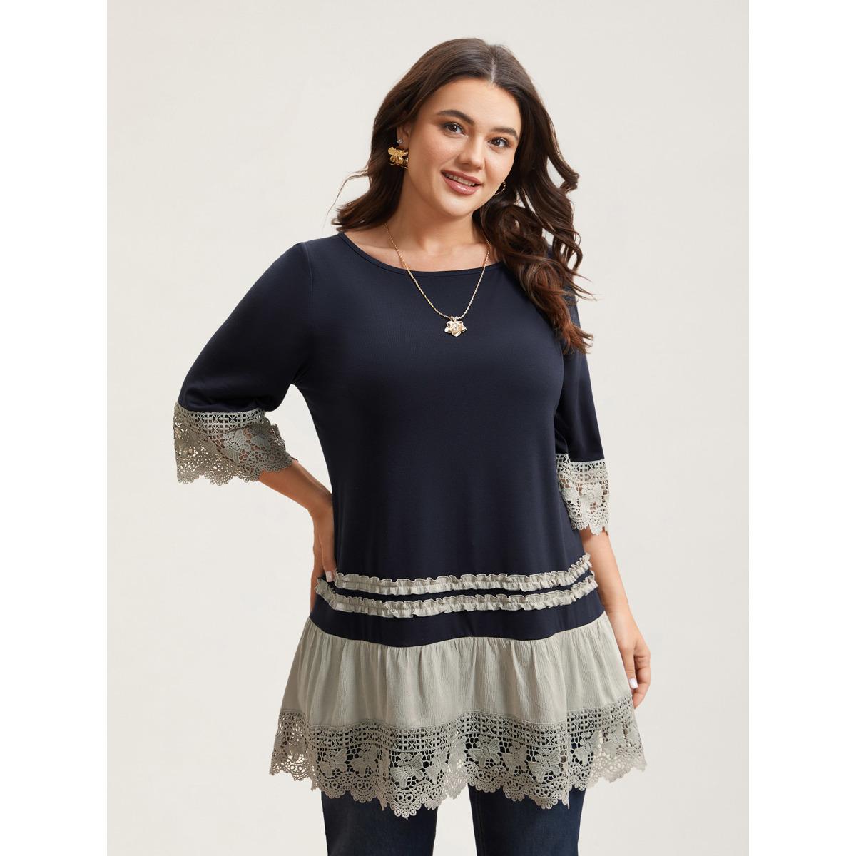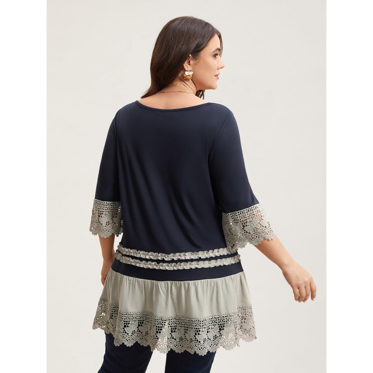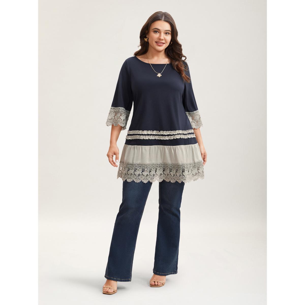 Plus Size Lace Panel Color Contrast Tunic T-Shirt Navy Women Elegant Woven ribbon&lace trim Boat Neck Loose Everyday T-shirts BloomChic 12/L