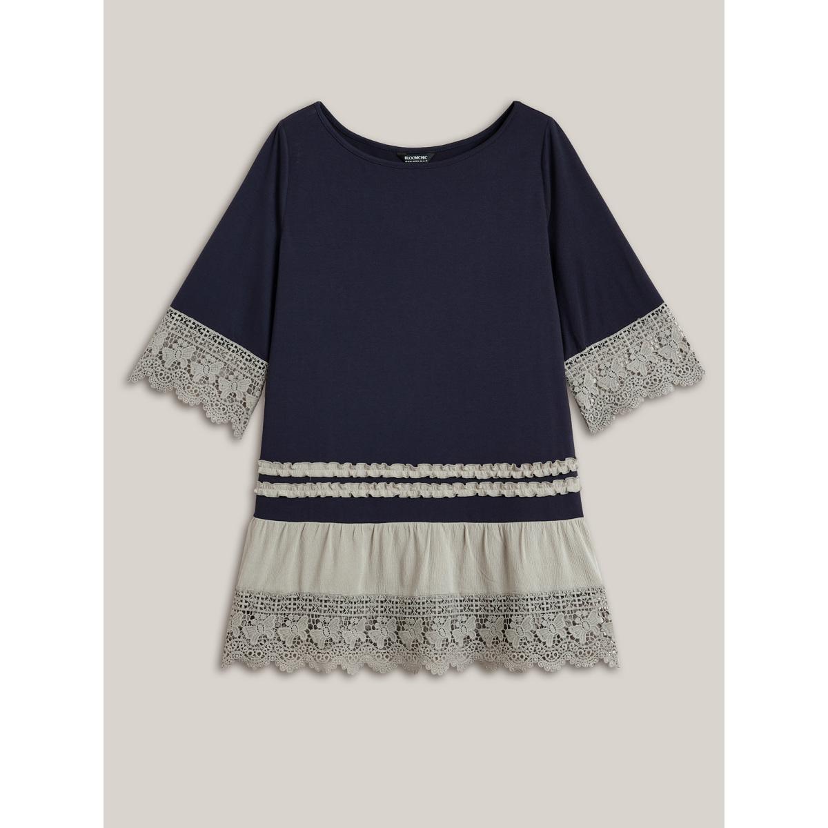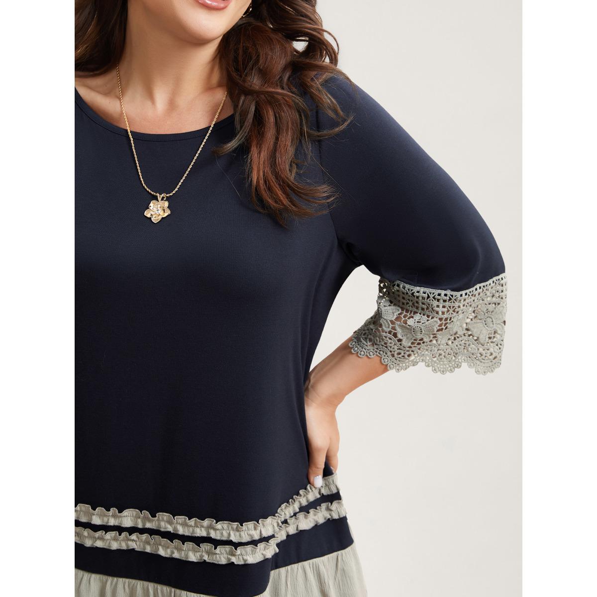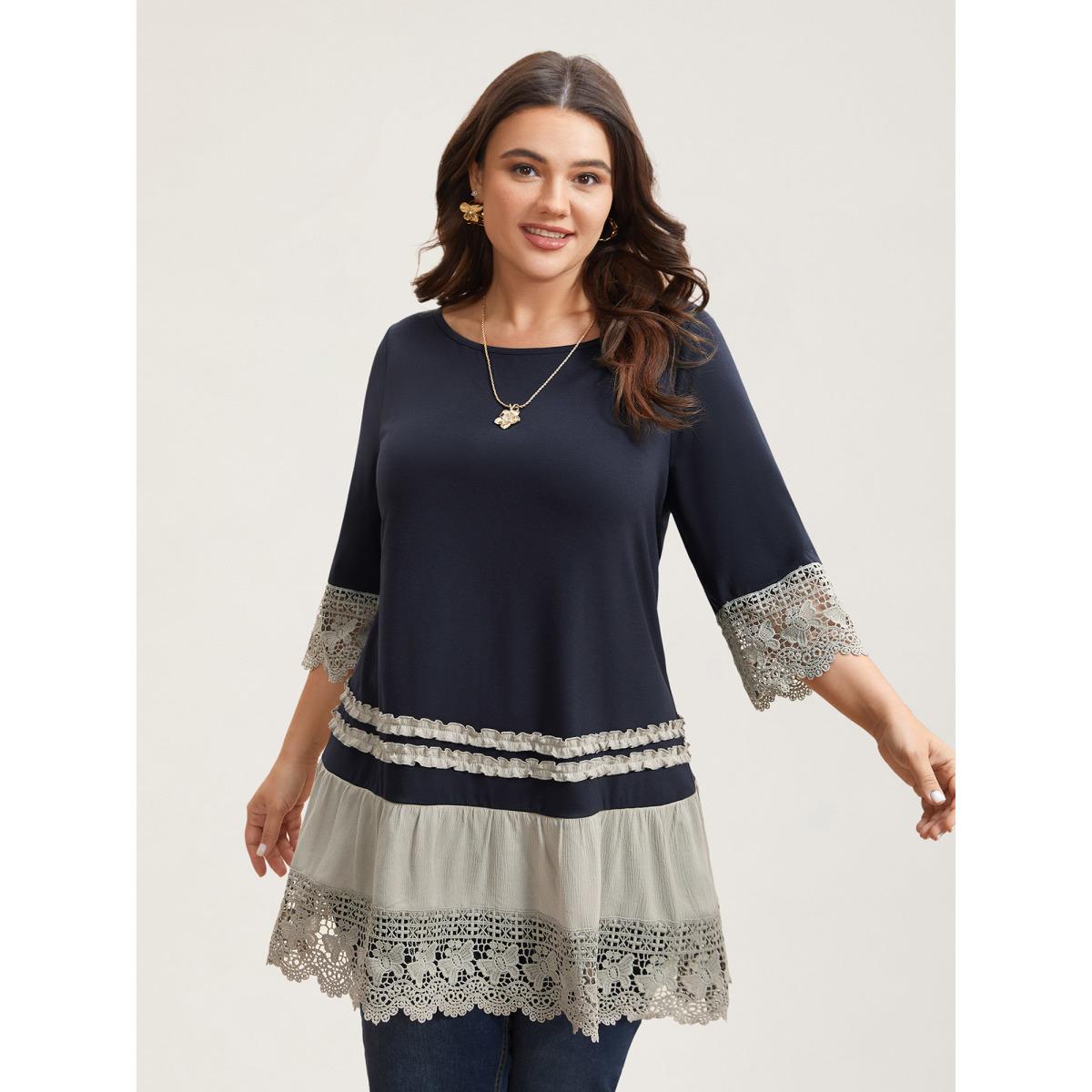 Plus Size Lace Panel Color Contrast Tunic T-Shirt Navy Women Elegant Woven ribbon&lace trim Boat Neck Loose Everyday T-shirts BloomChic 12/L