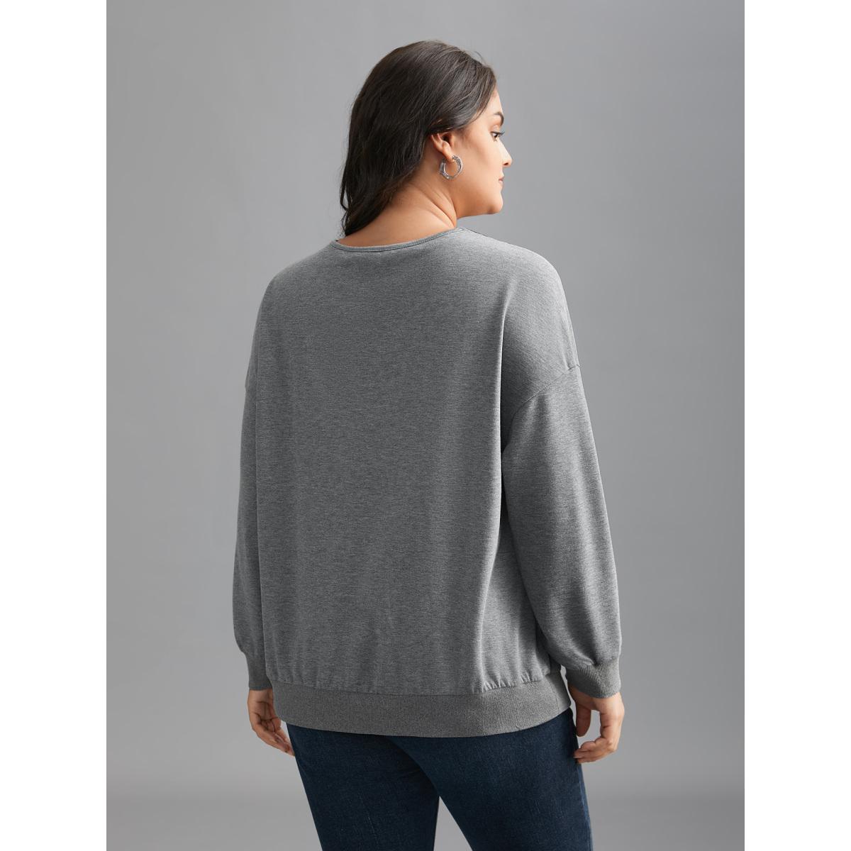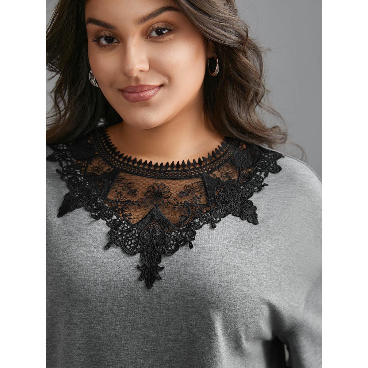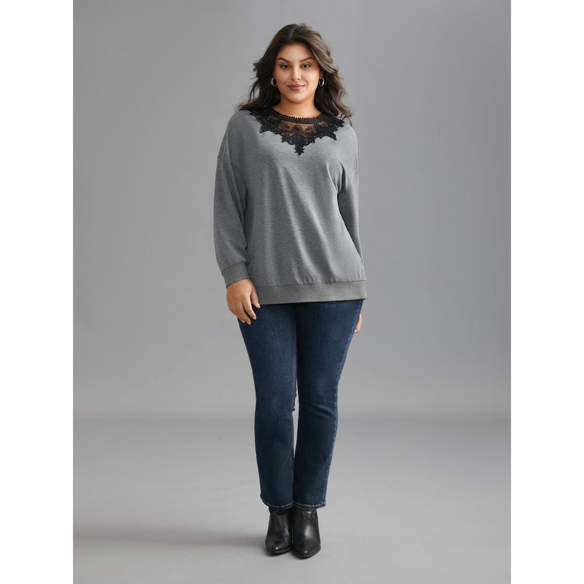 Plus Size Lace Panel Round Neck Contrast Sweatshirt Women DarkGray Elegant Woven ribbon&lace trim Round Neck Everyday Sweatshirts BloomChic 12/L