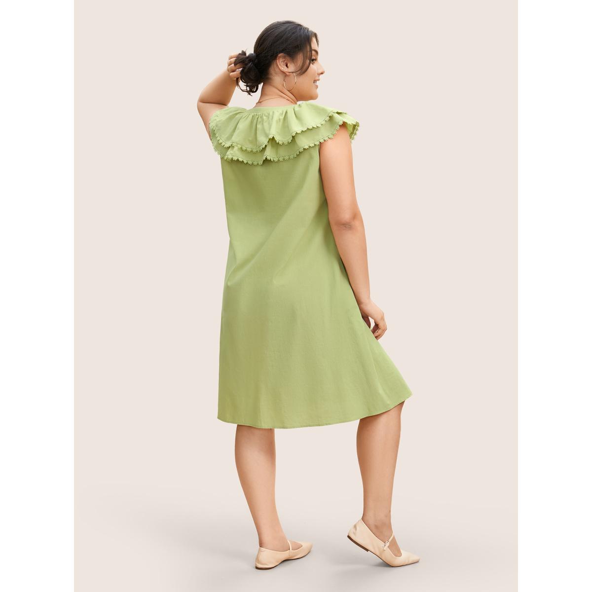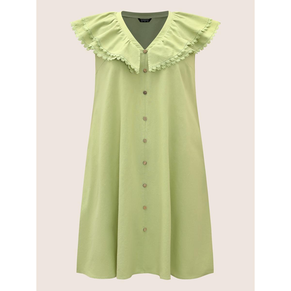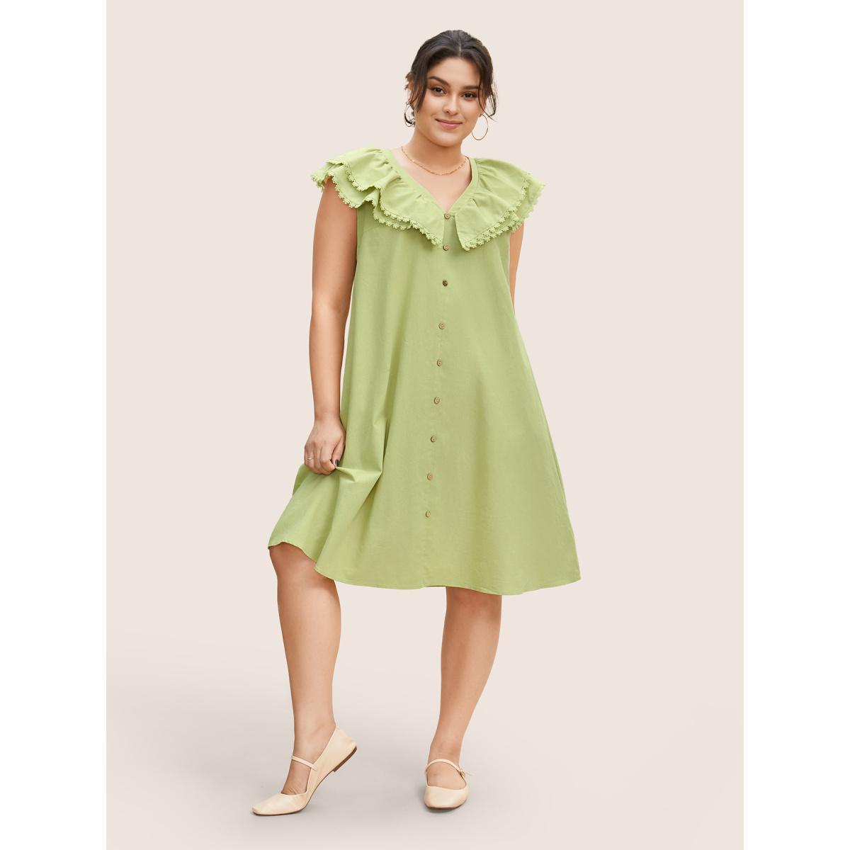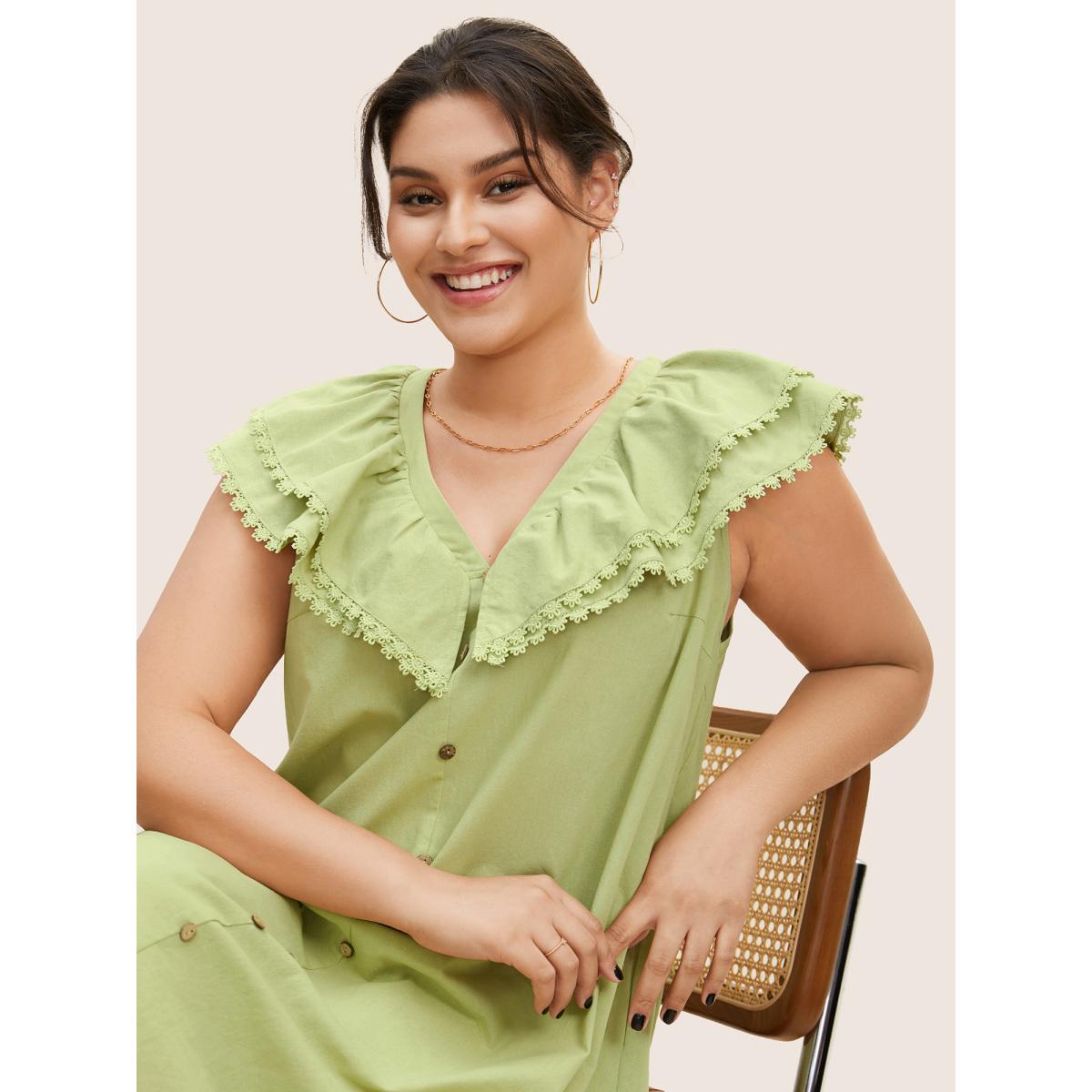 Plus Size Lace Patchwork Button Detail Tiered Ruffles Dress LightGreen Women Casual Woven ribbon&lace trim V-neck Sleeveless Curvy BloomChic 14-16/1X