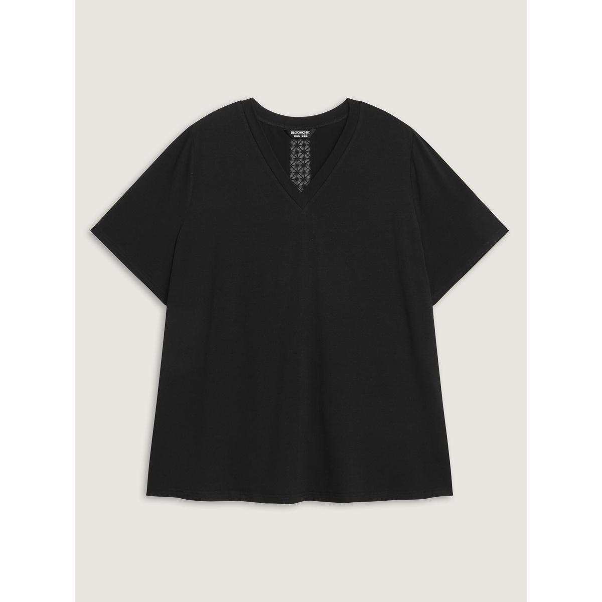 Plus Size Supersoft Stretchy Scalloped Neck Solid T-Shirt Black Women Leisure Woven ribbon&lace trim V-neck Casual T-shirts BloomChic 28/5X
