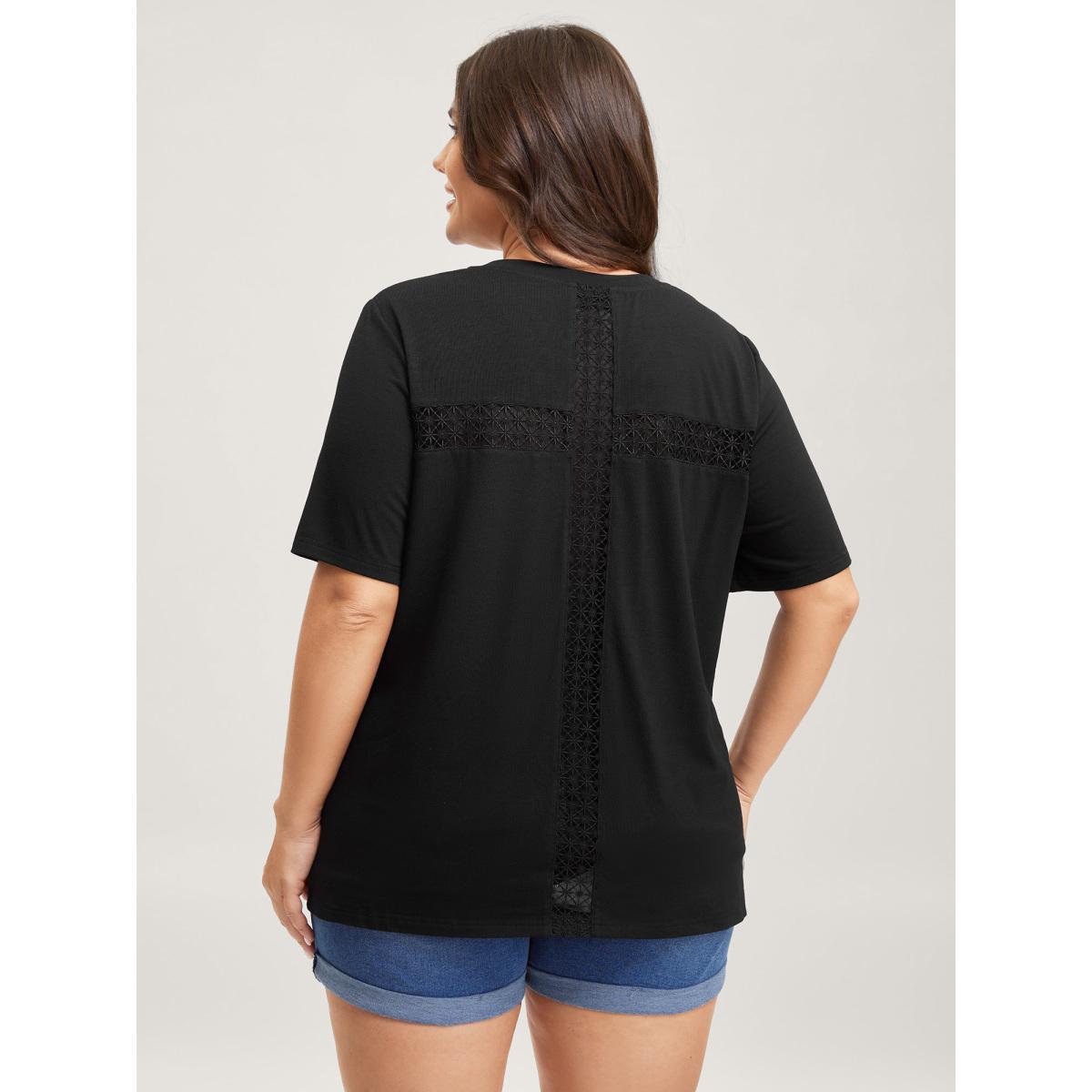 Plus Size Back Lace Cut-Out V-Neck T-Shirt Black Women Romantic Patchwork V-neck Elegant T-shirts BloomChic 12/L