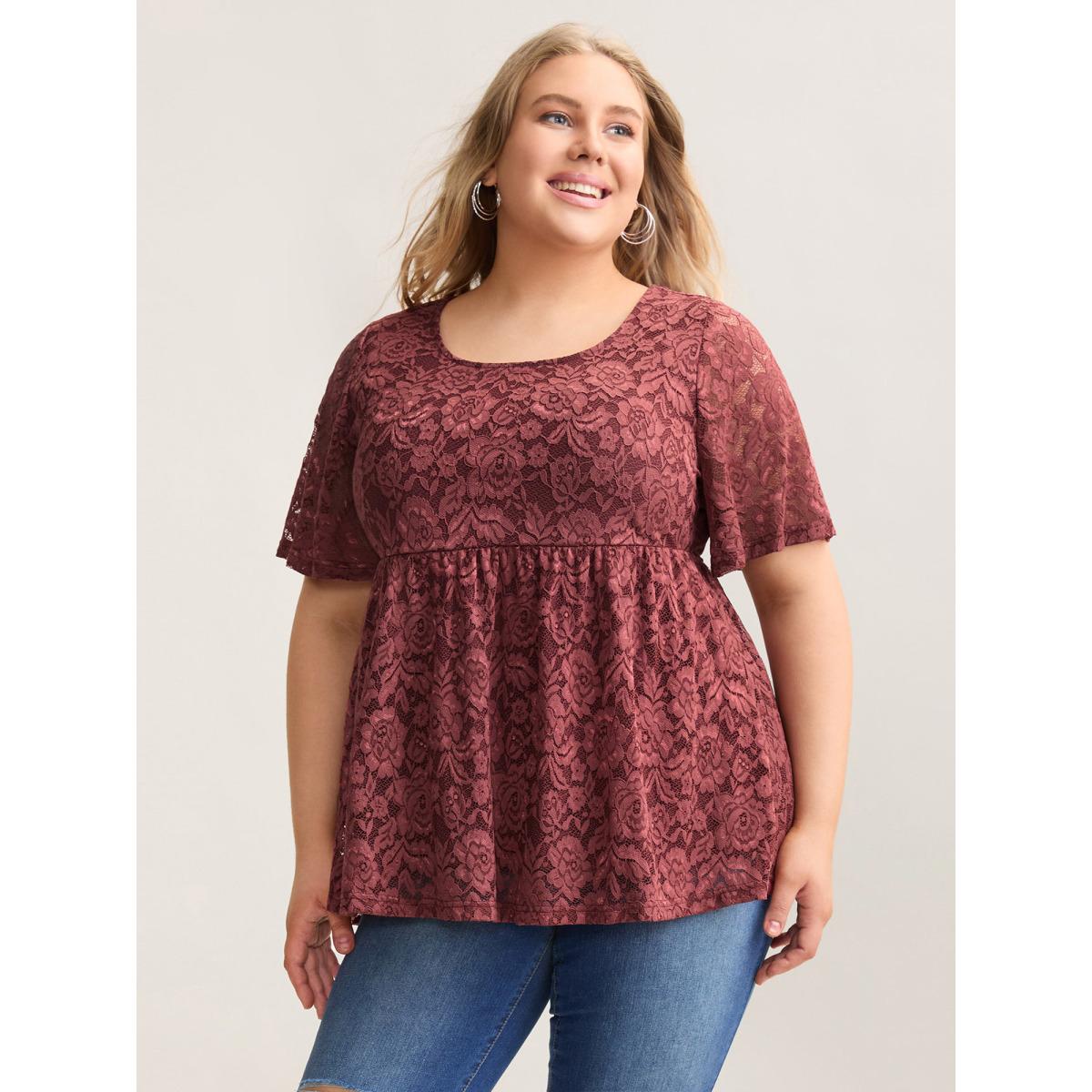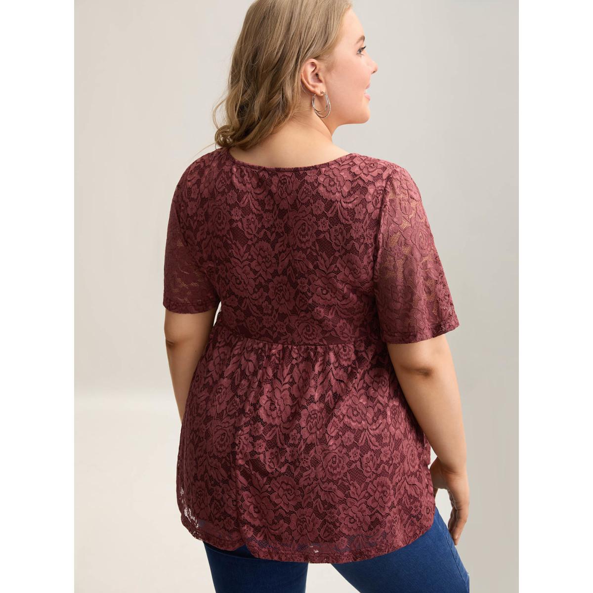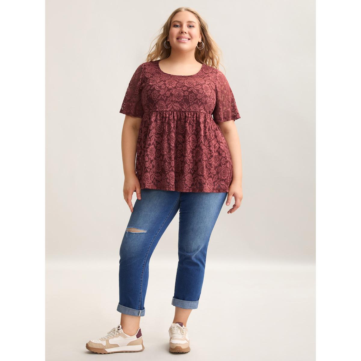 Plus Size Lace Round Neck Babydoll Top Russet Women Casual Gathered Round Neck Bodycon Everyday T-shirts BloomChic 12/L