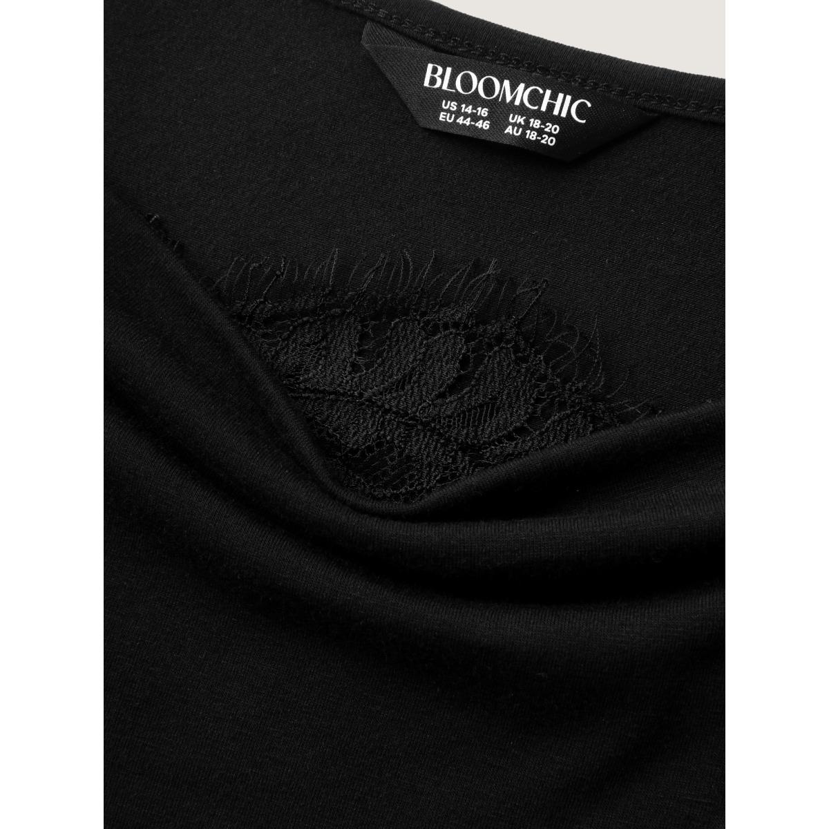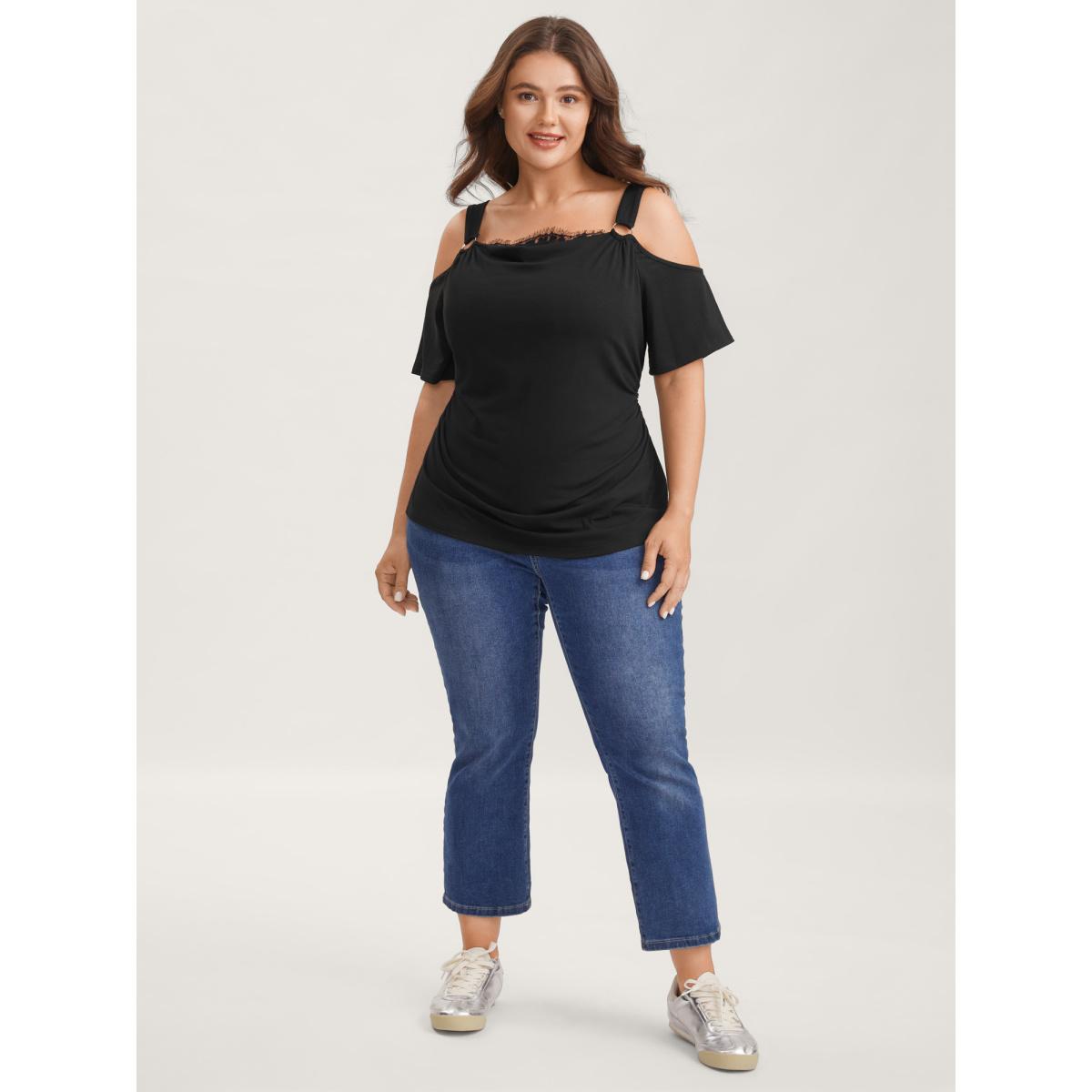 Plus Size Lace Trim Cowl Neck Off-Shoulder T-Shirt Black Women Cowl Neck Everyday-Casual T-shirts BloomChic 10/M