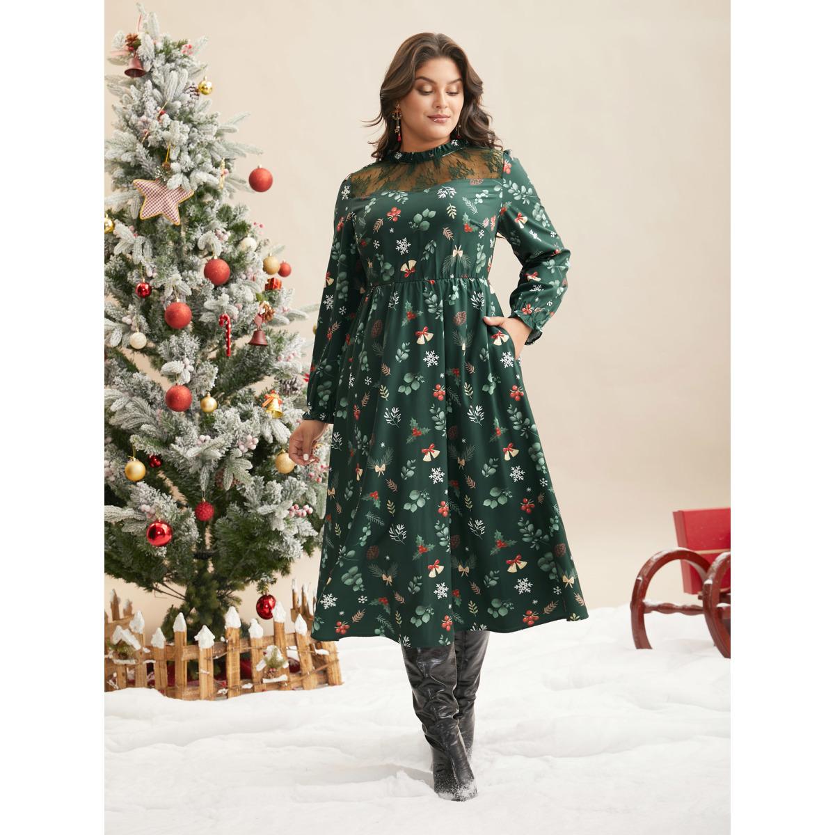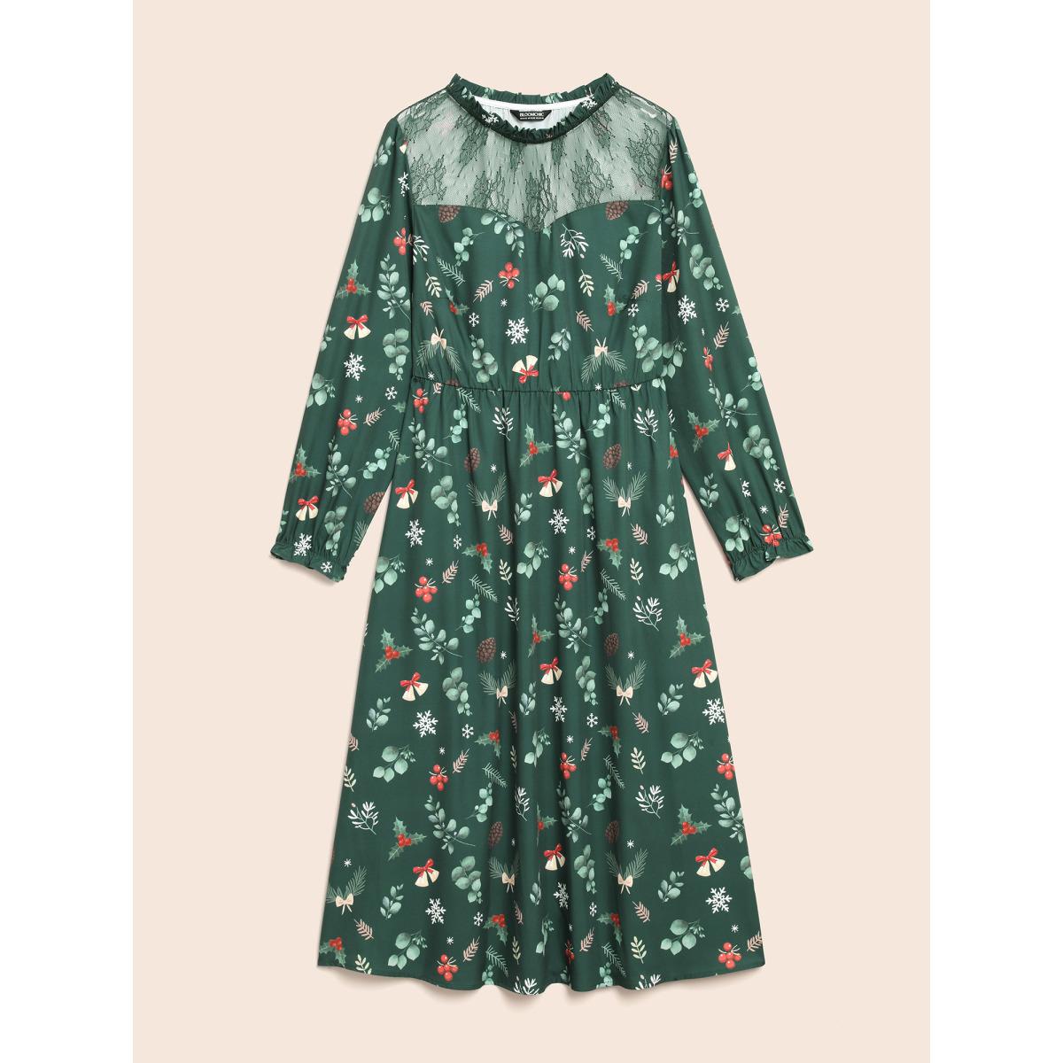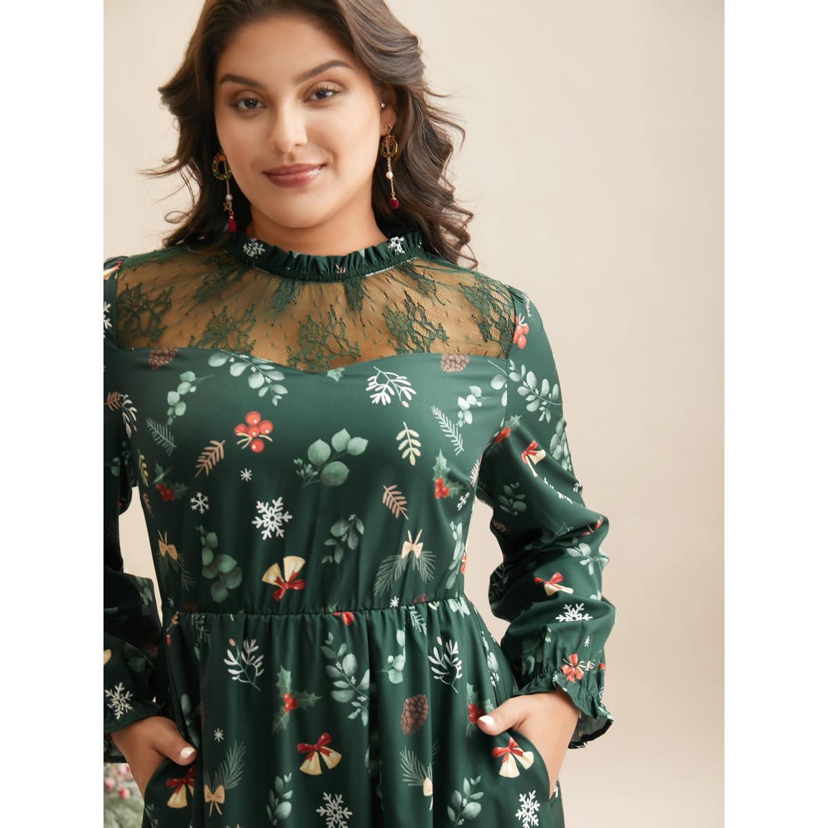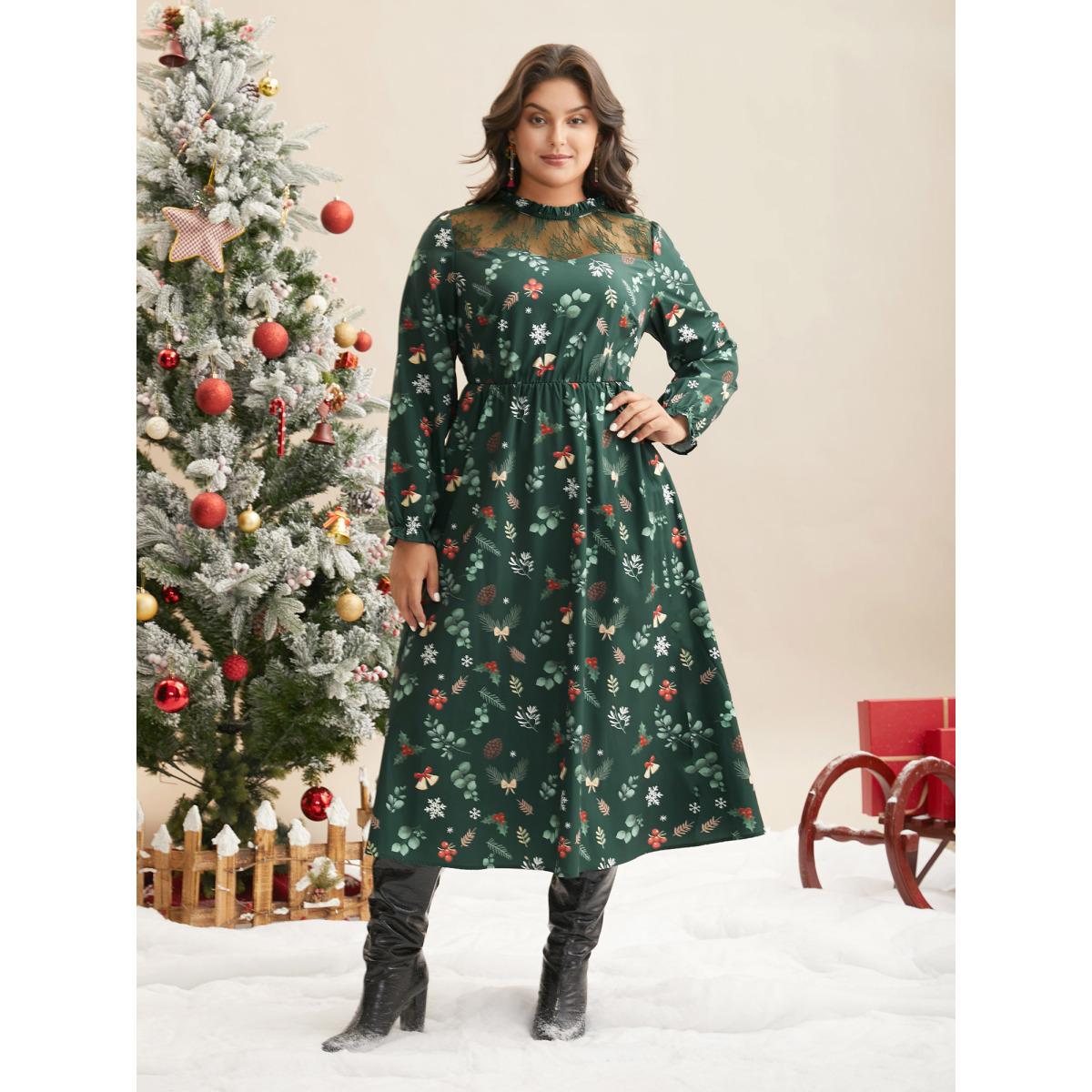 Plus Size Lace Trim Sheer Neckline Midi Dress Truegreen Women Elegant Woven ribbon&lace trim Mock Neck Long Sleeve Curvy BloomChic 30/6X