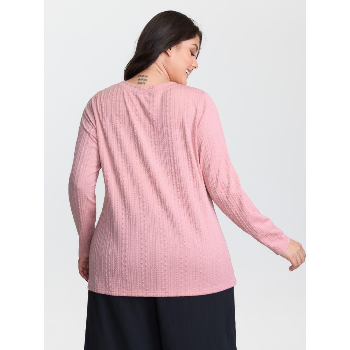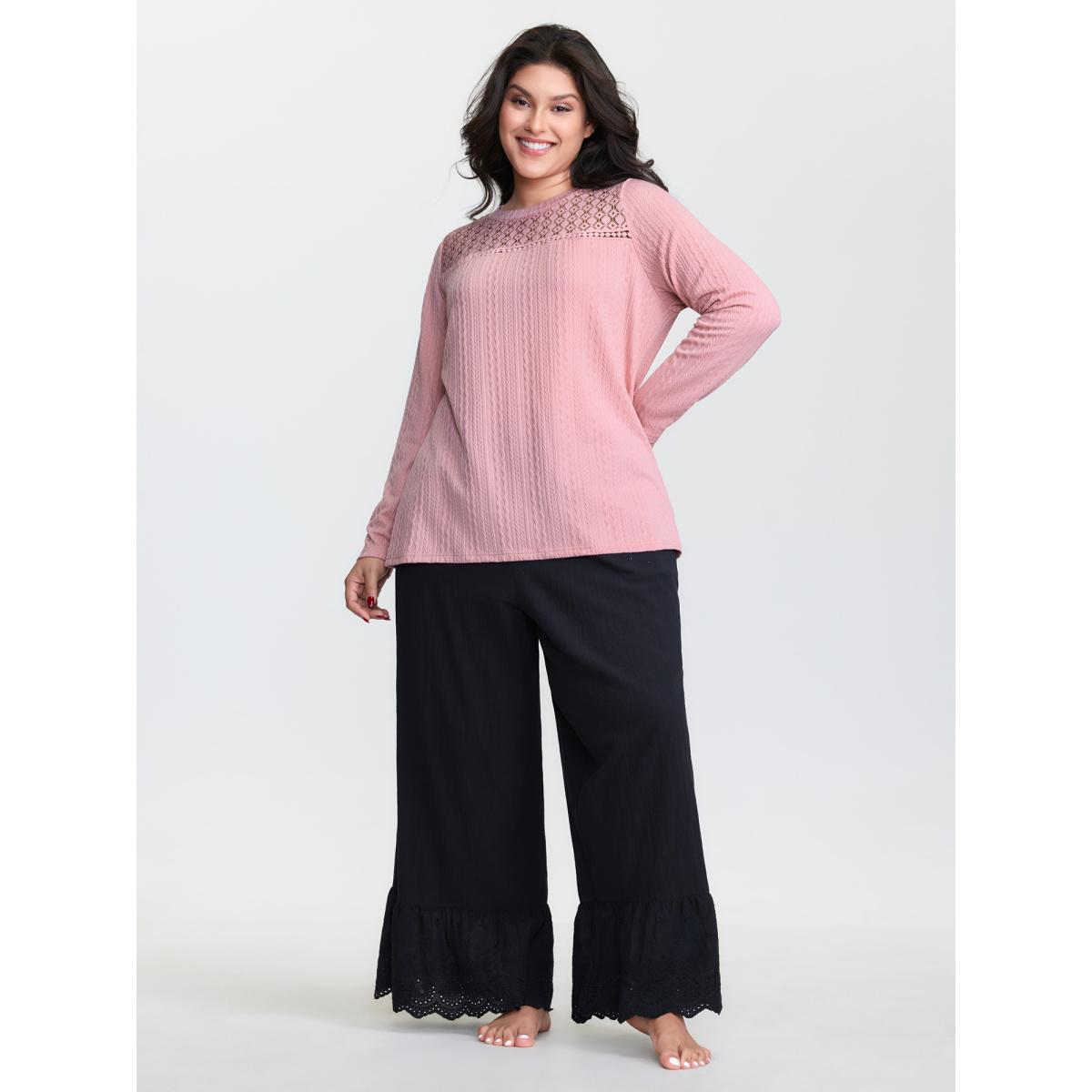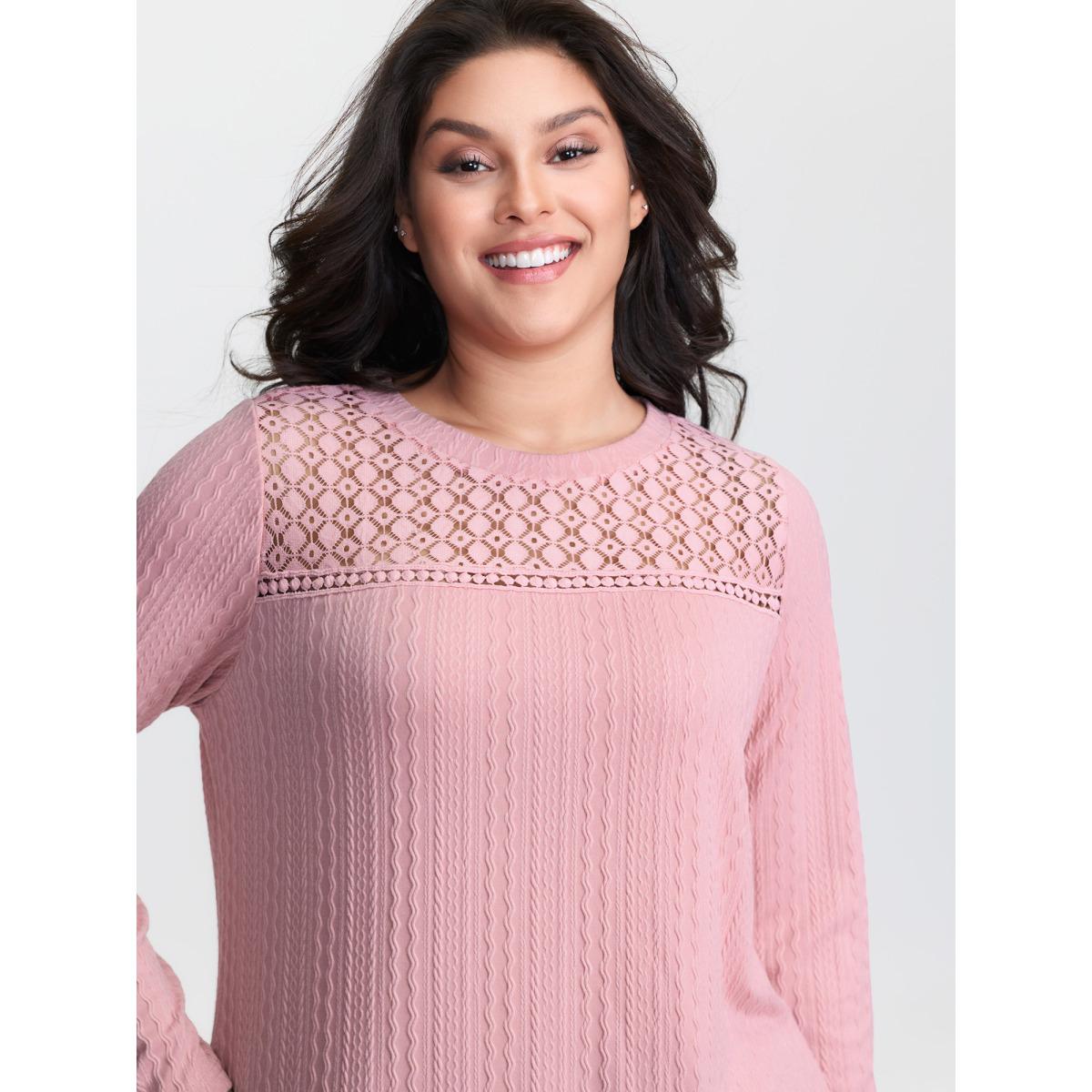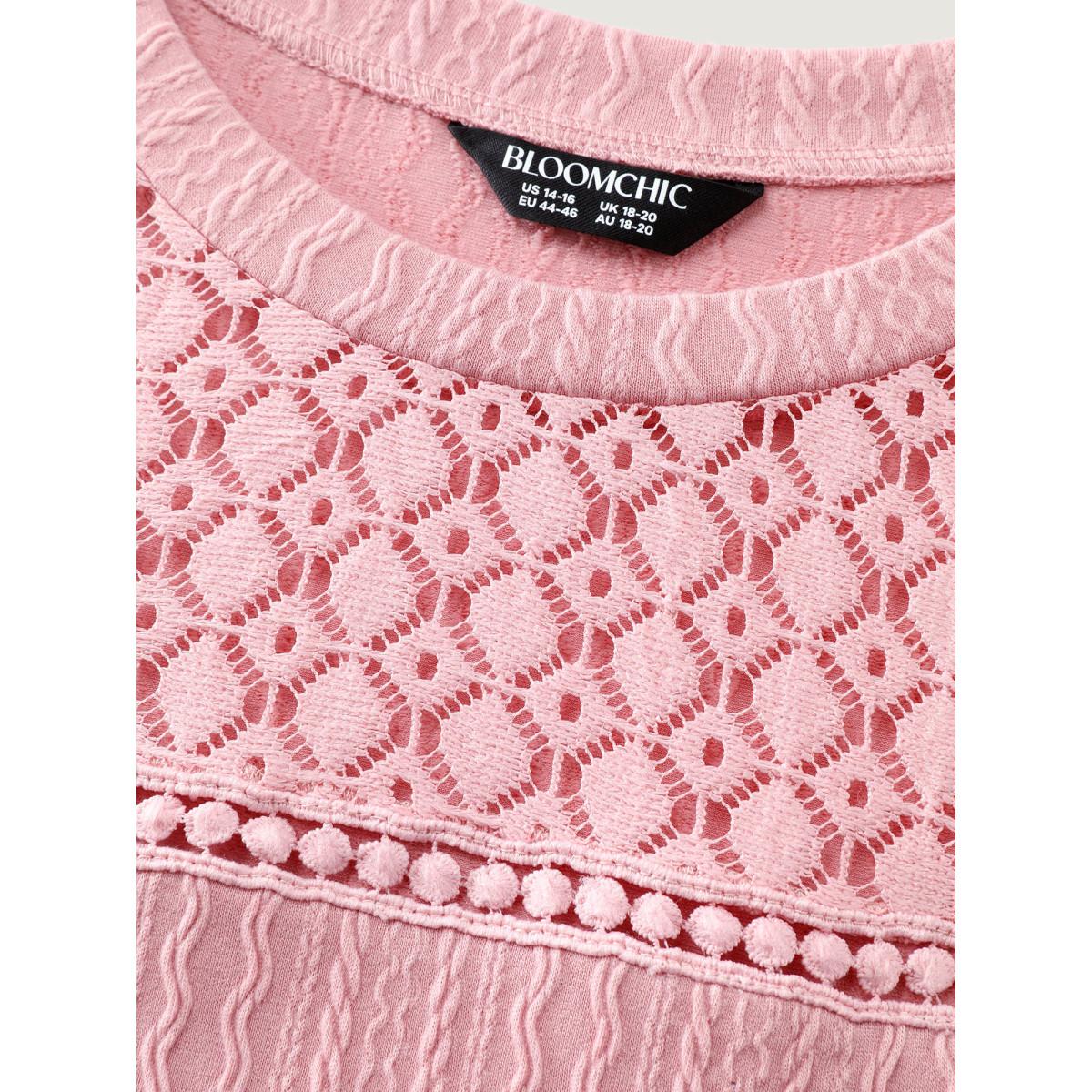 Plus Size Lace Trim Textured Cut-Out T-Shirt Lightpink Women Leisure Woven ribbon&lace trim Round Neck Casual T-shirts BloomChic 18-20/2X