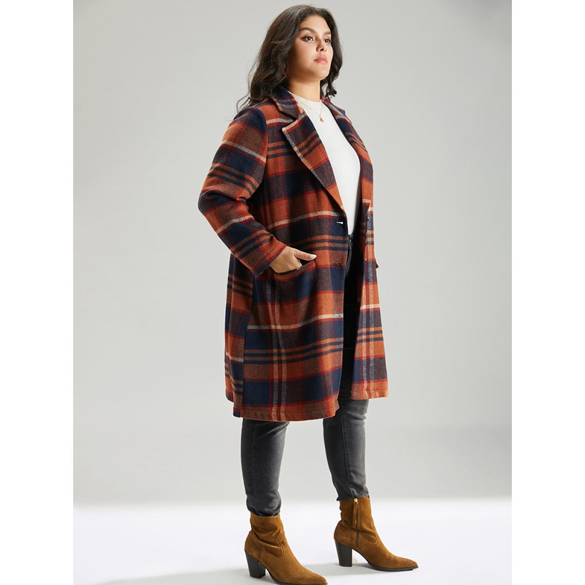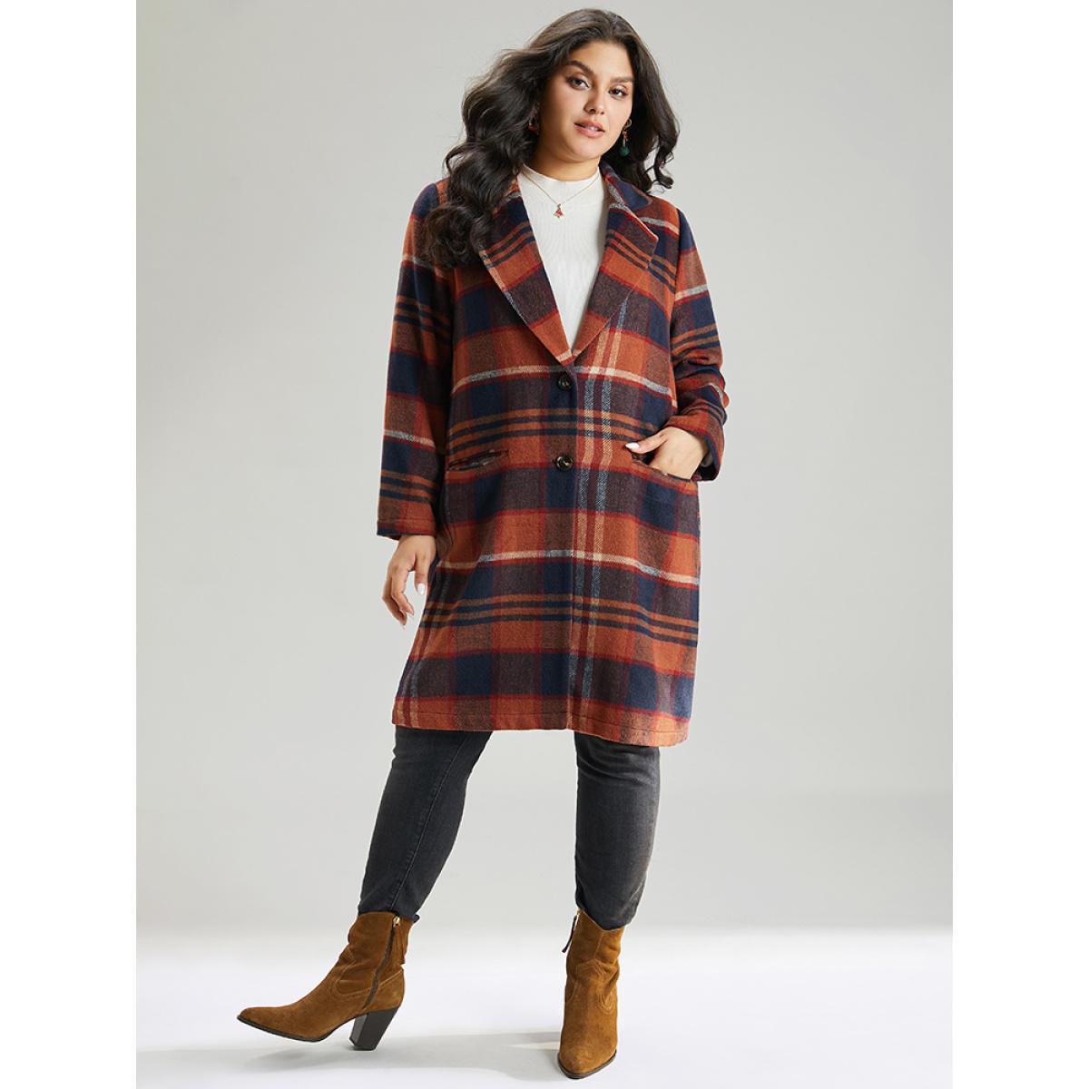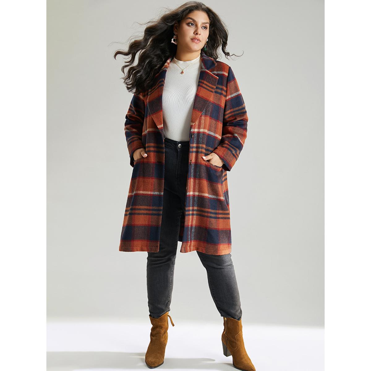 Plus Size Lapel Collar Plaid Pocket Button Up Coat Women OrangeRed Casual Contrast Ladies Dailywear Winter Coats BloomChic 28/5X