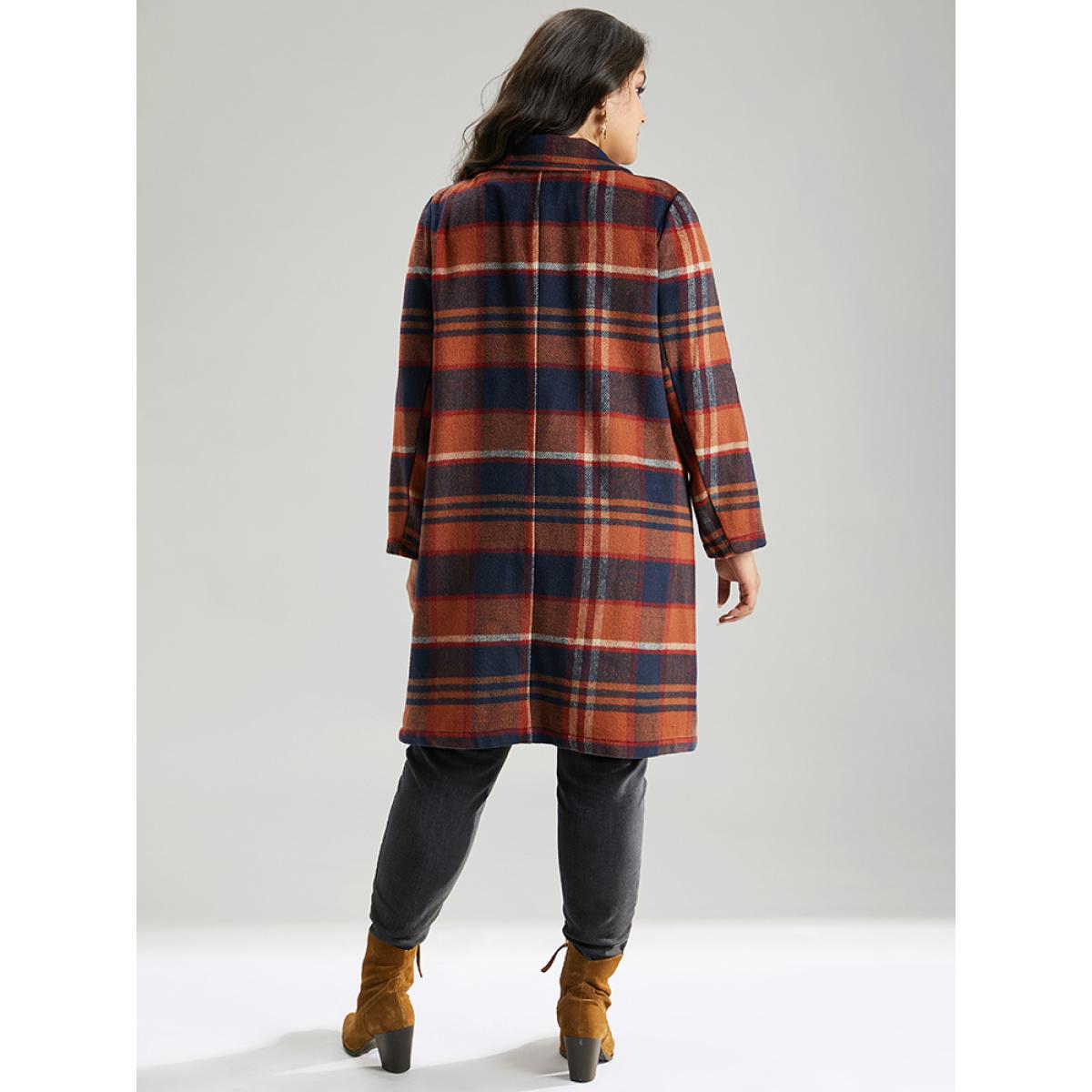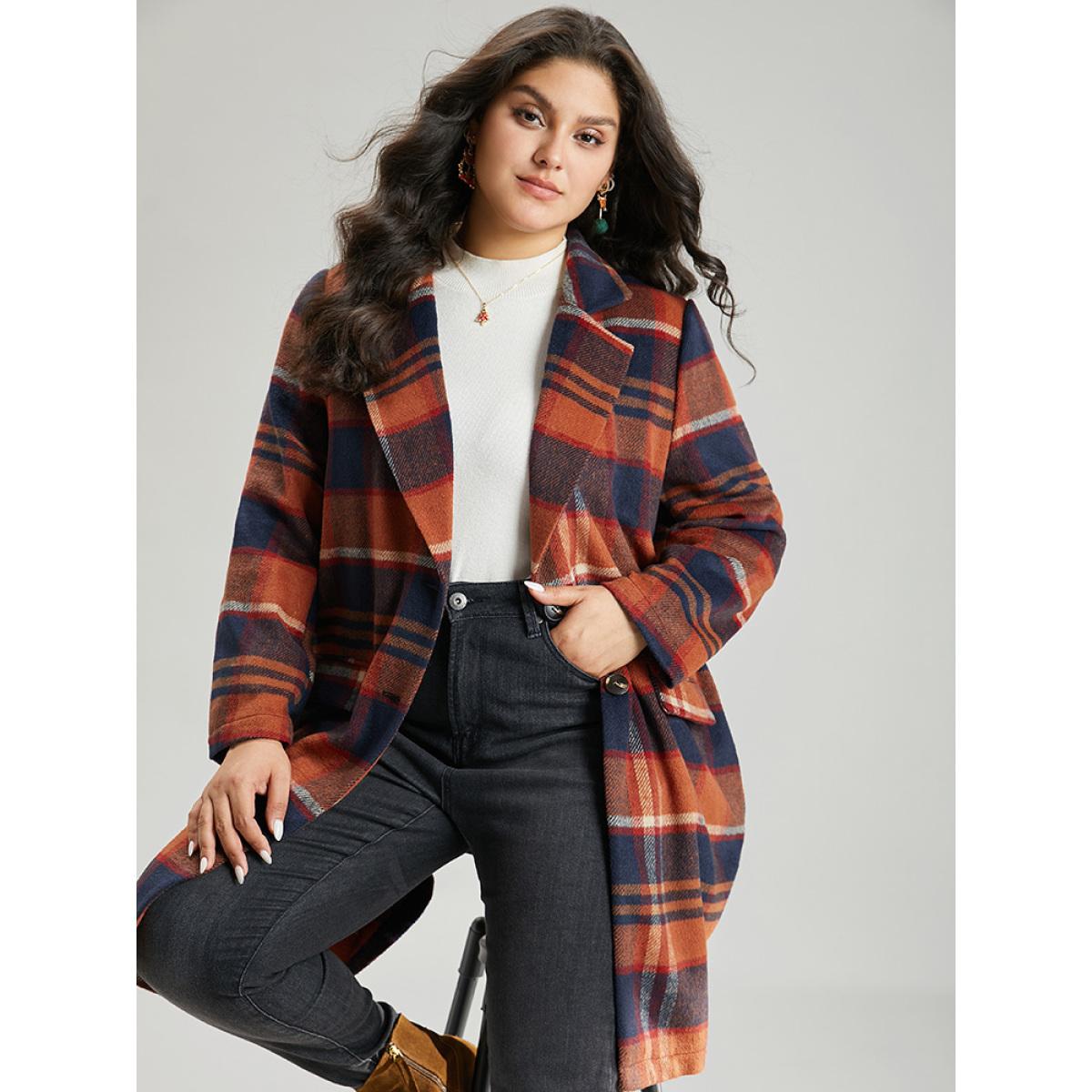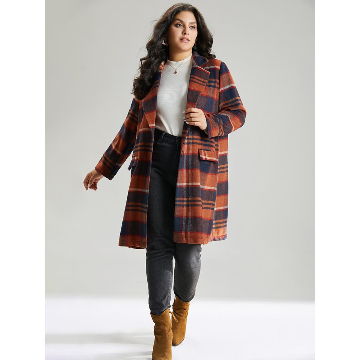 Plus Size Lapel Collar Plaid Pocket Button Up Coat Women OrangeRed Casual Contrast Ladies Dailywear Winter Coats BloomChic 28/5X